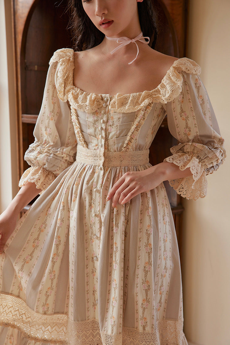 The neckline features a sweet retro lace design that adds a feminine flair, giving the dress a playful yet refined vibe. Plus, the cuffs have delicate layered tucks that create a lovely textured look, capturing that romantic, retro charm.