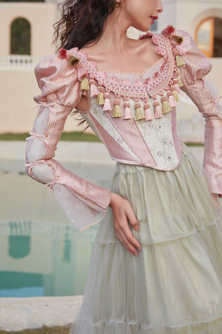 Ready to live your princess-core dreams? You need ‘Venetian Elf Palace’. This breathtaking two-piece set is what fairytales would wear if they walked into a royal rose garden at golden hour.