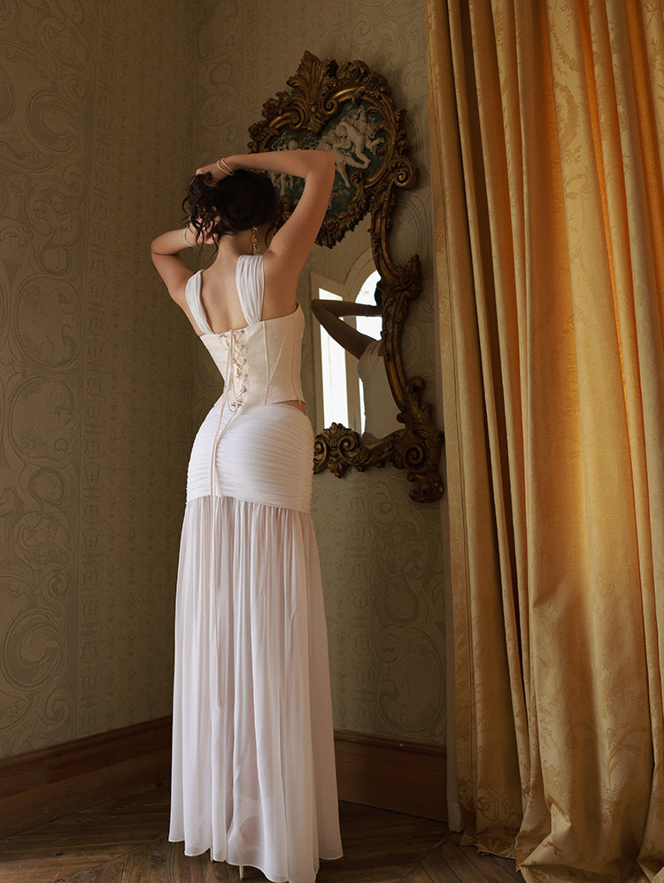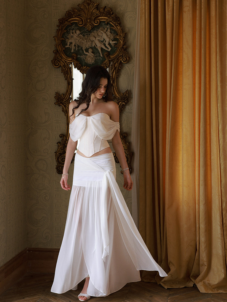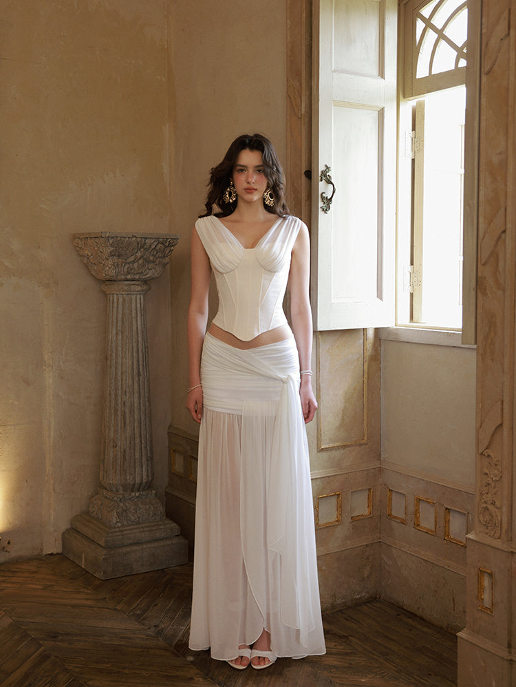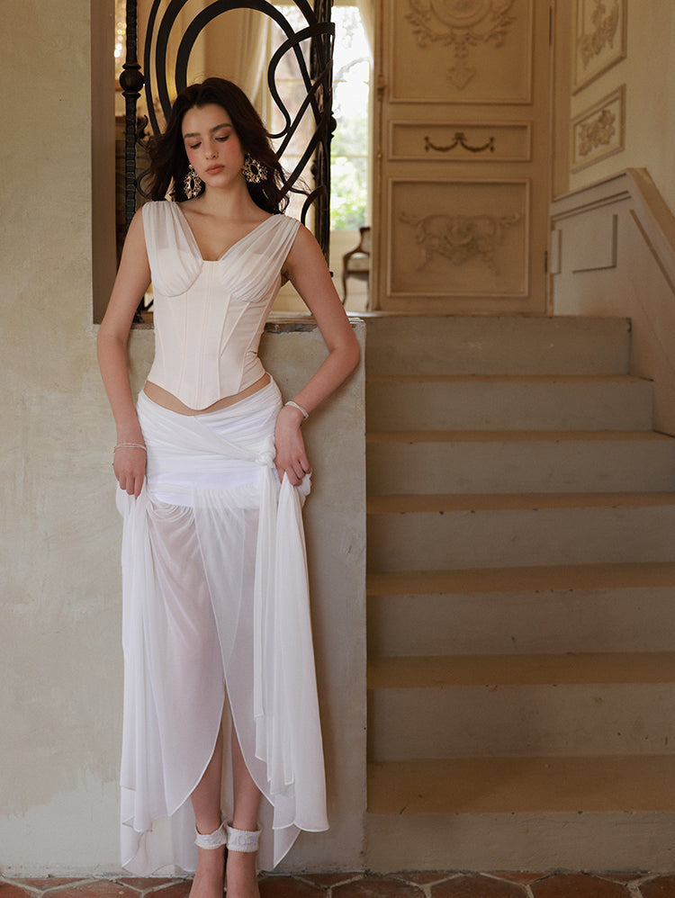 You’re going to love this: the sculpted waistline gives that effortless hourglass shape while still feeling soft and comfy all day. The skirt sits low on the hips and falls into softly gathered chiffon pleats, made from a silky fabric that feels featherlight and breathable. The uneven hem sways with every step, catching the light just enough to reveal a delicate sheerness — teasing, elegant, and totally captivating.