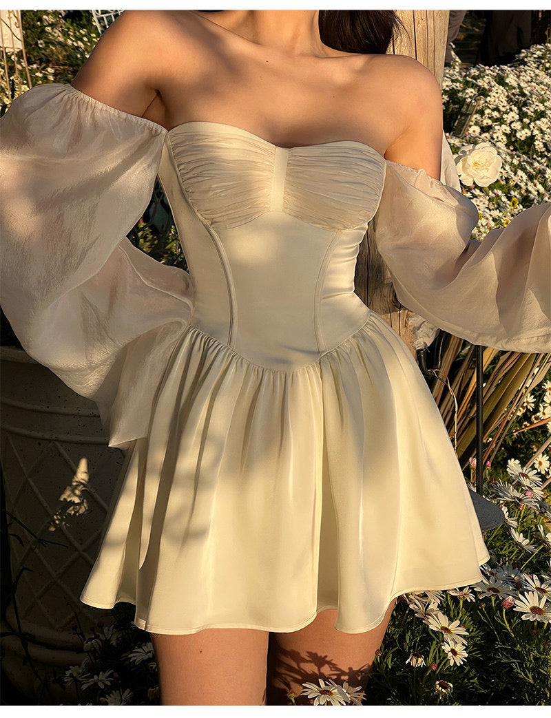 We’ve built in our signature fishbone design, arranged in an inverted V to support and define your shape while keeping things comfortable and lightweight. The structure hugs gently, drawing the eye inward to create a slimming, sculpted effect—honestly, you’ll feel snatched in the best way. The puff sleeves, made from airy organza, are gathered for volume and tied with adjustable cuffs—playful, charming, and perfectly practical. The A-line skirt flares just enough to feel romantic without being too precious.