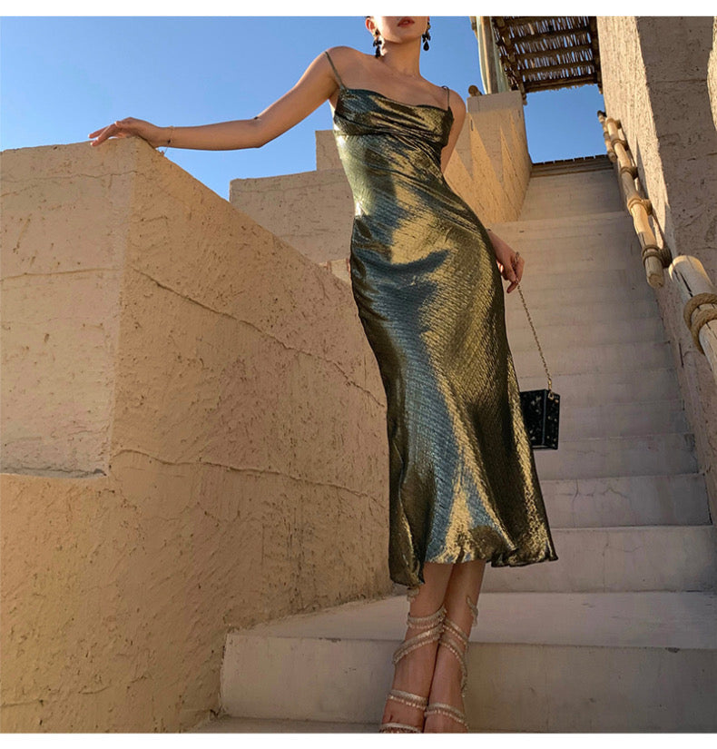 Together, the fabric and design evoke a visual masterpiece, reminiscent of a river of stars flowing gently across a quiet night sky. This piece is ideal for a romantic sunset date, where its luminous beauty will surely capture the moment.