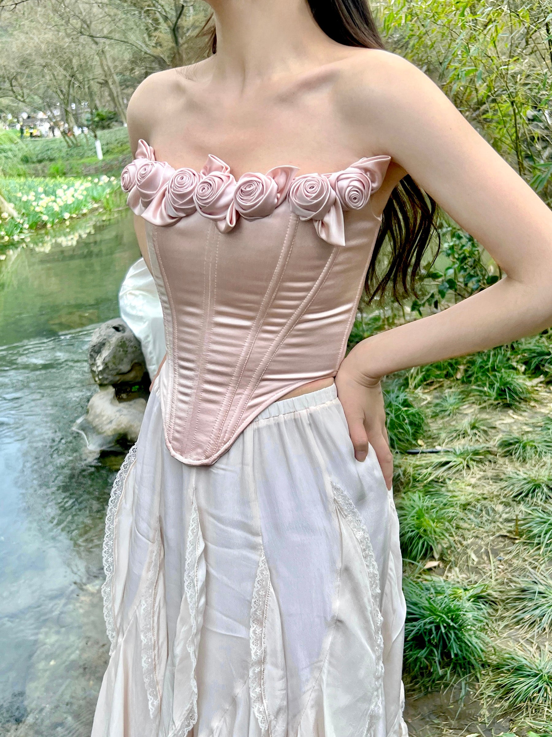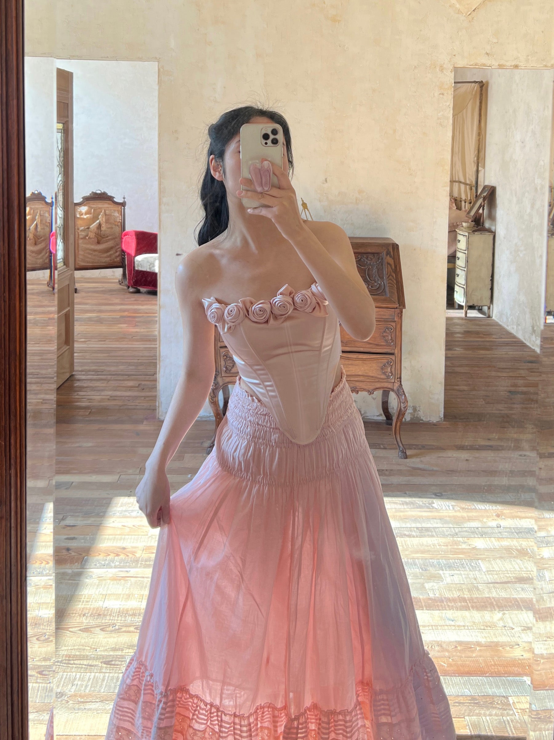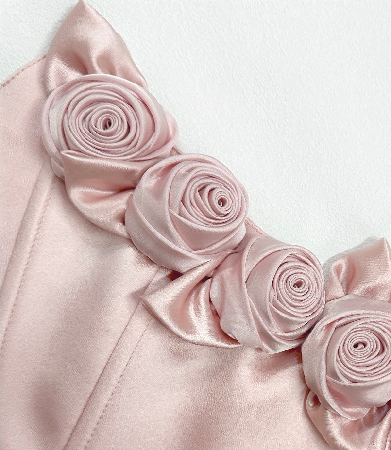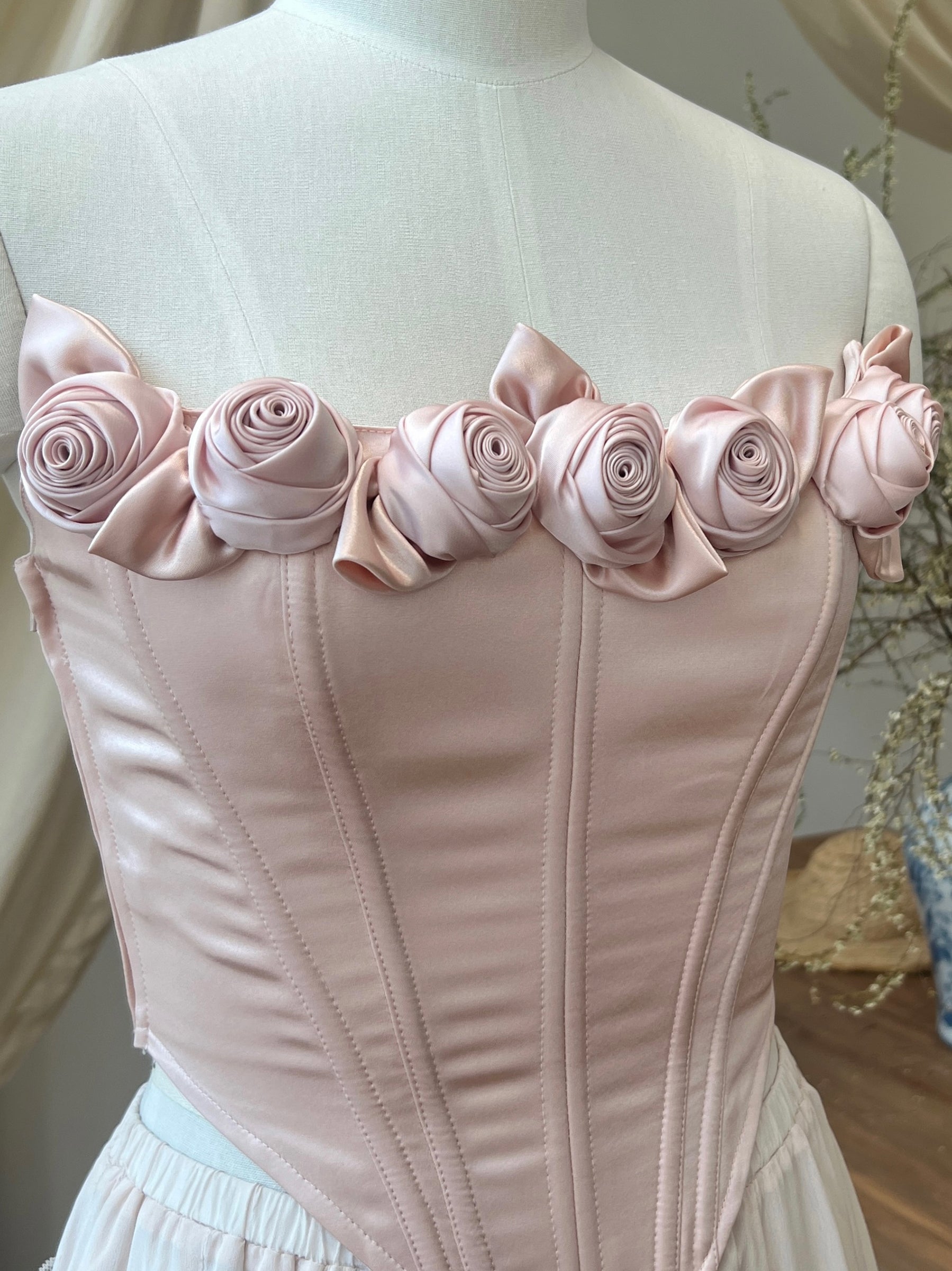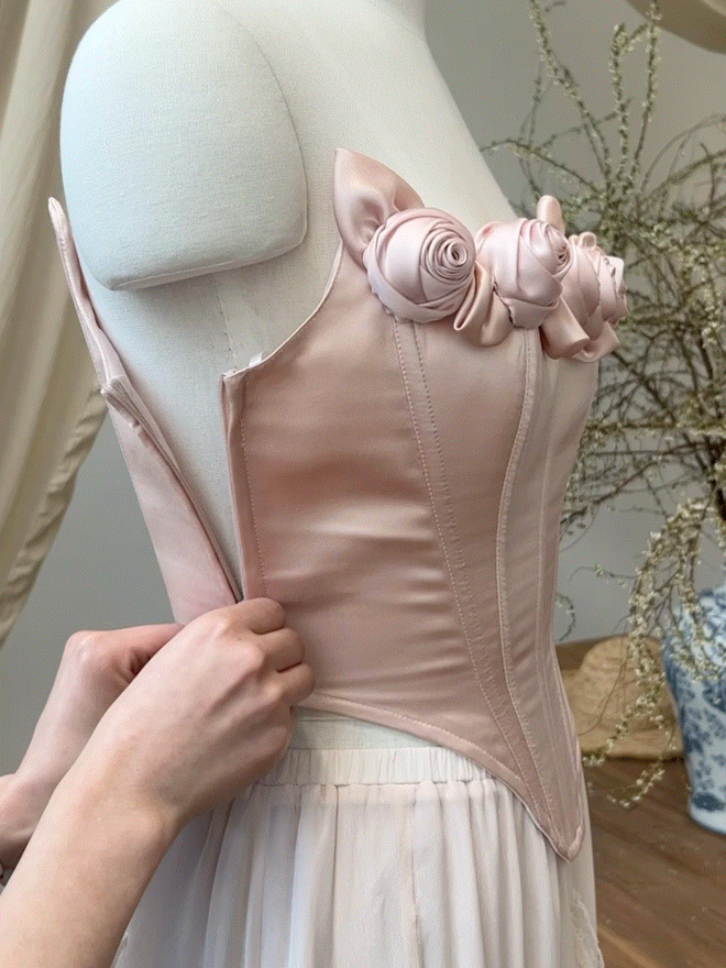 The hem dips softly at the front and rises at the sides for a slimming effect, while the side zip and our signature lace-up back make dressing effortless. We couldn’t resist adding a romantic touch – the neckline blooms with a bouquet of seven handmade roses and delicate leafy details, each one a tiny work of art that makes ‘Ebony’ feel like a fairytale.