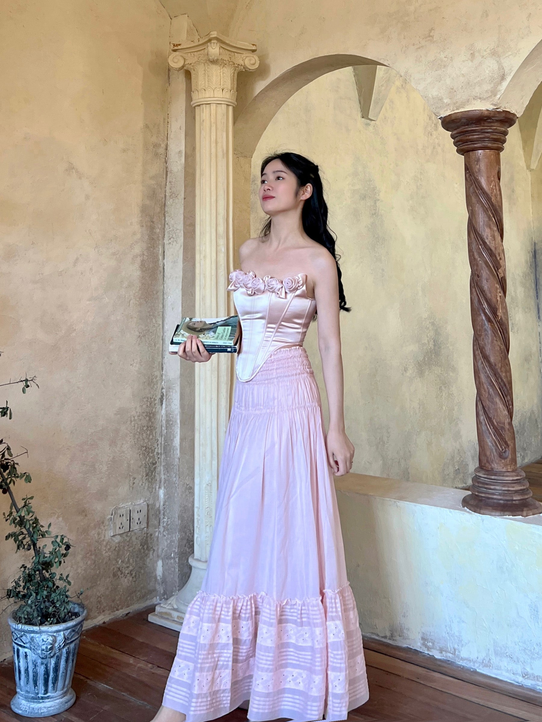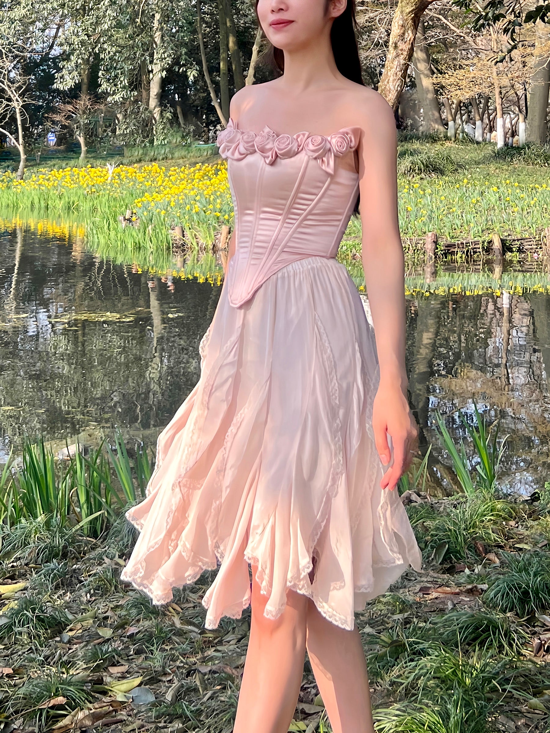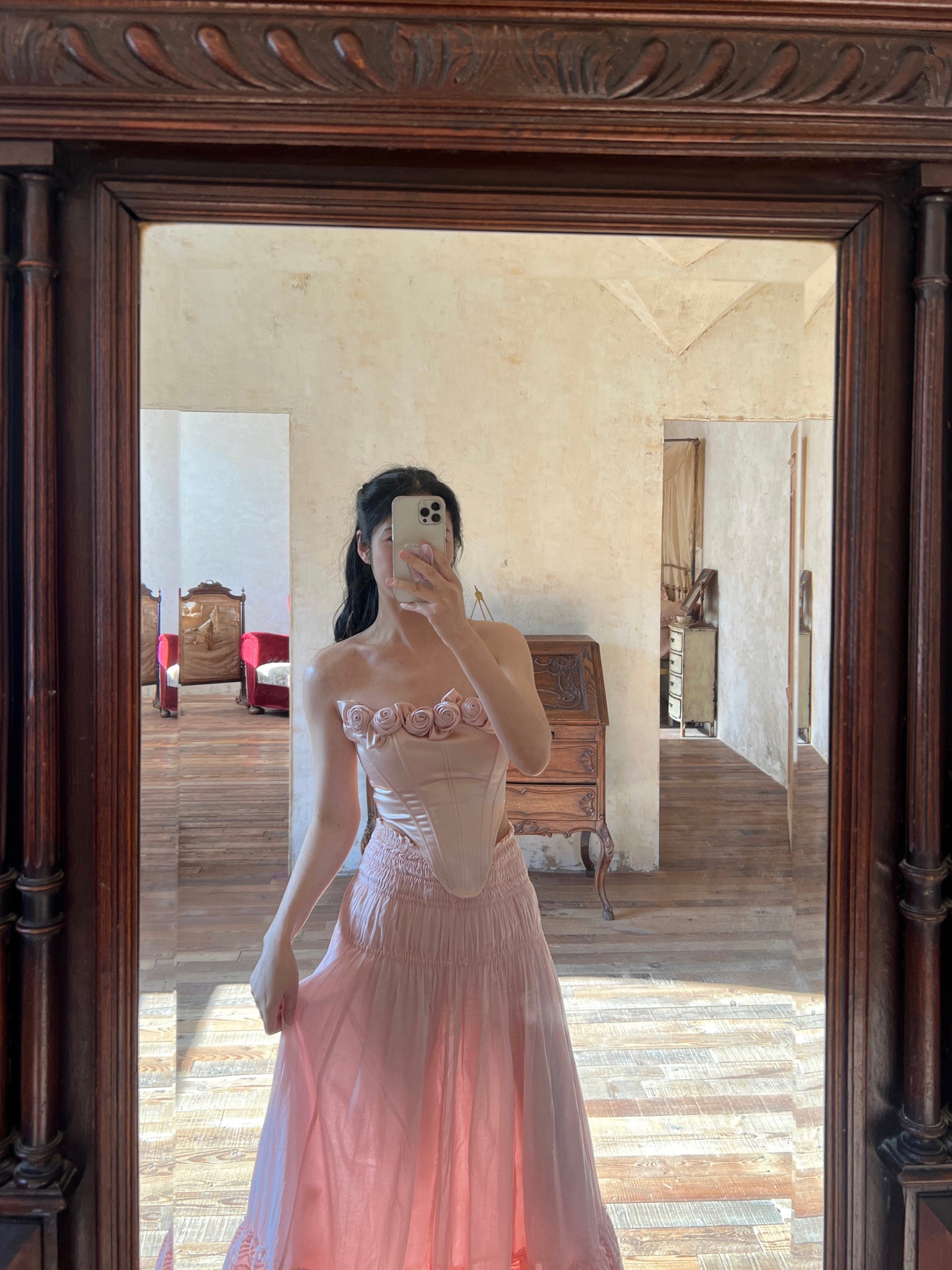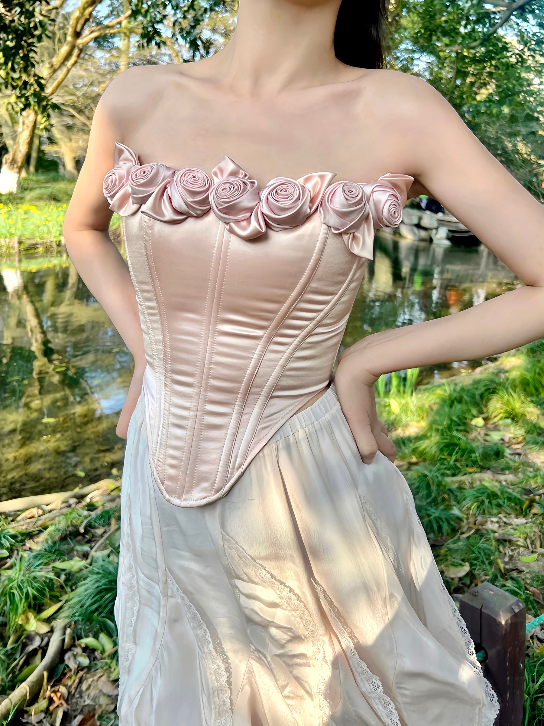 The hem dips softly at the front and rises at the sides for a slimming effect, while the side zip and our signature lace-up back make dressing effortless. We couldn’t resist adding a romantic touch – the neckline blooms with a bouquet of seven handmade roses and delicate leafy details, each one a tiny work of art that makes ‘Ebony’ feel like a fairytale.