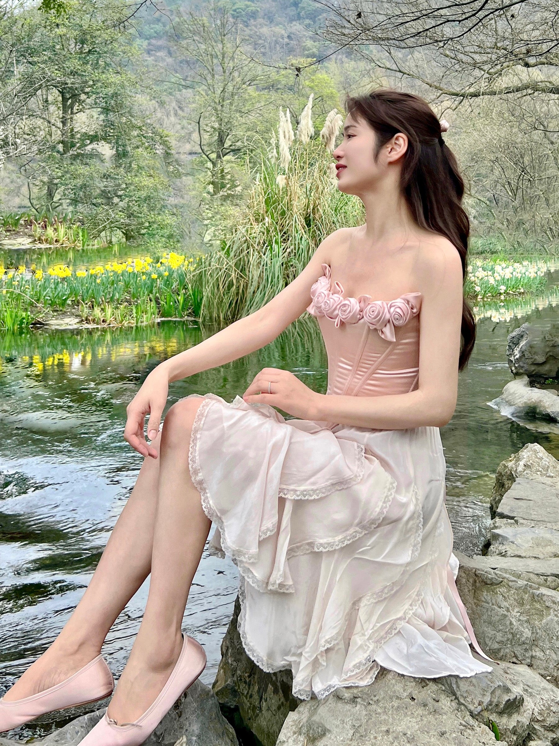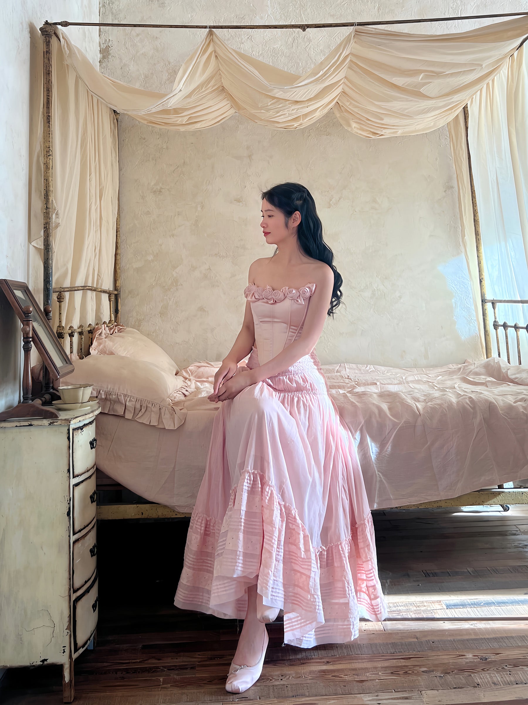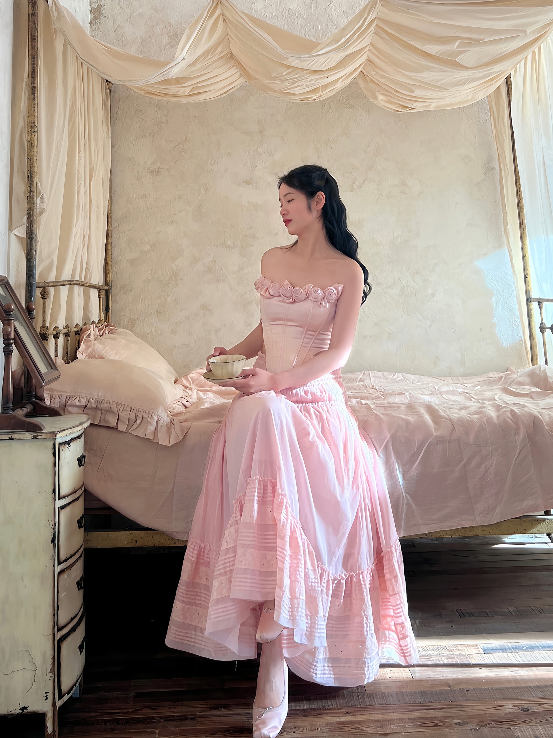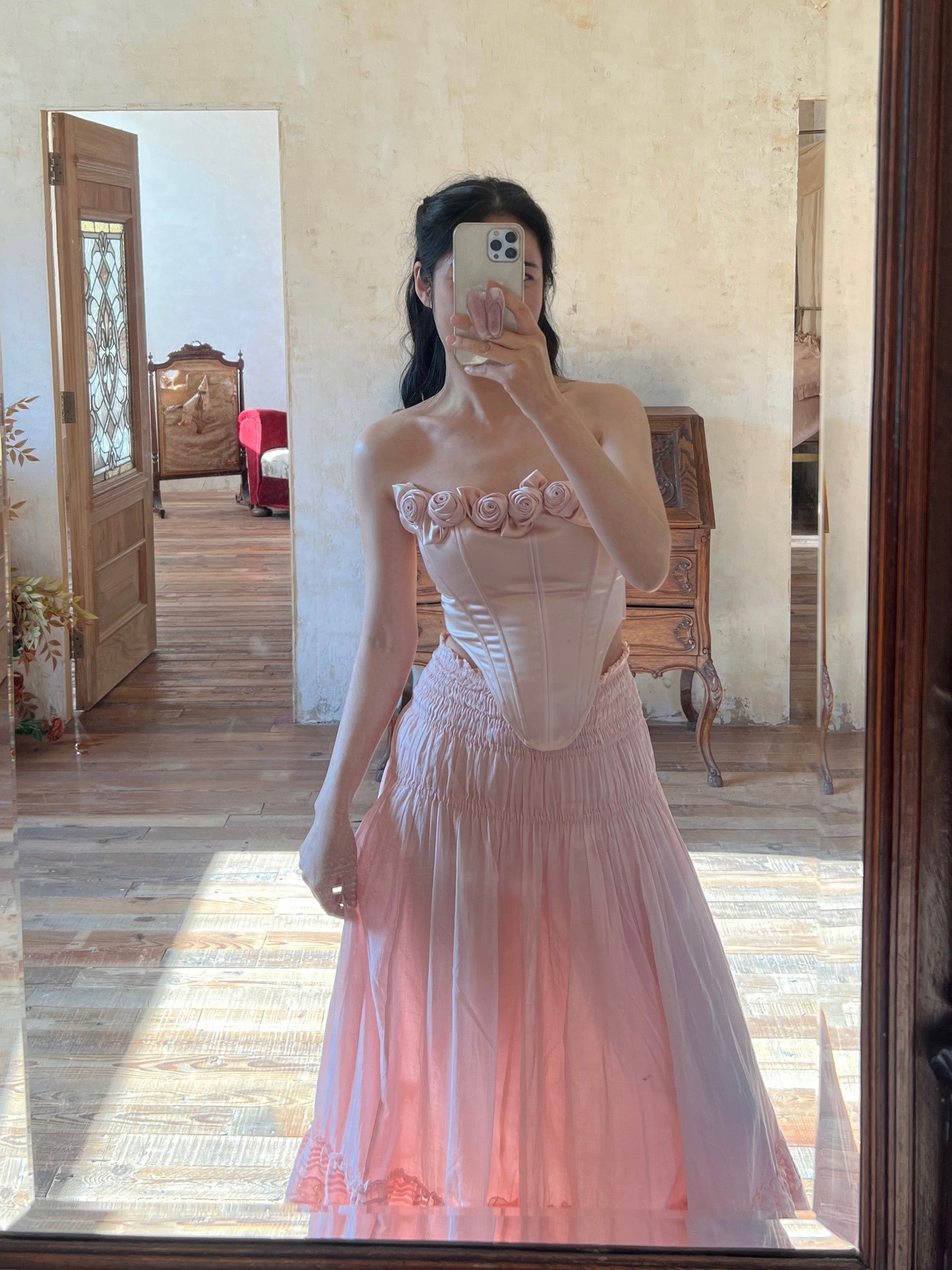 The hem dips softly at the front and rises at the sides for a slimming effect, while the side zip and our signature lace-up back make dressing effortless. We couldn’t resist adding a romantic touch – the neckline blooms with a bouquet of seven handmade roses and delicate leafy details, each one a tiny work of art that makes ‘Ebony’ feel like a fairytale.