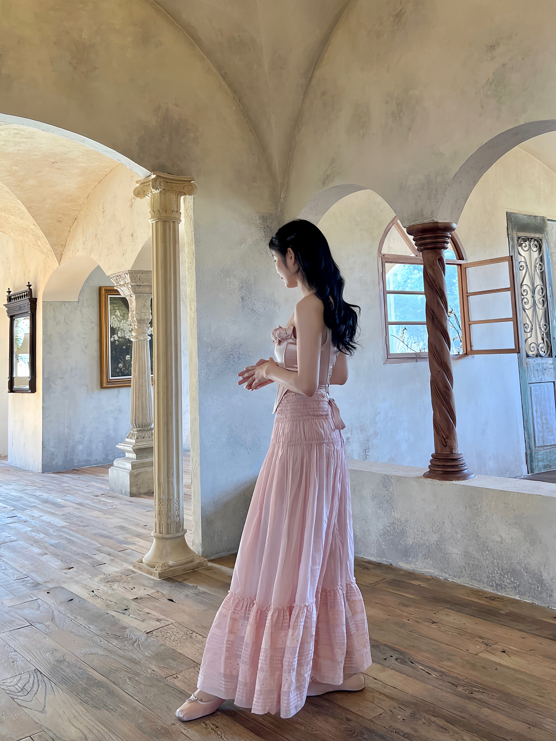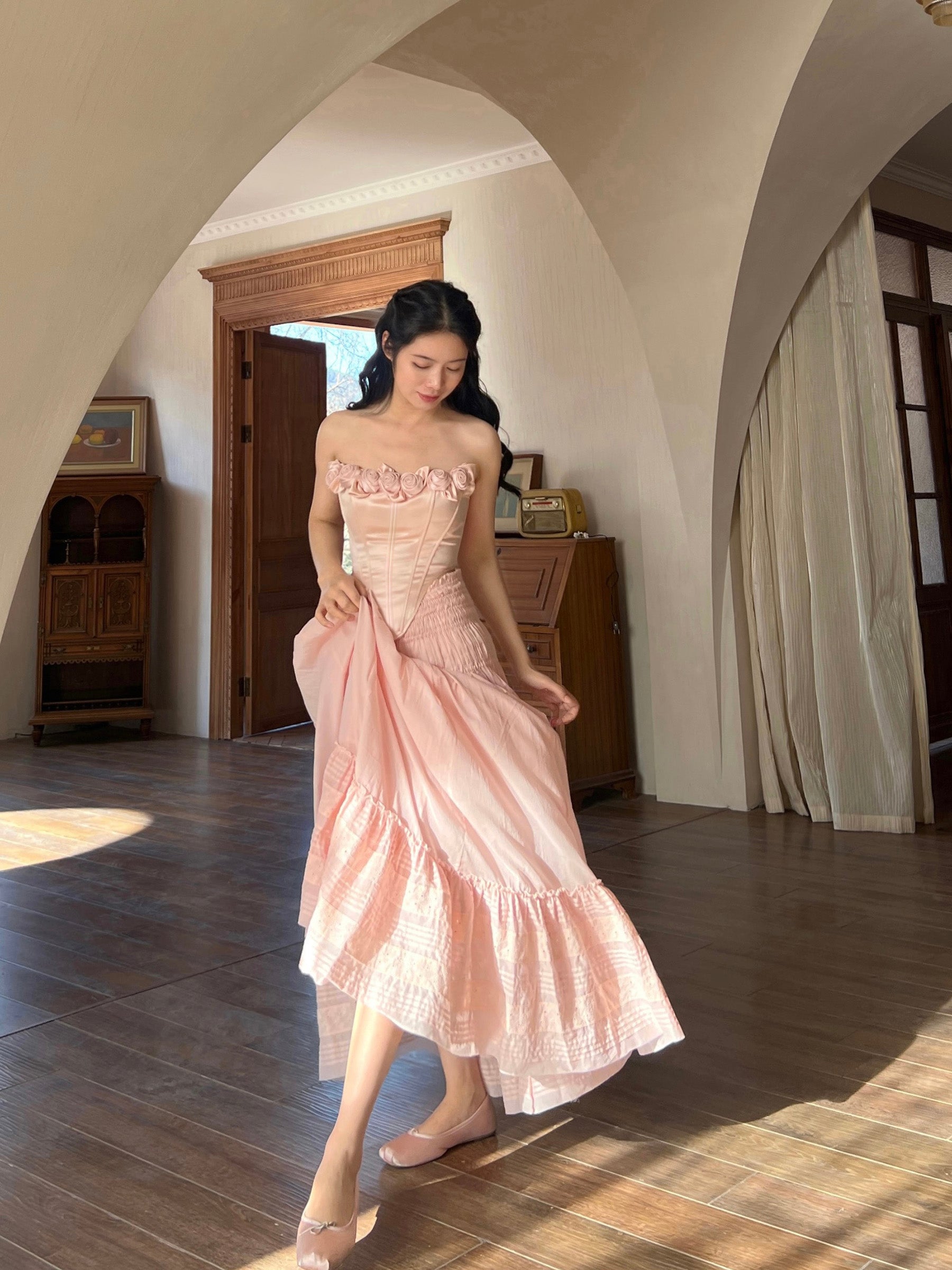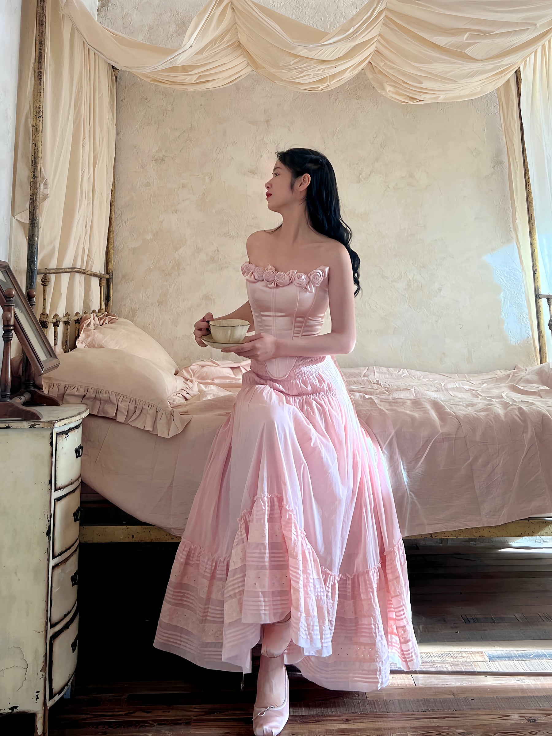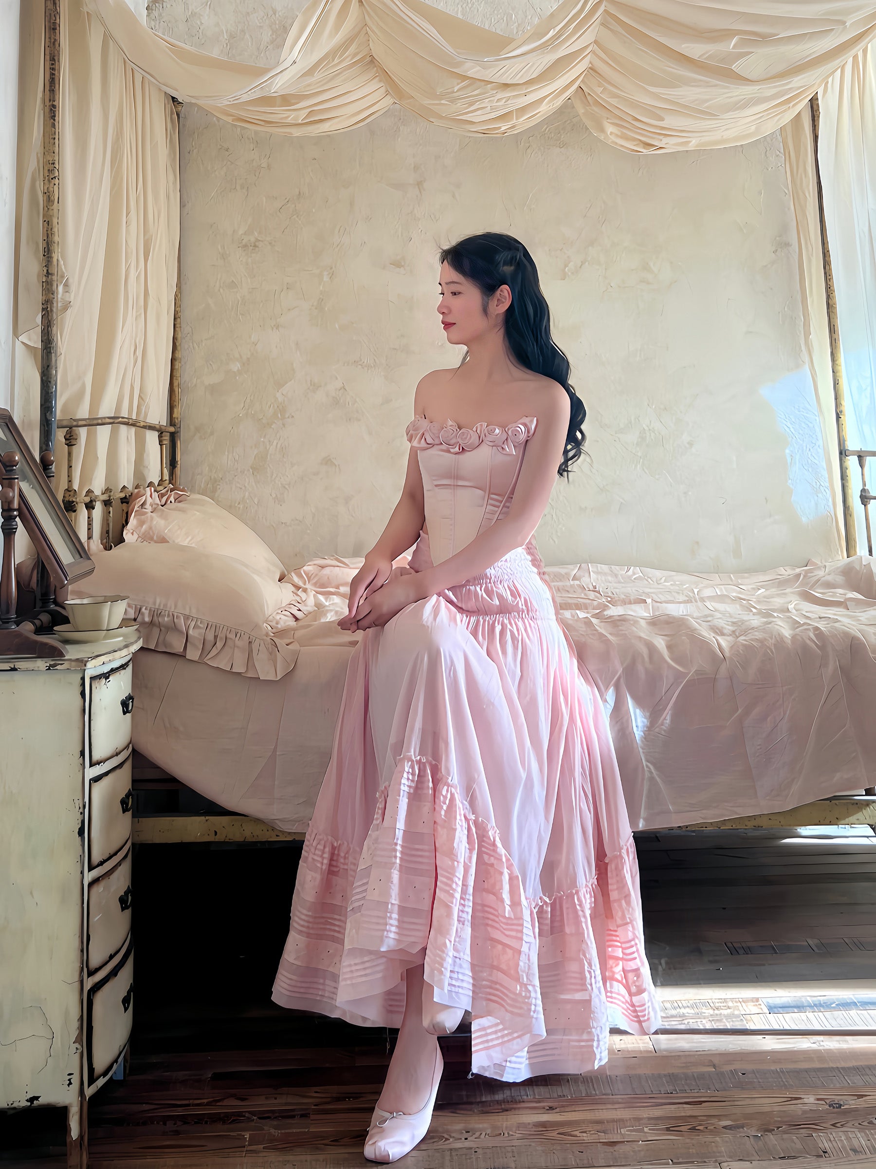 The hem dips softly at the front and rises at the sides for a slimming effect, while the side zip and our signature lace-up back make dressing effortless. We couldn’t resist adding a romantic touch – the neckline blooms with a bouquet of seven handmade roses and delicate leafy details, each one a tiny work of art that makes ‘Ebony’ feel like a fairytale.