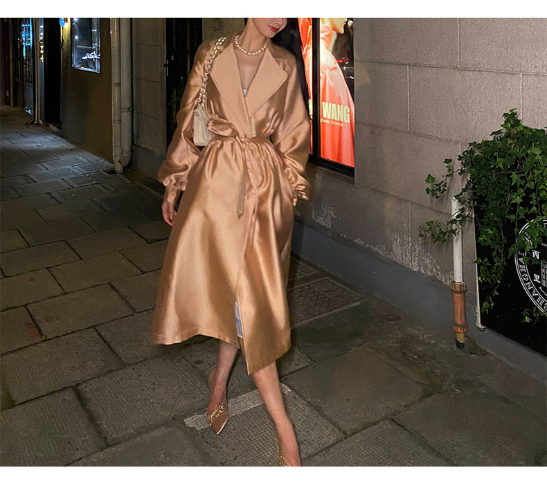 Our Champagne Rose Gold shade glows like moonlight over the sea – soft, warm, and quietly luxurious. It comes with a matching self-tie belt to keep the look harmonious and refined.