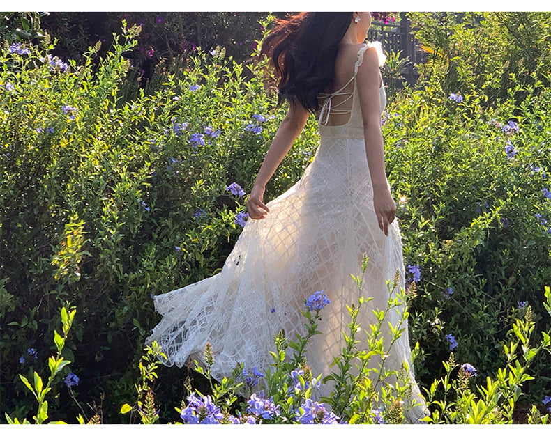 Adorned with delicate eyelash lace at the neckline, ‘Iphigenia’ features dual-layer straps for ultimate comfort, combining a soft lace layer with sheer fabric. The charming V-neckline beautifully enhances your collarbone, inviting gentle breezes that inspire daydreams of elegance. The tailored bodice cinches at the waist, showcasing rich textures as three layers of floral lace dance together, complemented by soft apricot mesh lining that adds allure without sacrificing comfort.