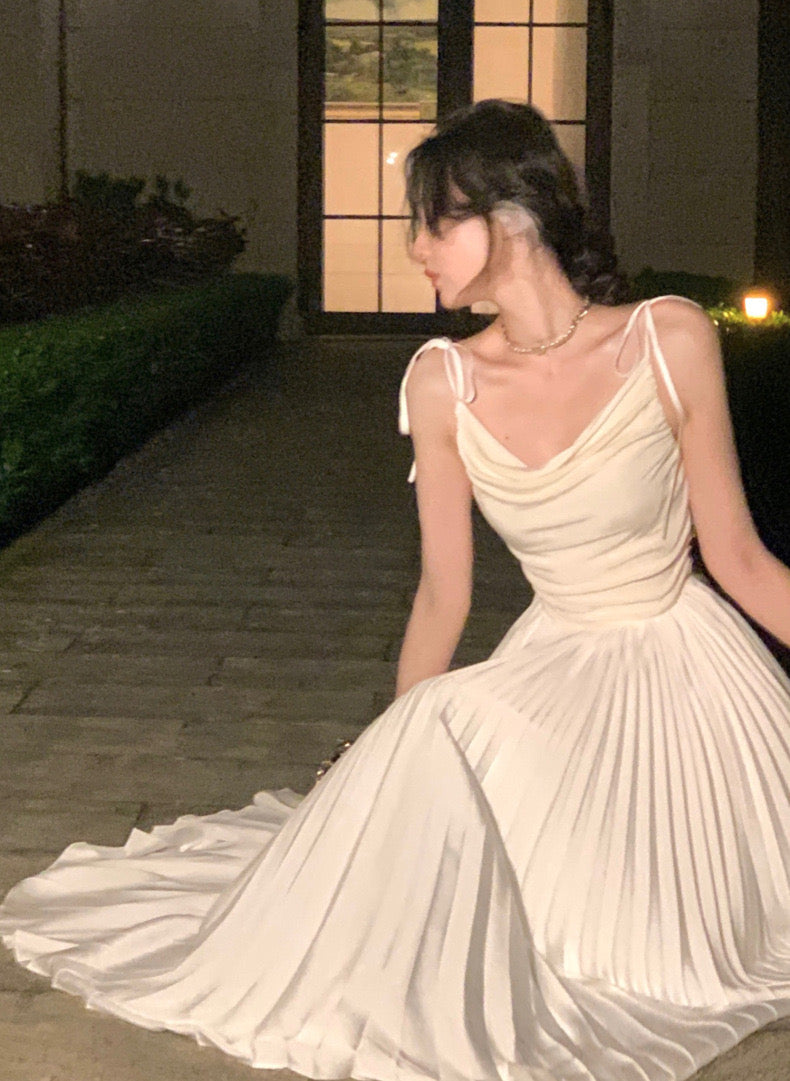 From there, the dress cinches in with fine pleats at the waist, enhanced by a clever high-waist cut that lengthens the legs and flatters the silhouette. Add a full, softly swaying skirt and suddenly you’re twirling through your best sunlit day, whether you choose the long or short version (we honestly can’t pick a favourite – can you?).