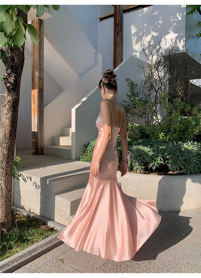 Vitani drapes like liquid silk, catching the light and highlighting your skin with a soft, radiant glow. A folded detail at the chest—understated, sculptural, and quietly luxurious, while two slim straps trace the neckline with subtle charm.