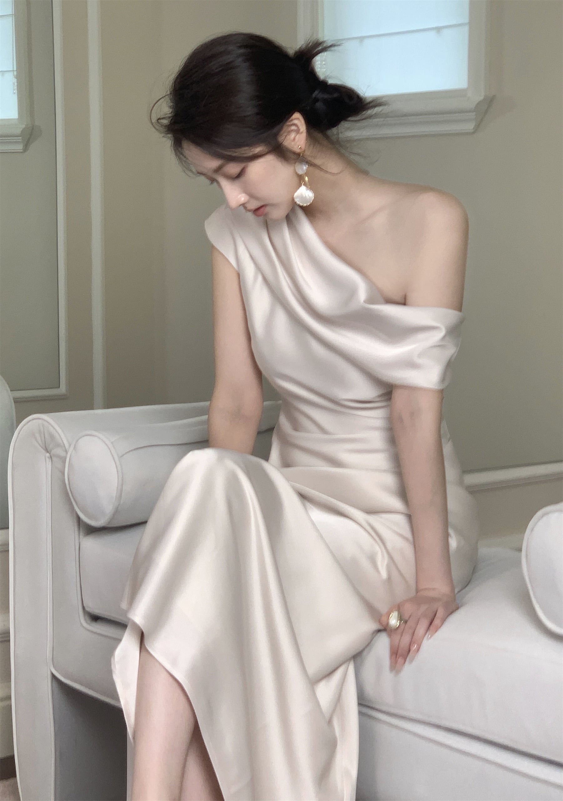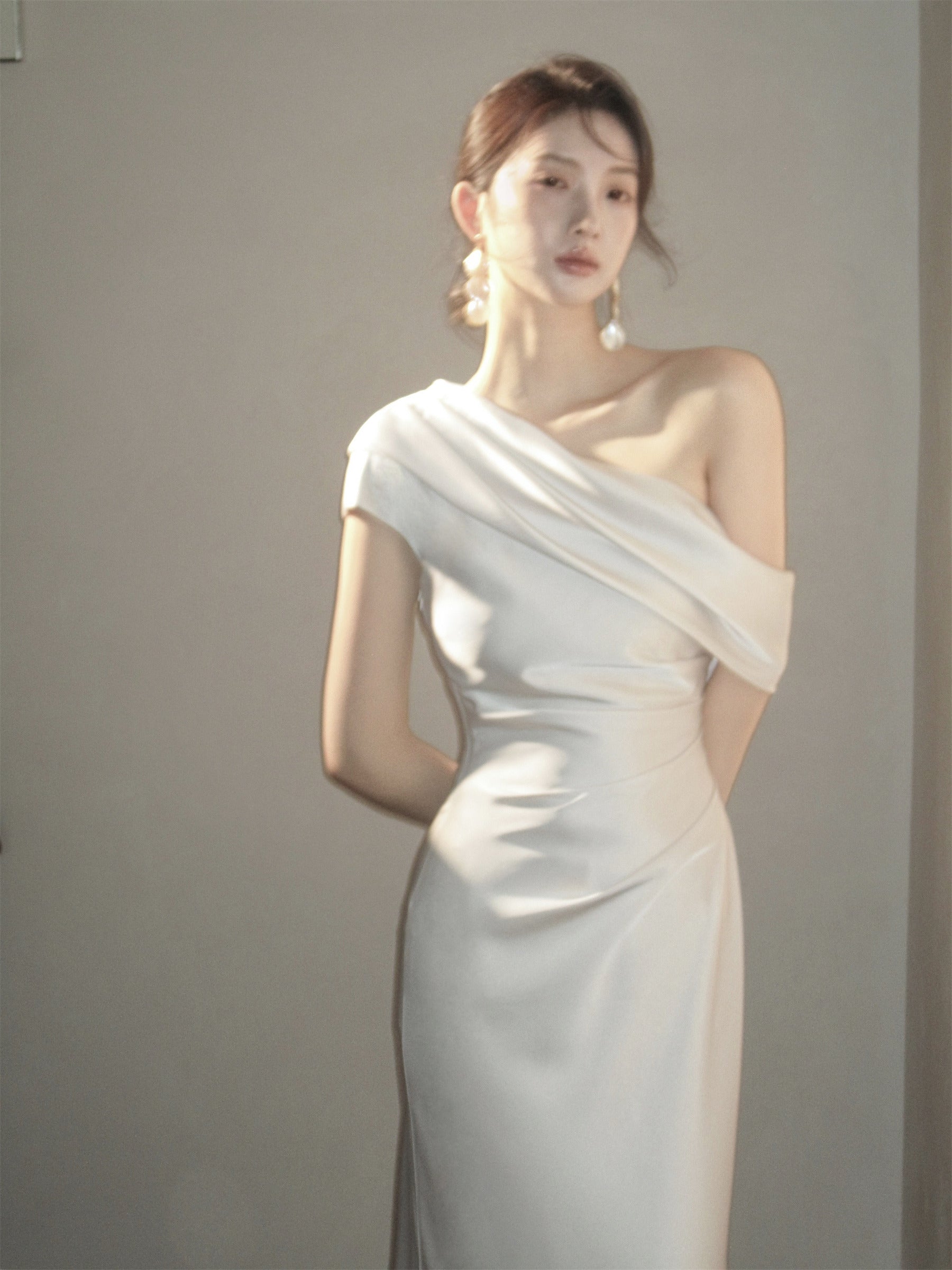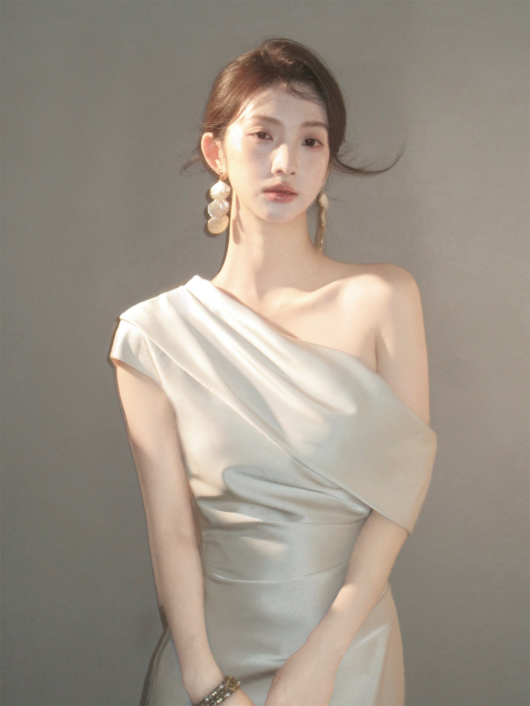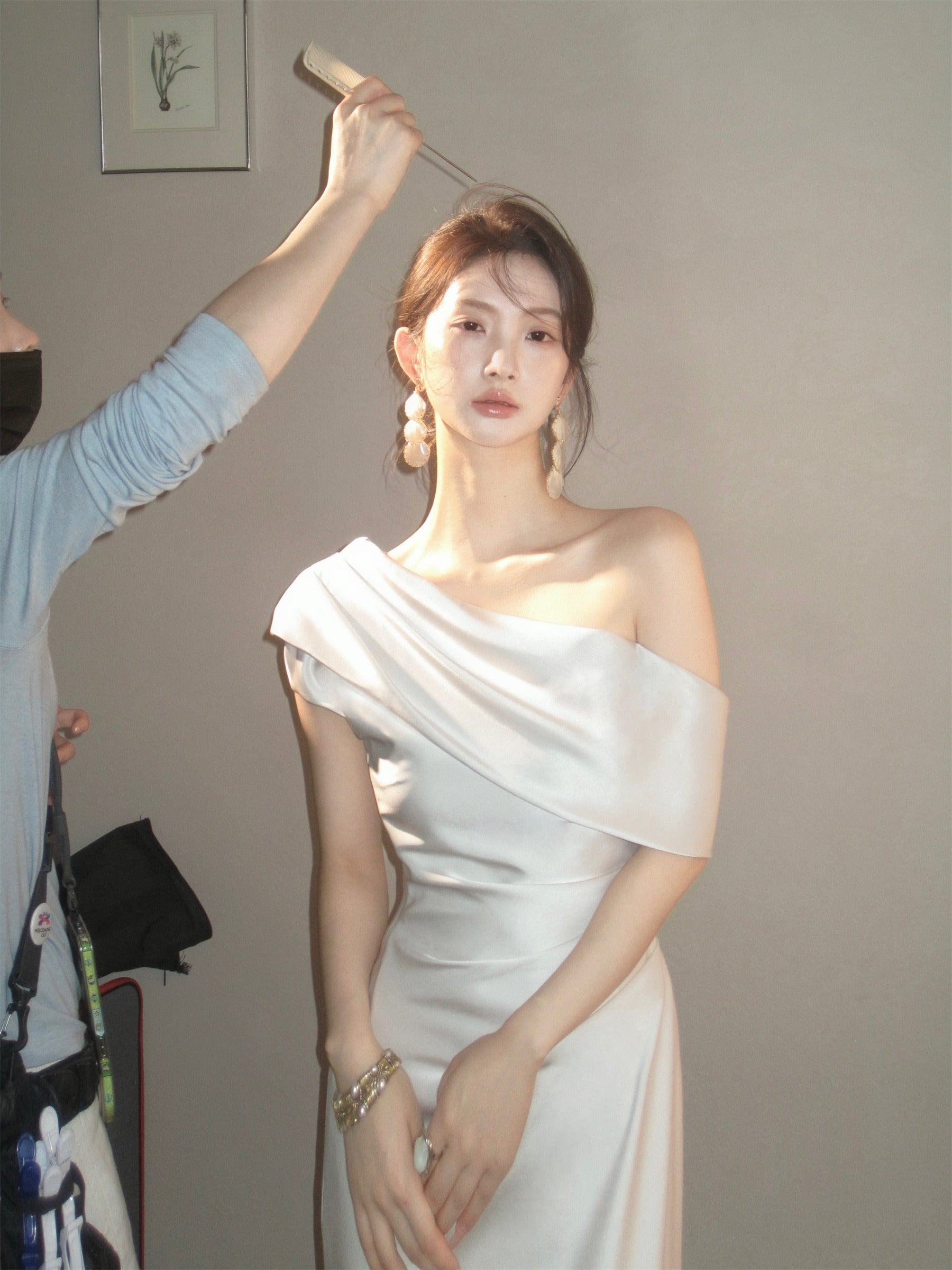 The neckline? A little daring, a lot dreamy. We call it the “dangerous 15°” — a perfectly tilted drape that falls just off the shoulder for that “just-about-to-slip” look, but don’t worry, it stays put. After three rounds of pattern adjustments, you can move, lift, dance, and lean without a single slip.