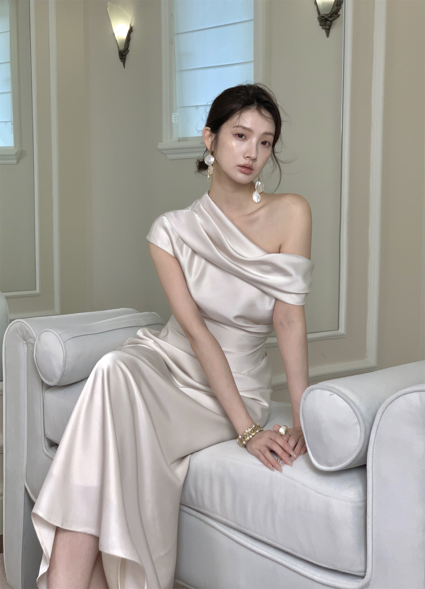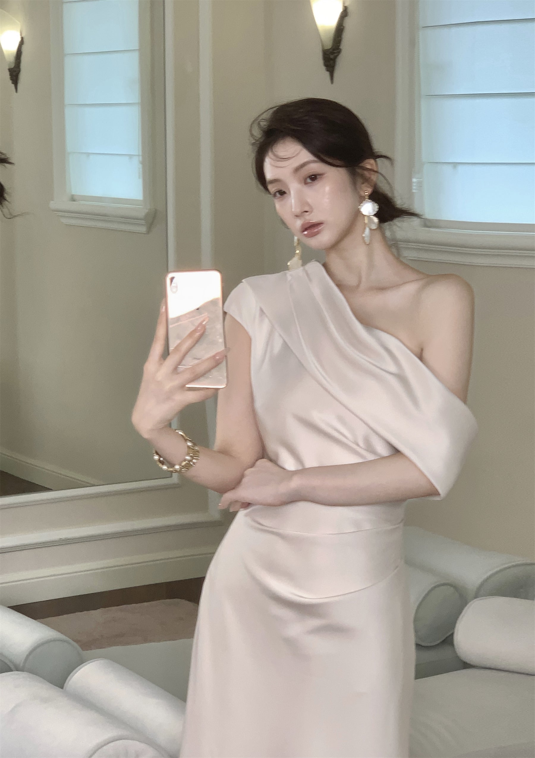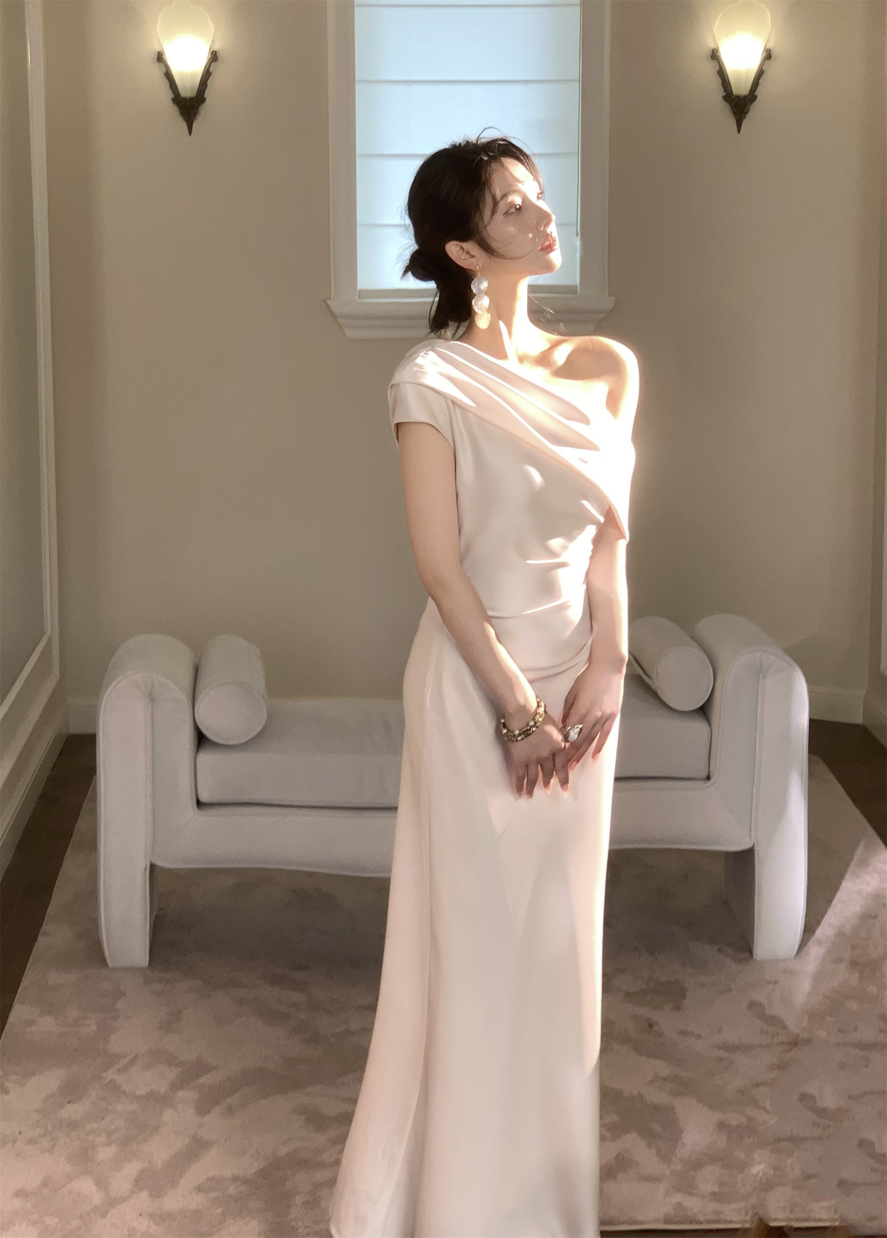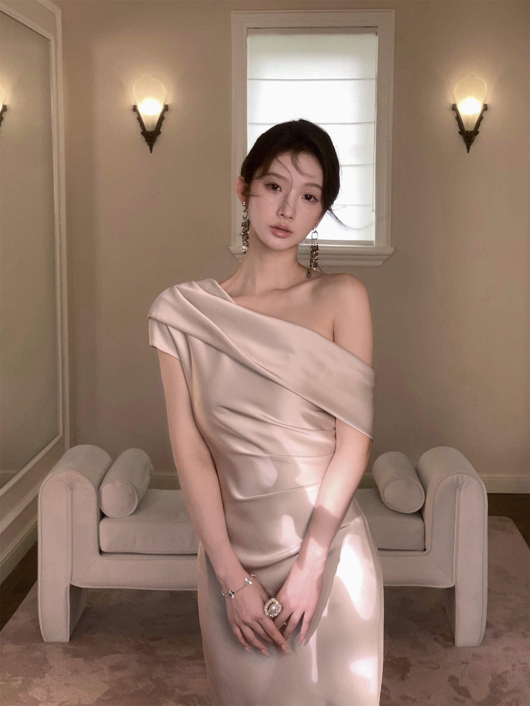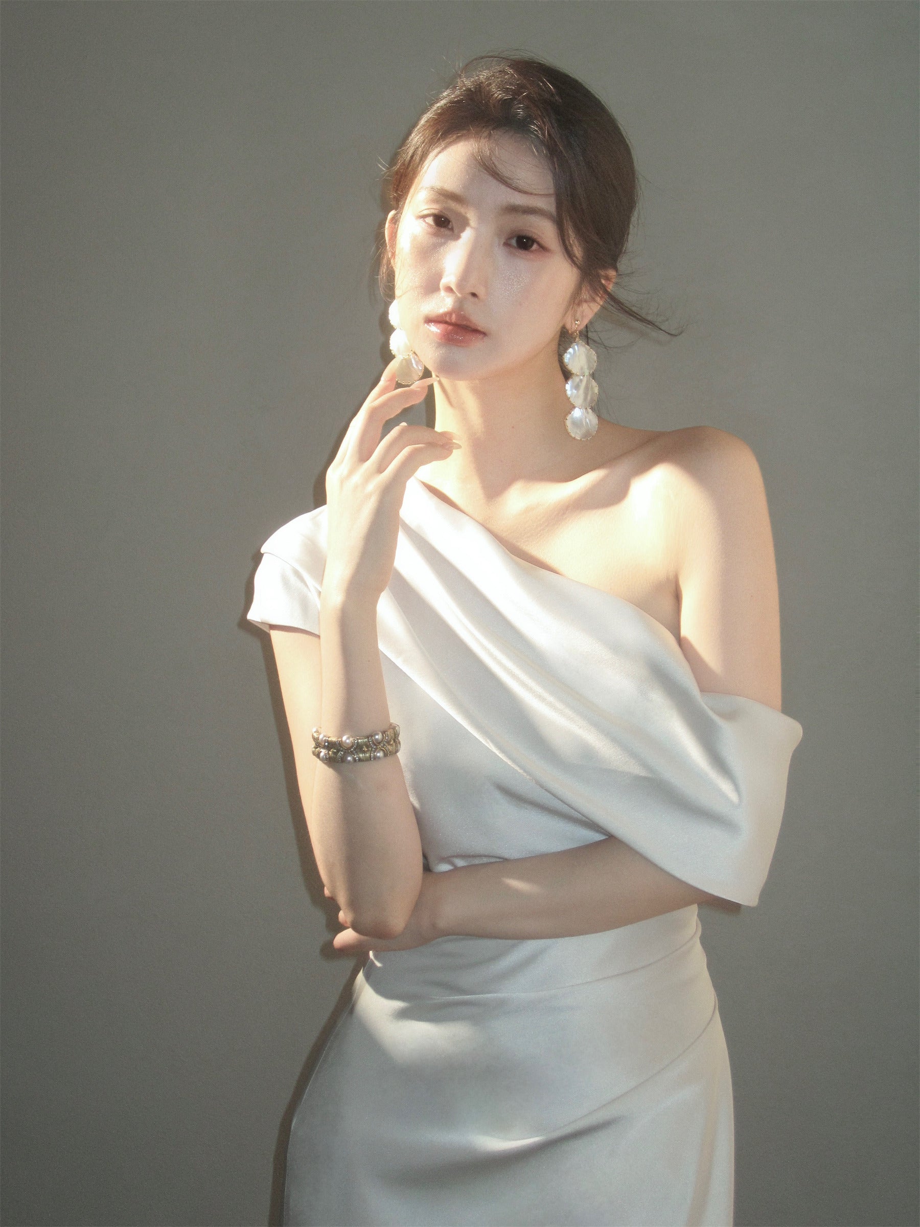 The neckline? A little daring, a lot dreamy. We call it the “dangerous 15°” — a perfectly tilted drape that falls just off the shoulder for that “just-about-to-slip” look, but don’t worry, it stays put. After three rounds of pattern adjustments, you can move, lift, dance, and lean without a single slip.