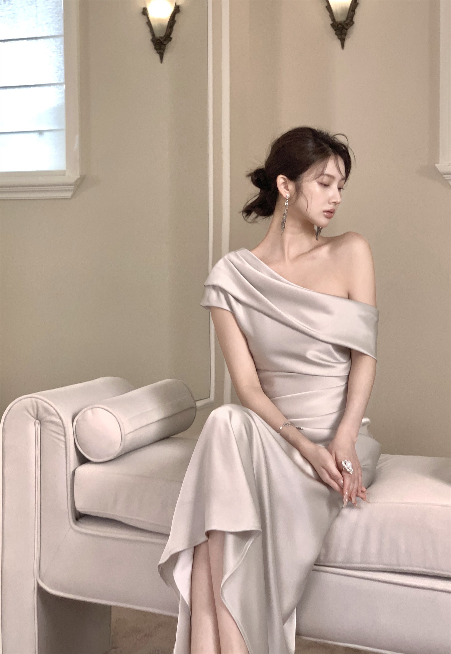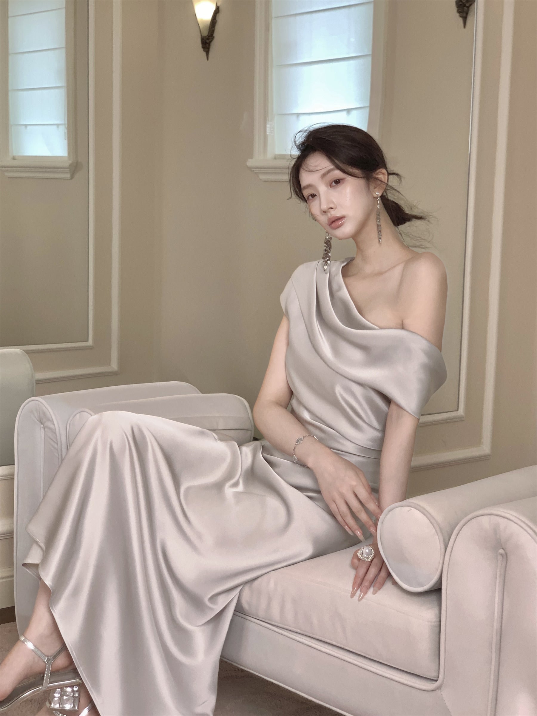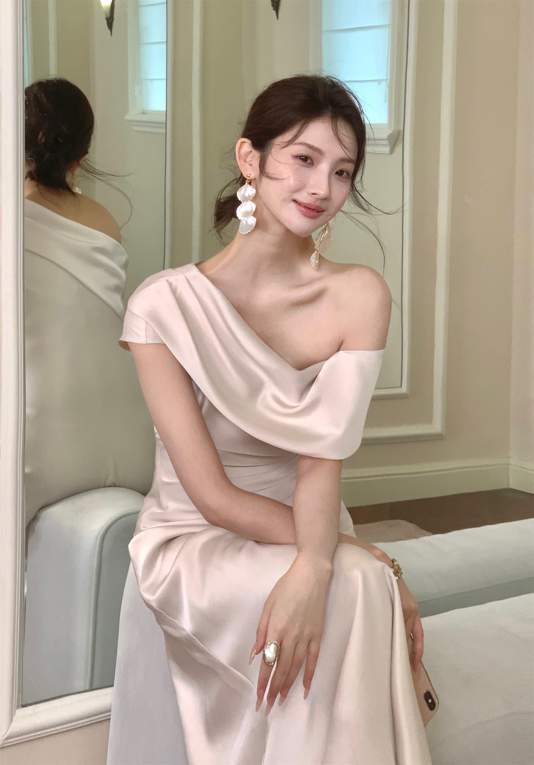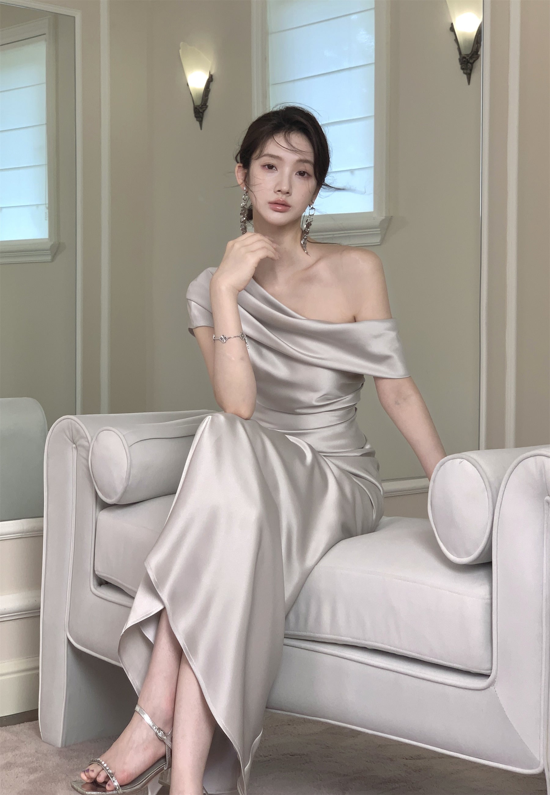 The neckline? A little daring, a lot dreamy. We call it the “dangerous 15°” — a perfectly tilted drape that falls just off the shoulder for that “just-about-to-slip” look, but don’t worry, it stays put. After three rounds of pattern adjustments, you can move, lift, dance, and lean without a single slip.