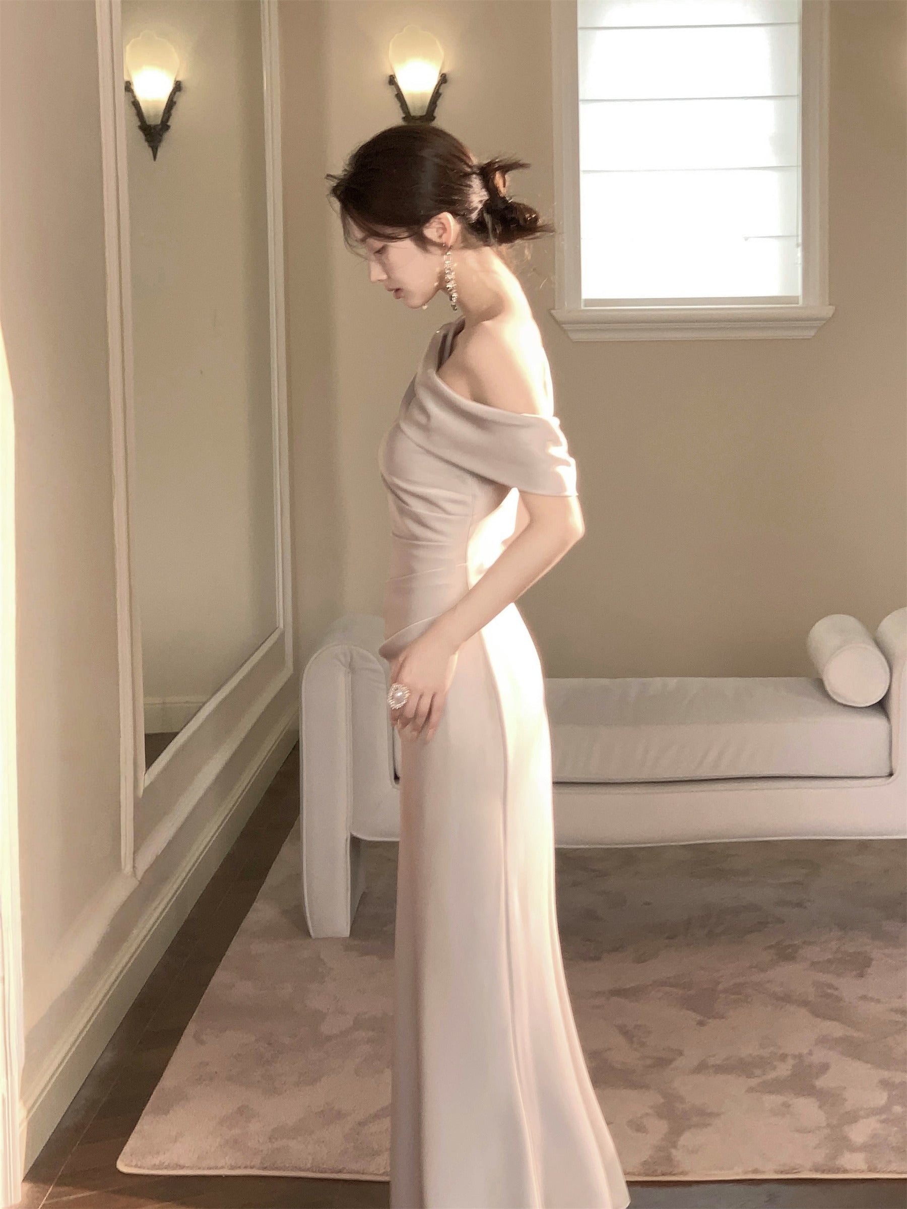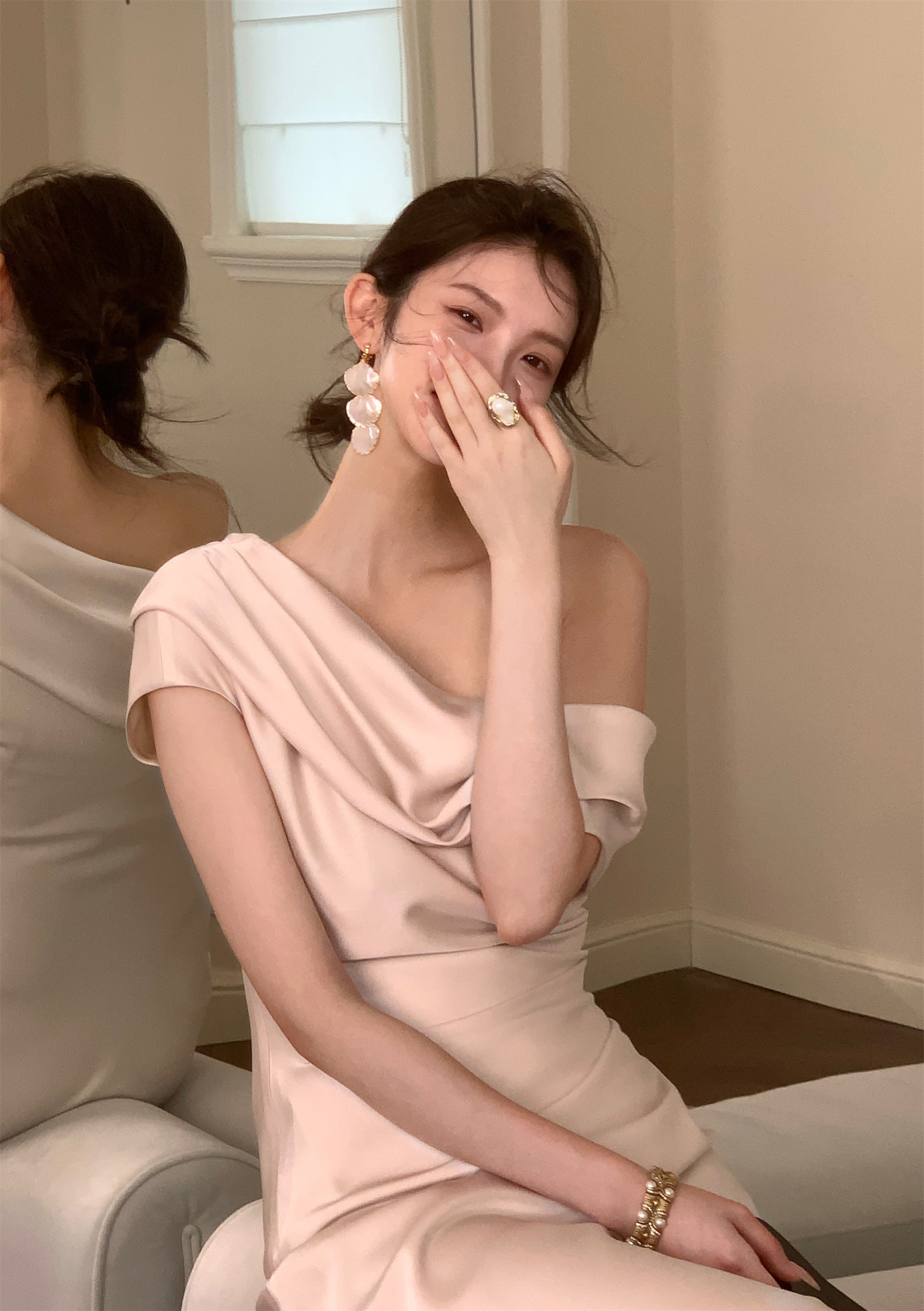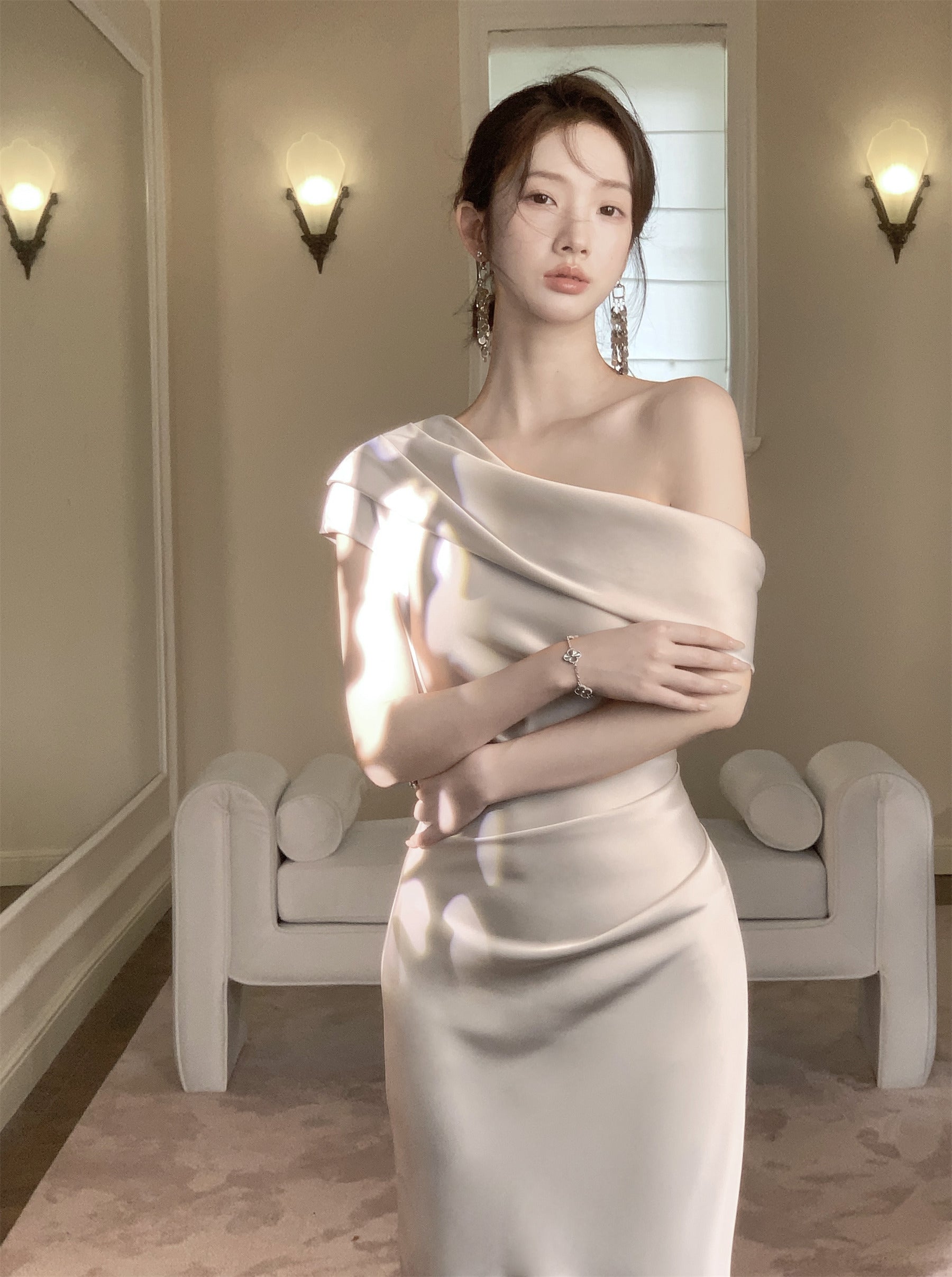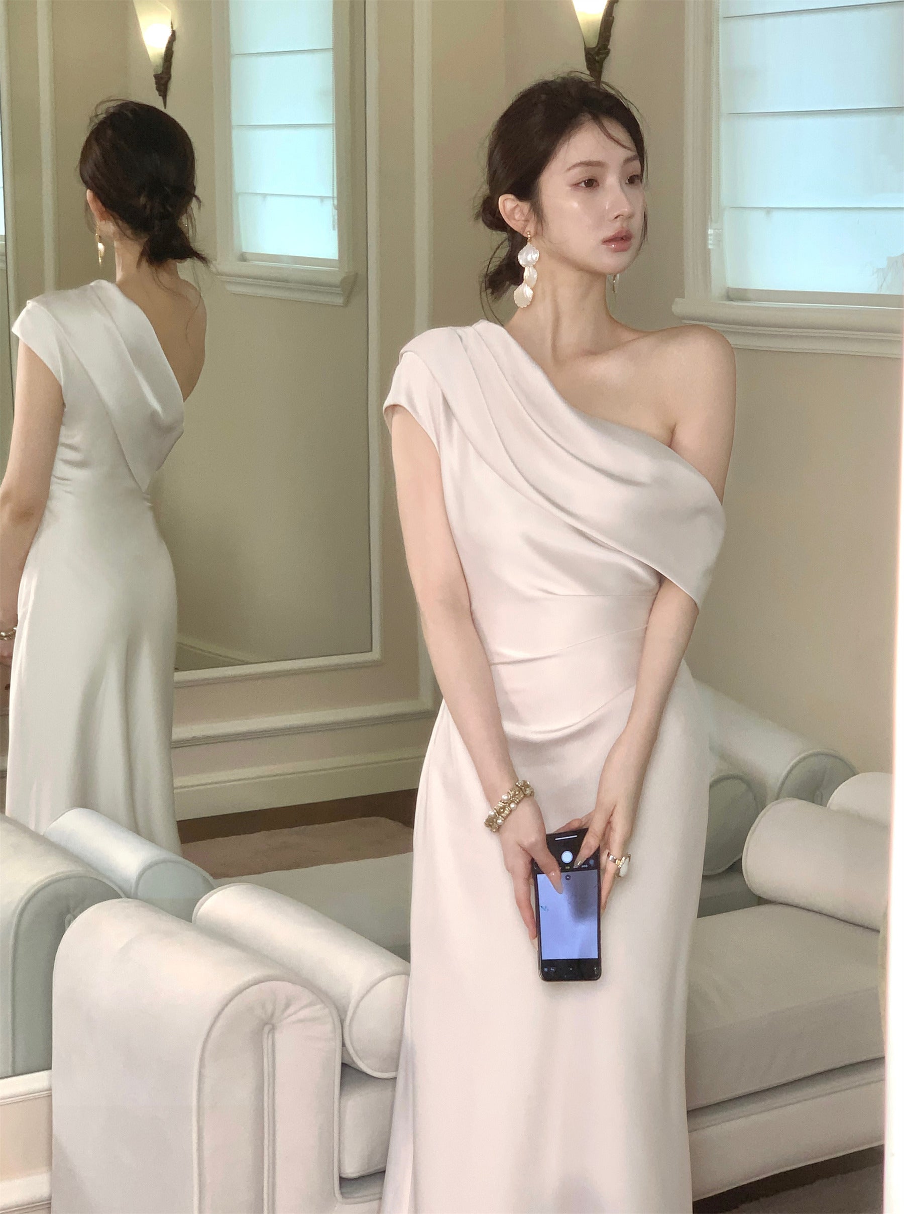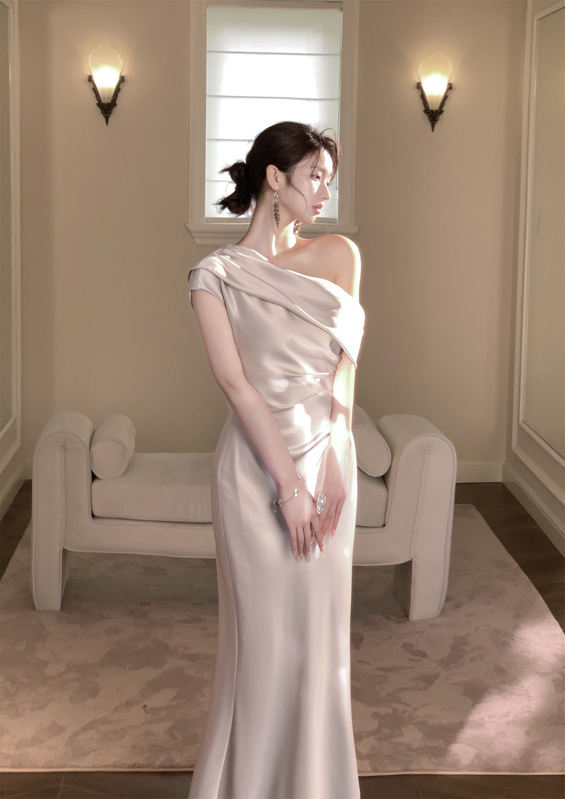 The neckline? A little daring, a lot dreamy. We call it the “dangerous 15°” — a perfectly tilted drape that falls just off the shoulder for that “just-about-to-slip” look, but don’t worry, it stays put. After three rounds of pattern adjustments, you can move, lift, dance, and lean without a single slip.