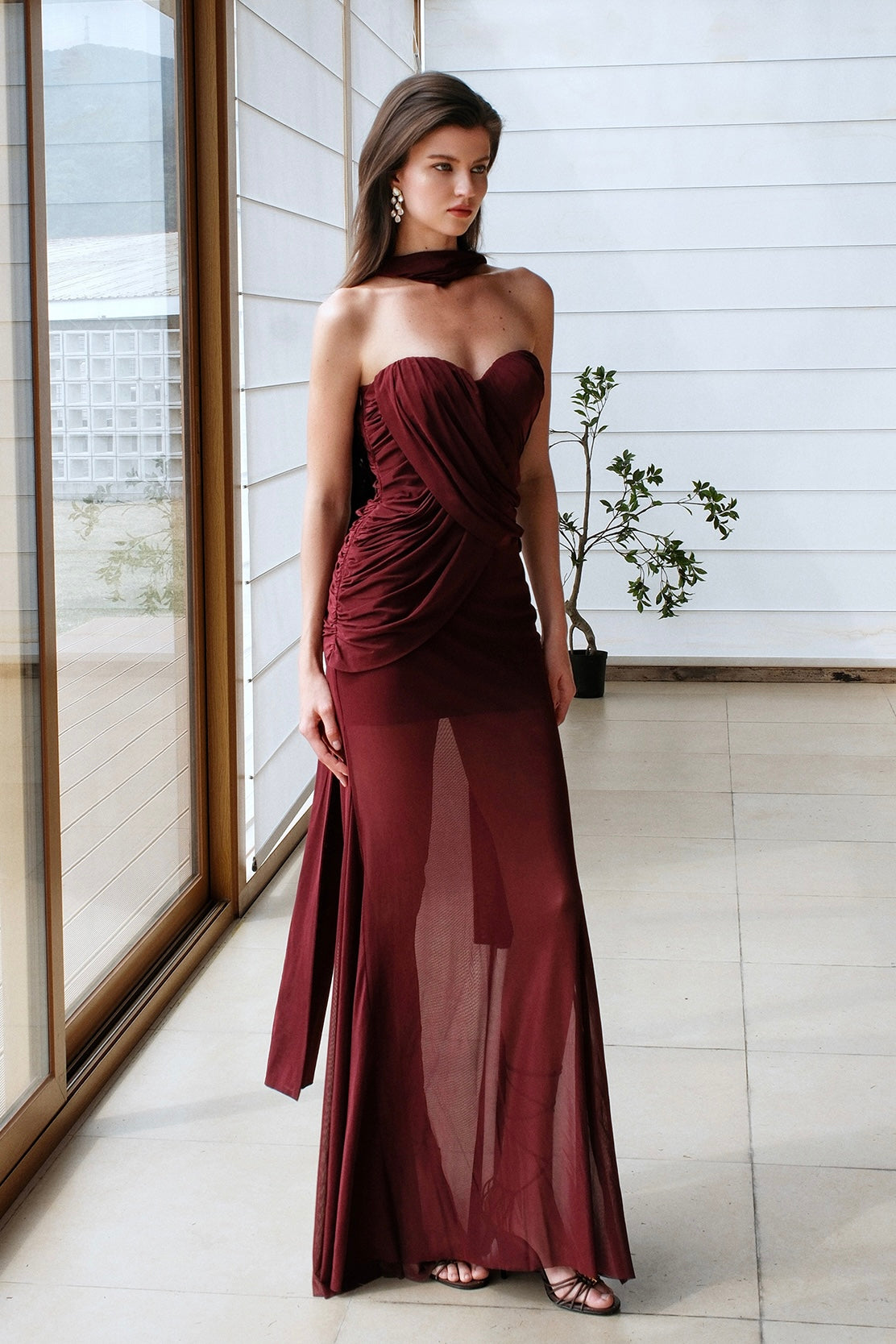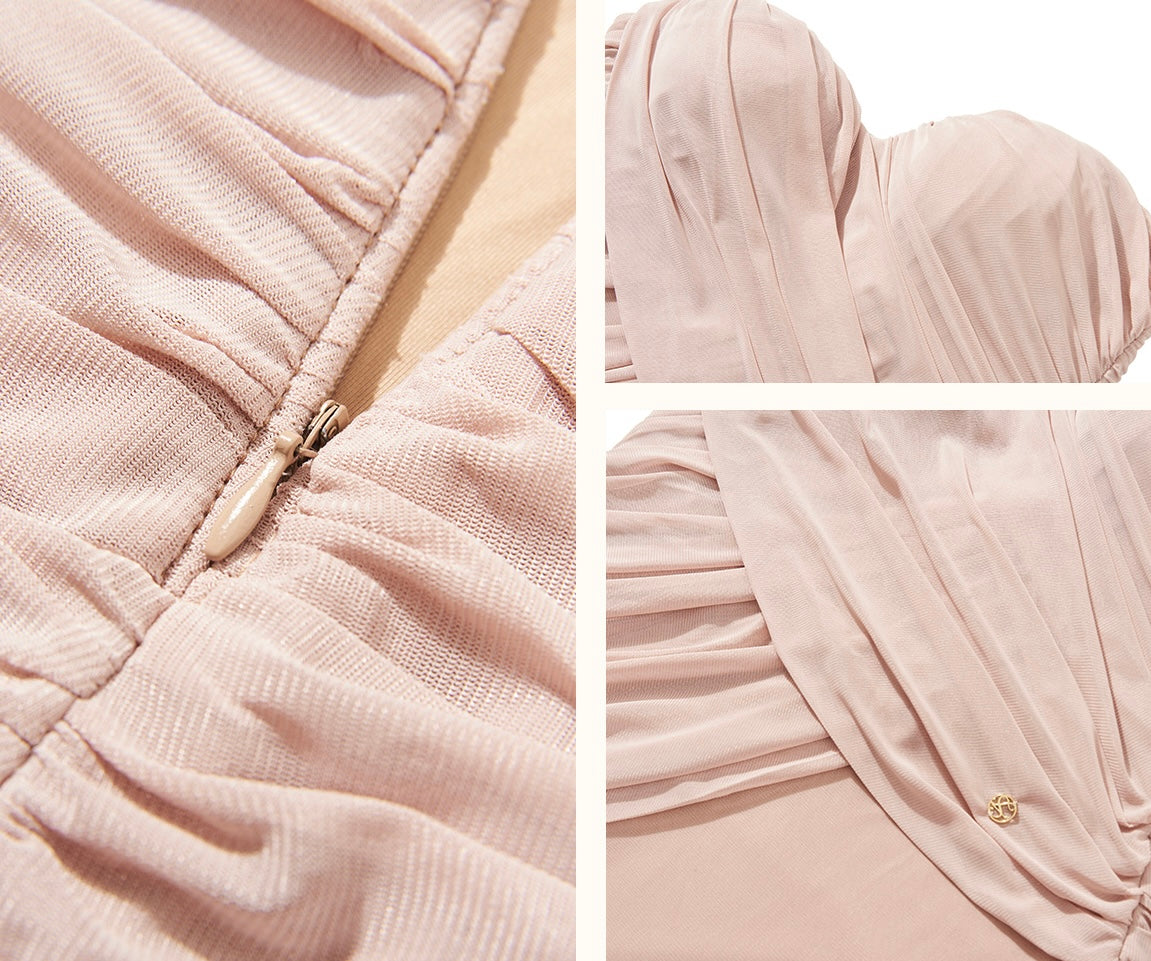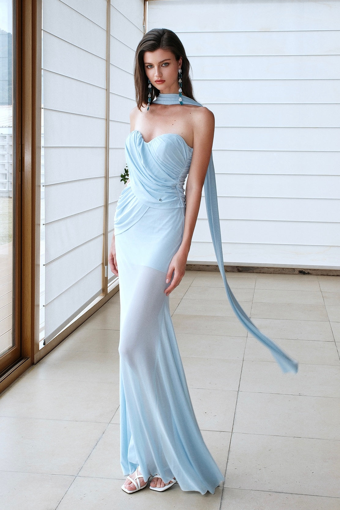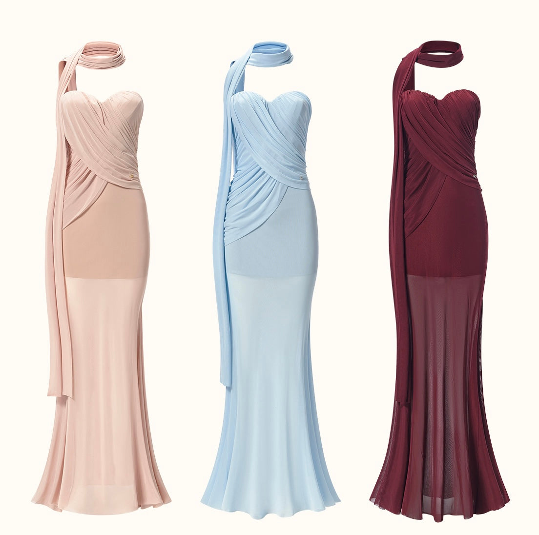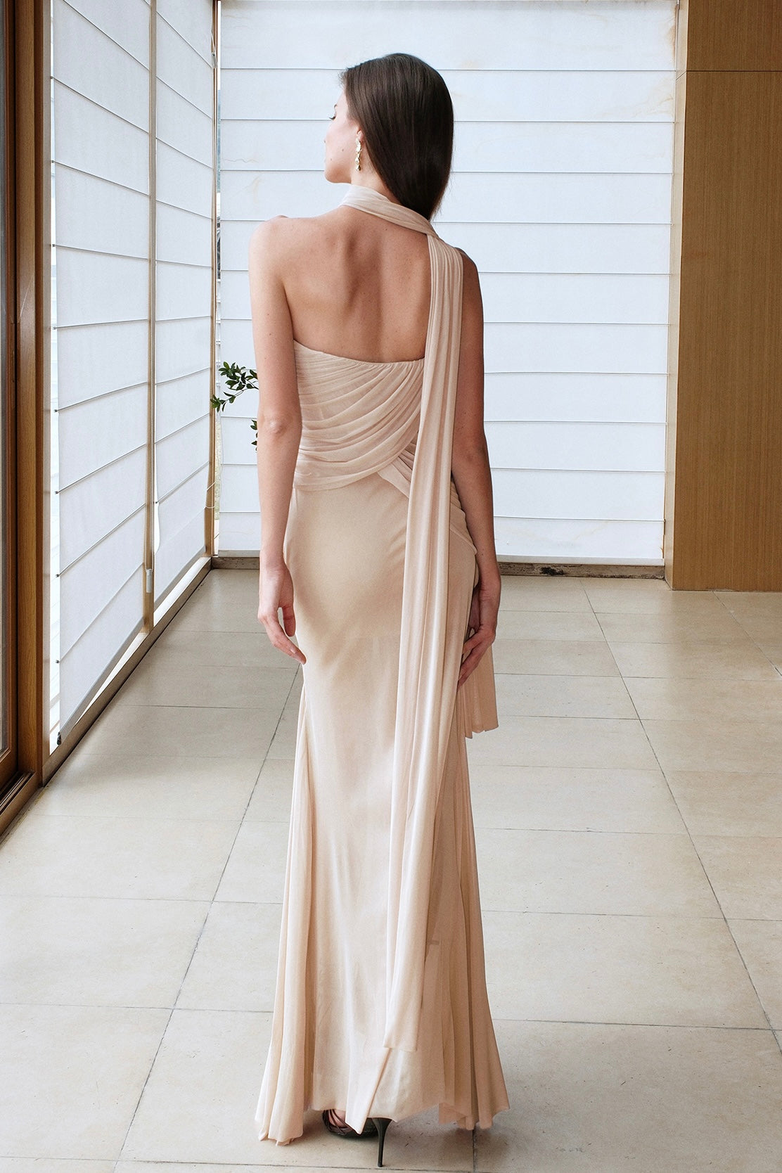 The halter-style straps are fully adjustable, tying gracefully at the neck with long trailing ribbons that frame the shoulders and elongate the neckline. Inside, the silky milk-fiber lining feels smooth as skin: breathable, weightless, and oh-so-soft to wear all day (or night).