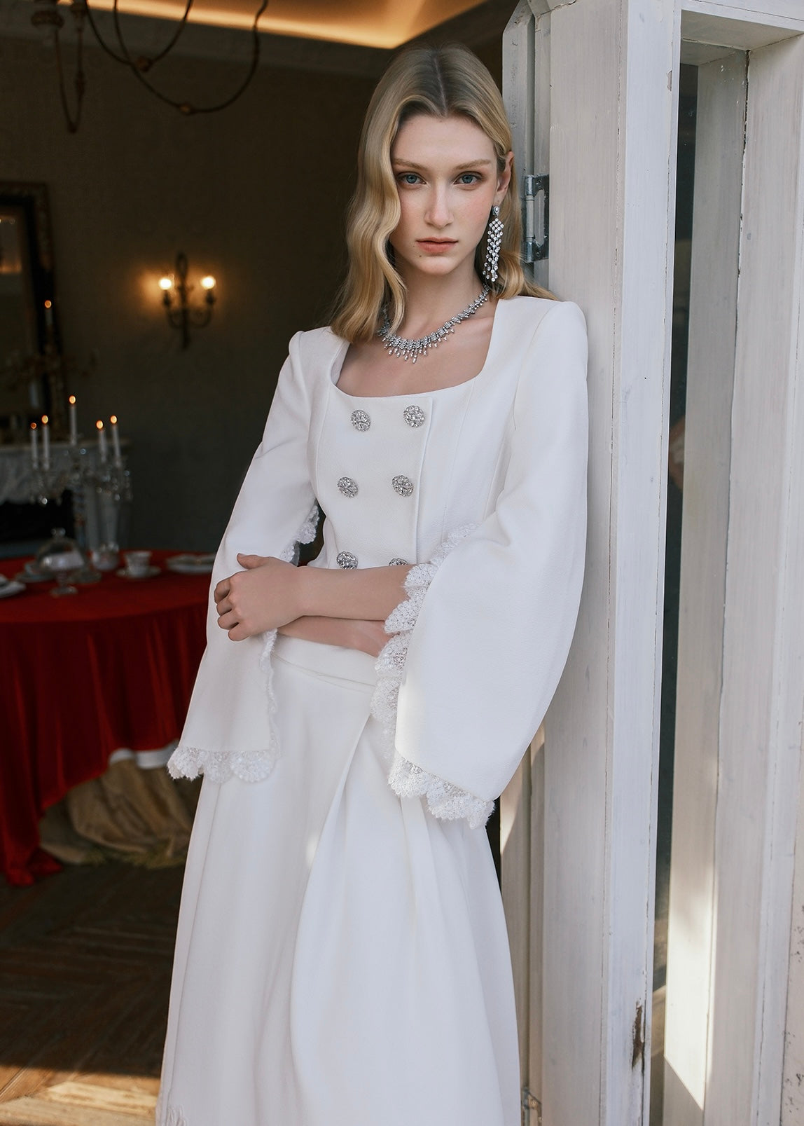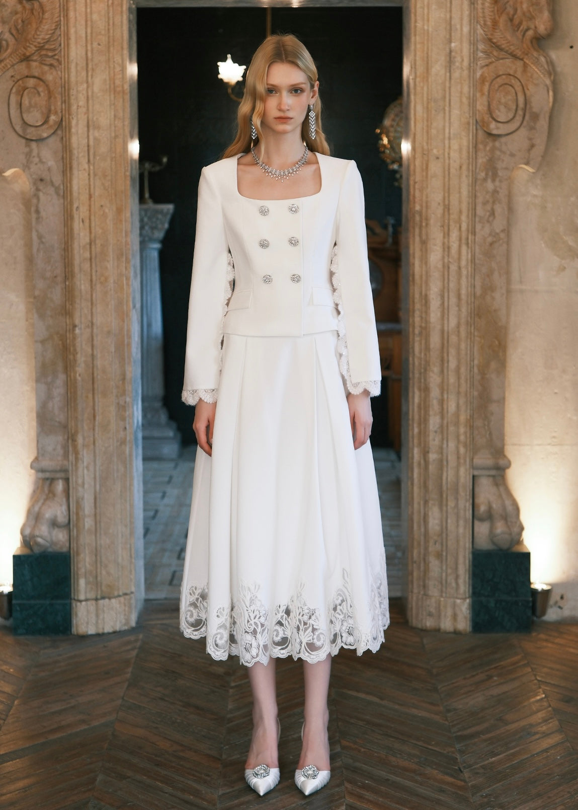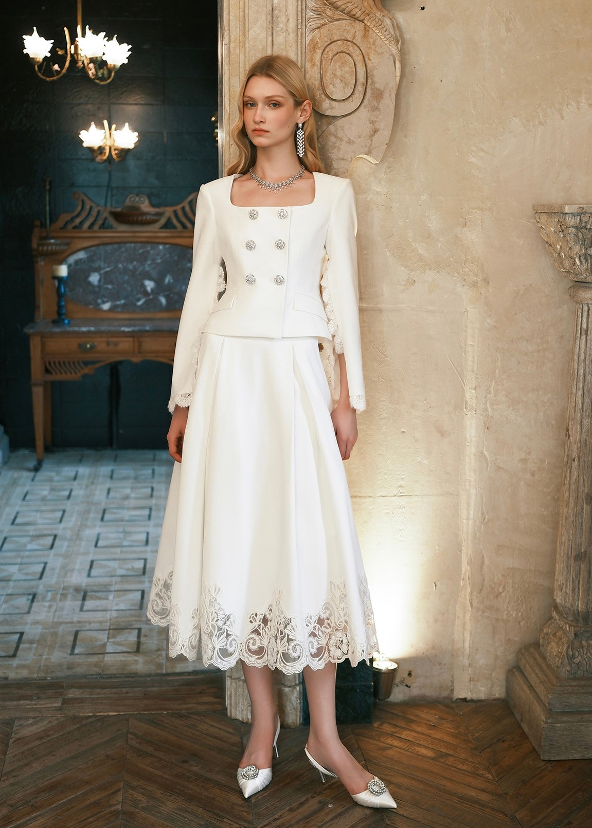 Our waist-skimming jacket frames the décolletage with a refined square neckline, cinches neatly through the bodice, and closes with two gleaming rows of crystal-set buttons for a dash of old-world sparkle. Peek inside the sleeve slits and you’ll find bespoke sequin-flecked lace, an unexpected flirt of texture that flickers with every gesture.