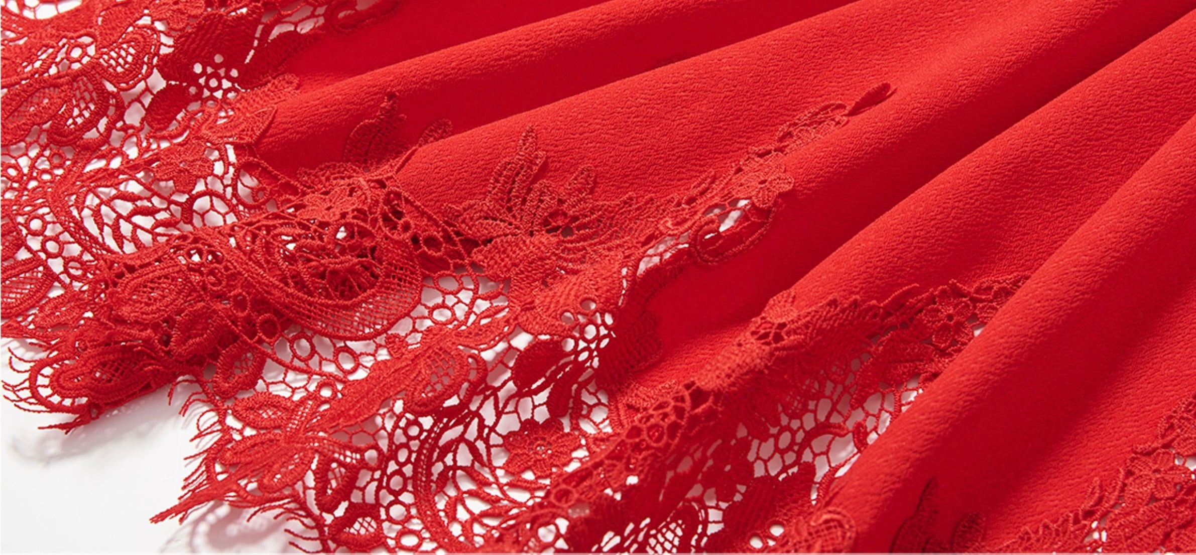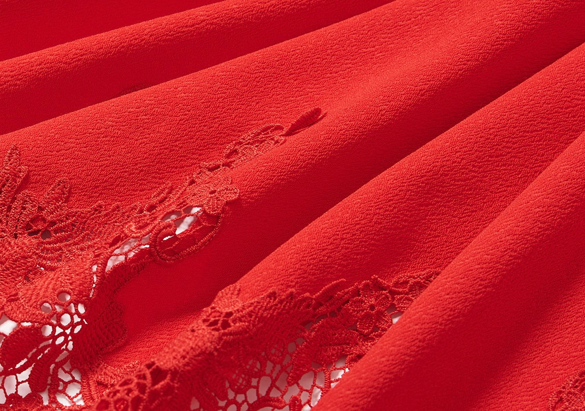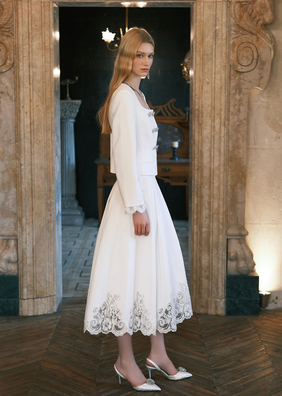 The matching skirt falls in graceful pleats to a sweeping midi hem, where ornate lace motifs melt seamlessly into the fabric. We love the way the scallops flicker around your ankles, lending movement that begs for a turn on the dance floor.
