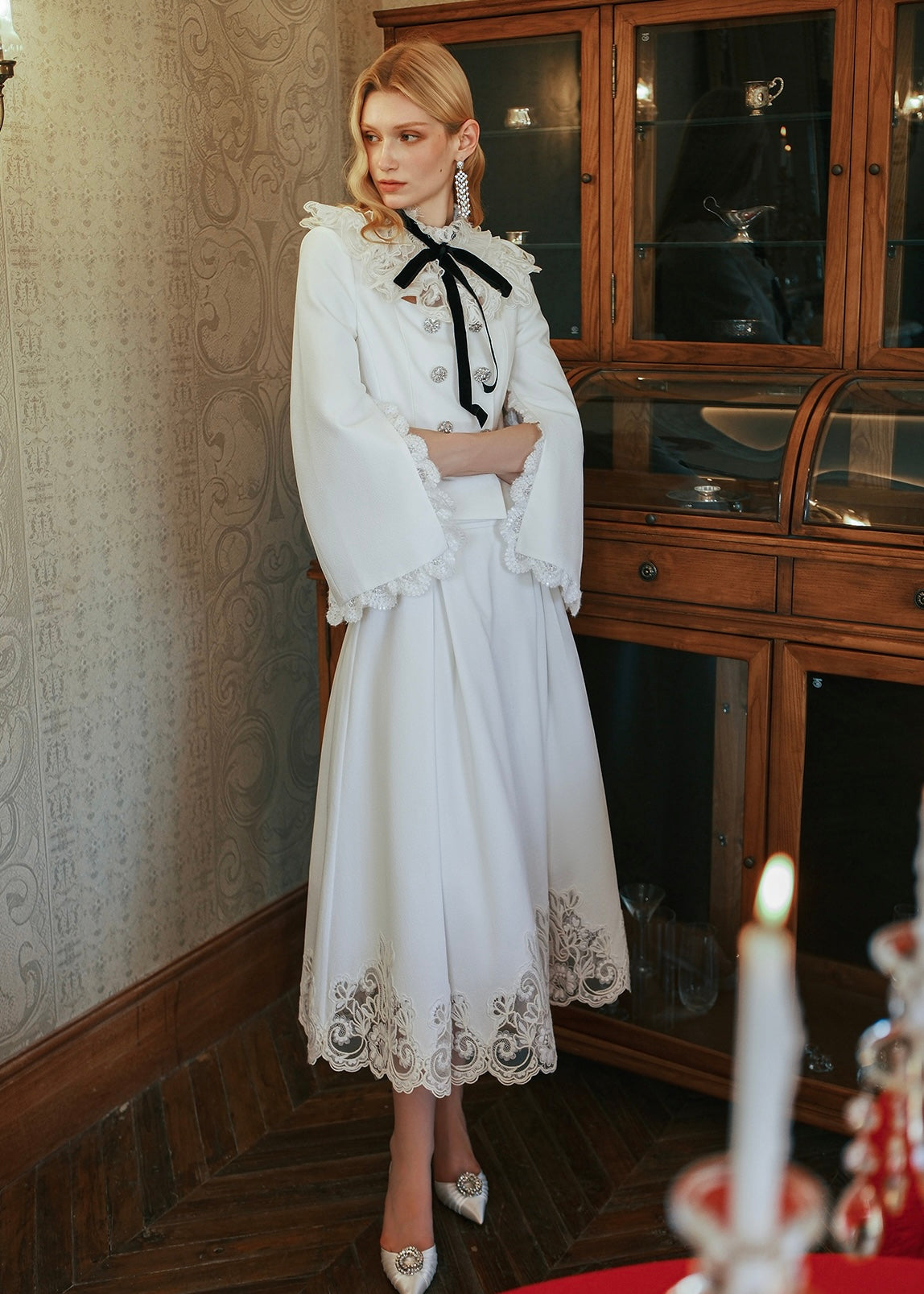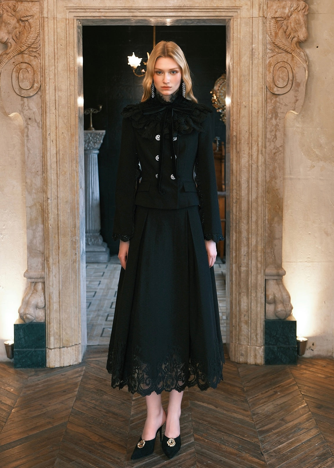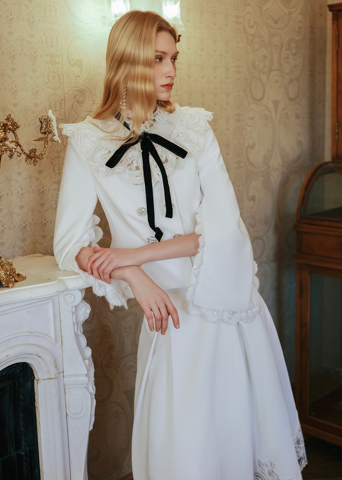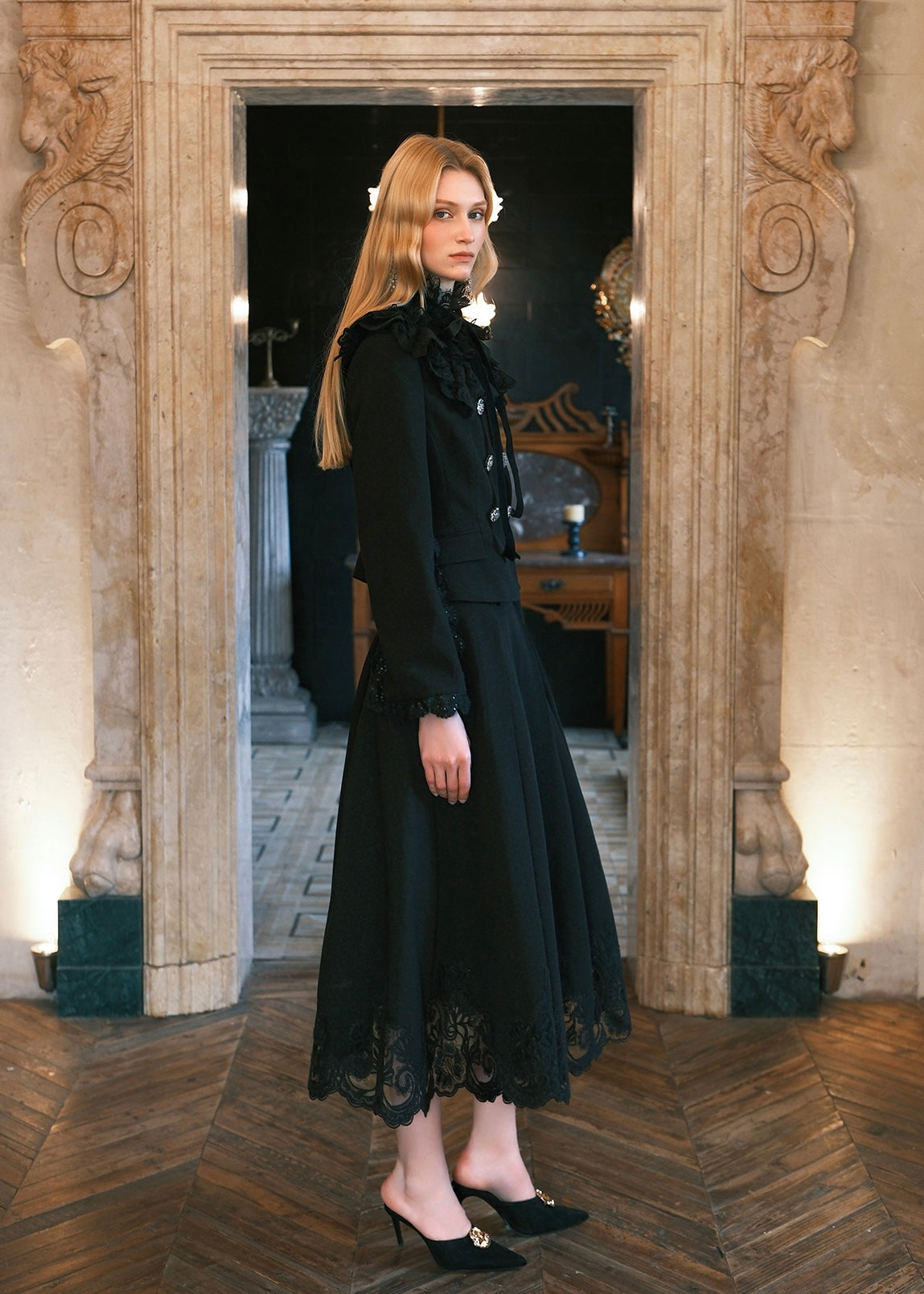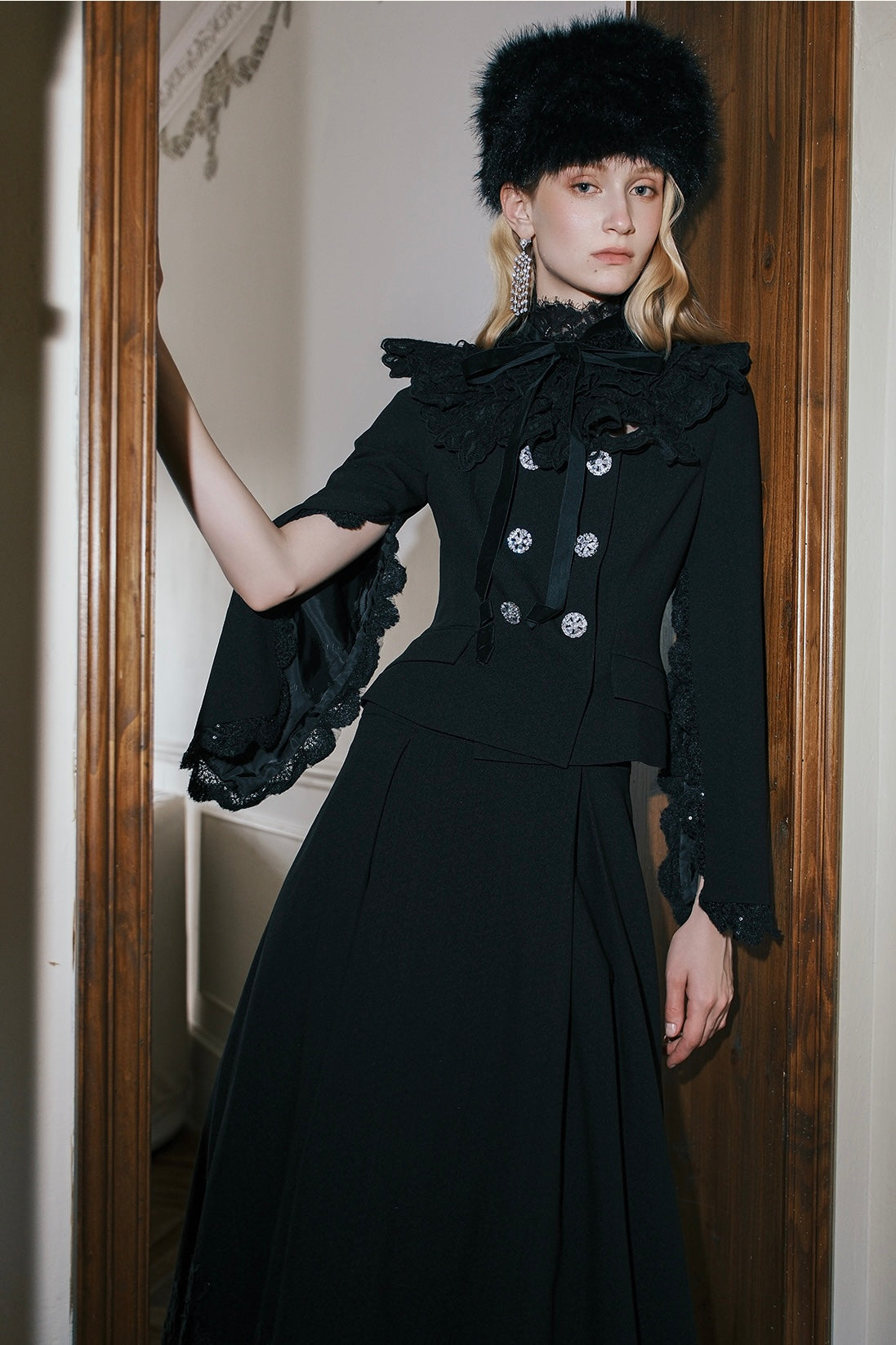 Slip on the detachable ruffled capelet to heighten the drama: layers of sculpted lace fan into a high collar, finished with a velvet bow that ties softly at the throat. One bow, and the mood transforms from polished to positively theatrical -how’s that for desk-to-soirée magic?