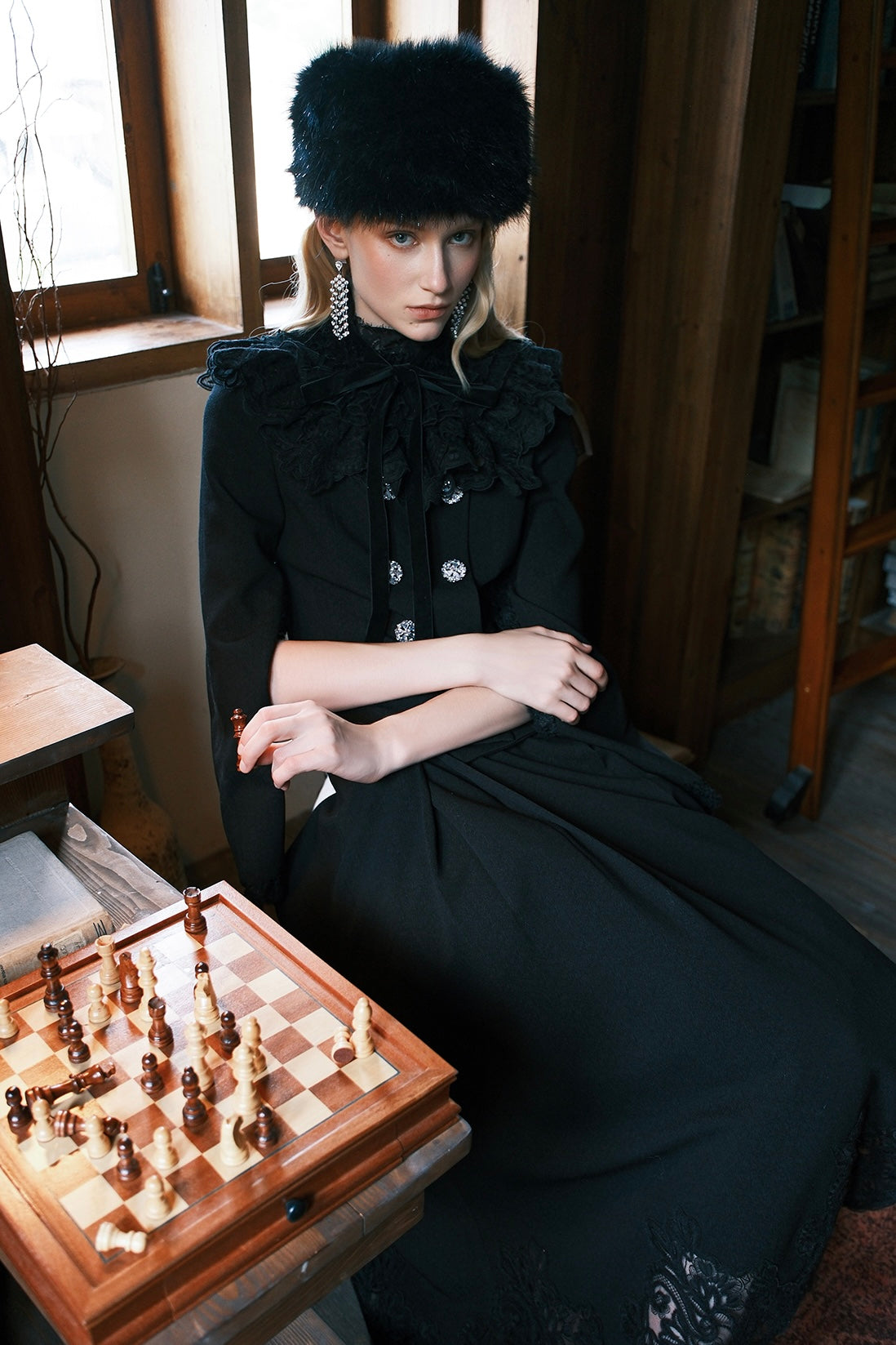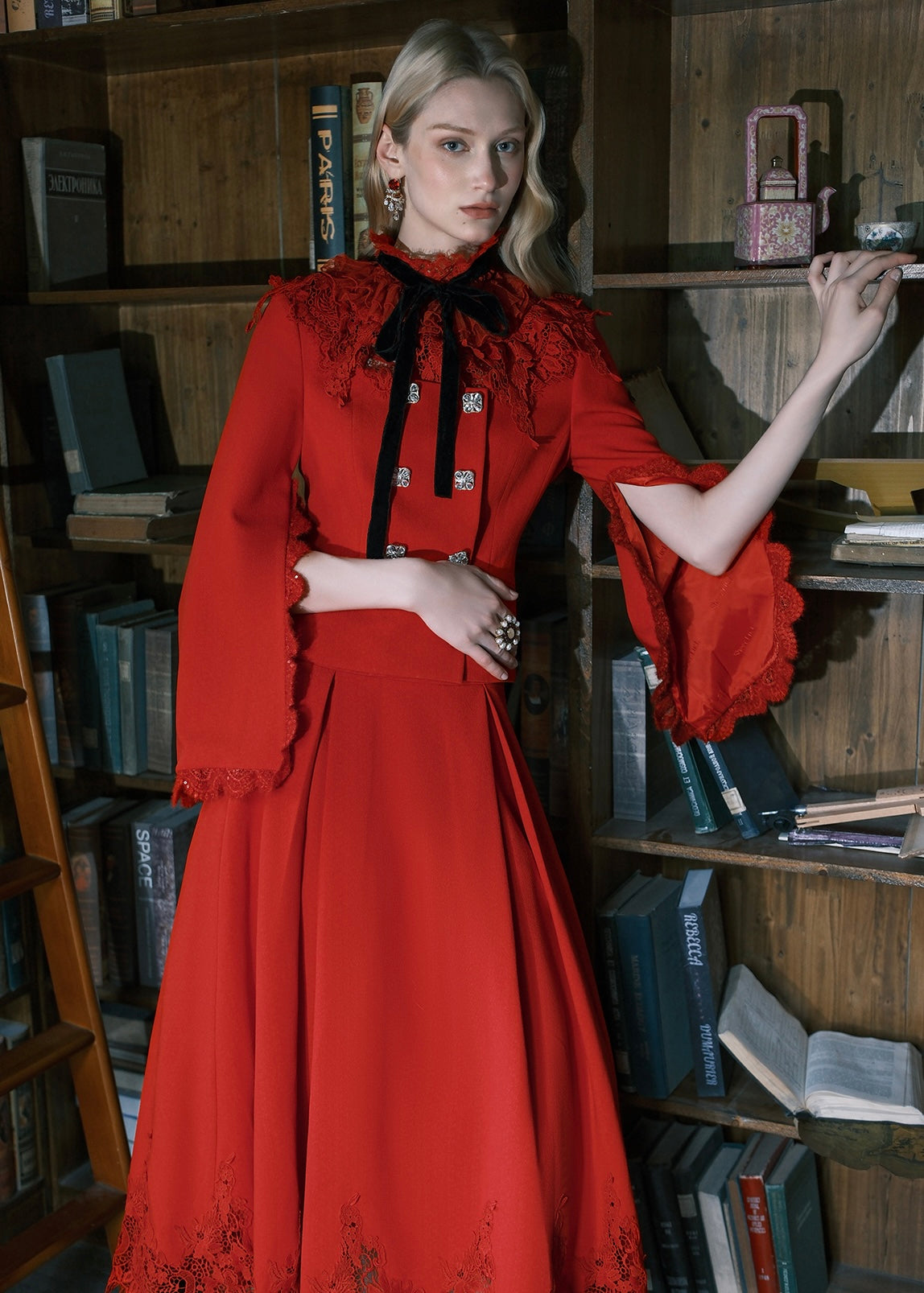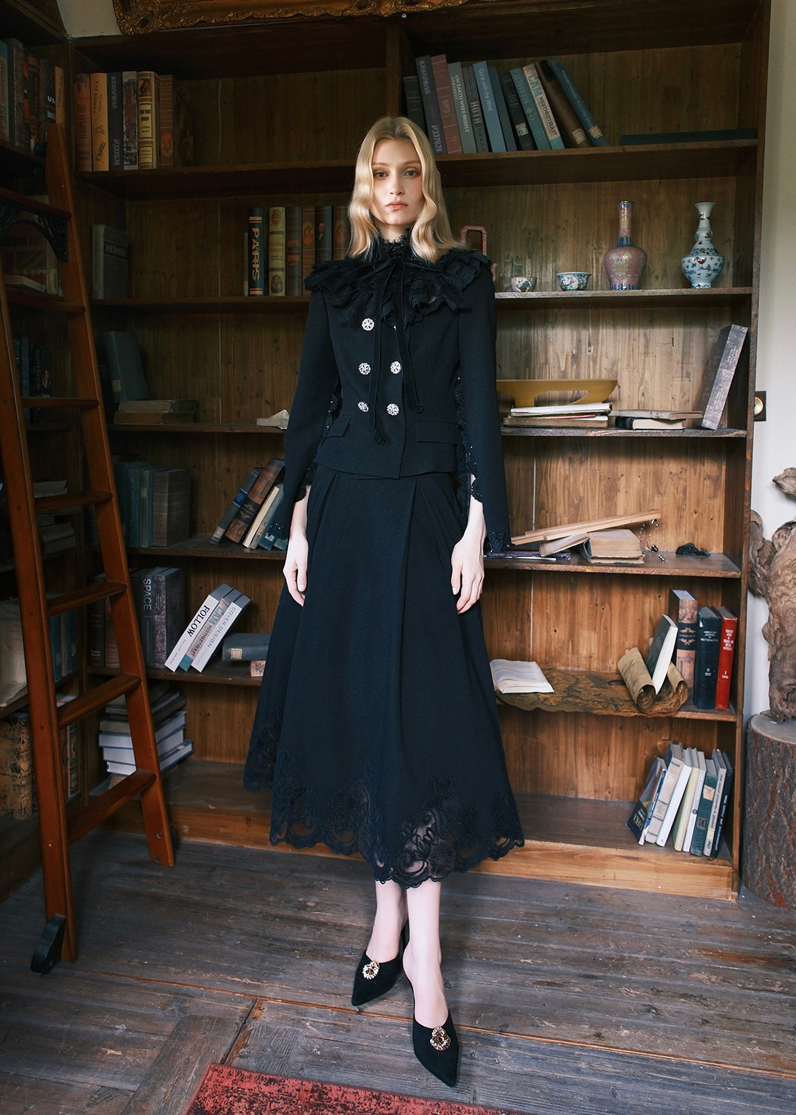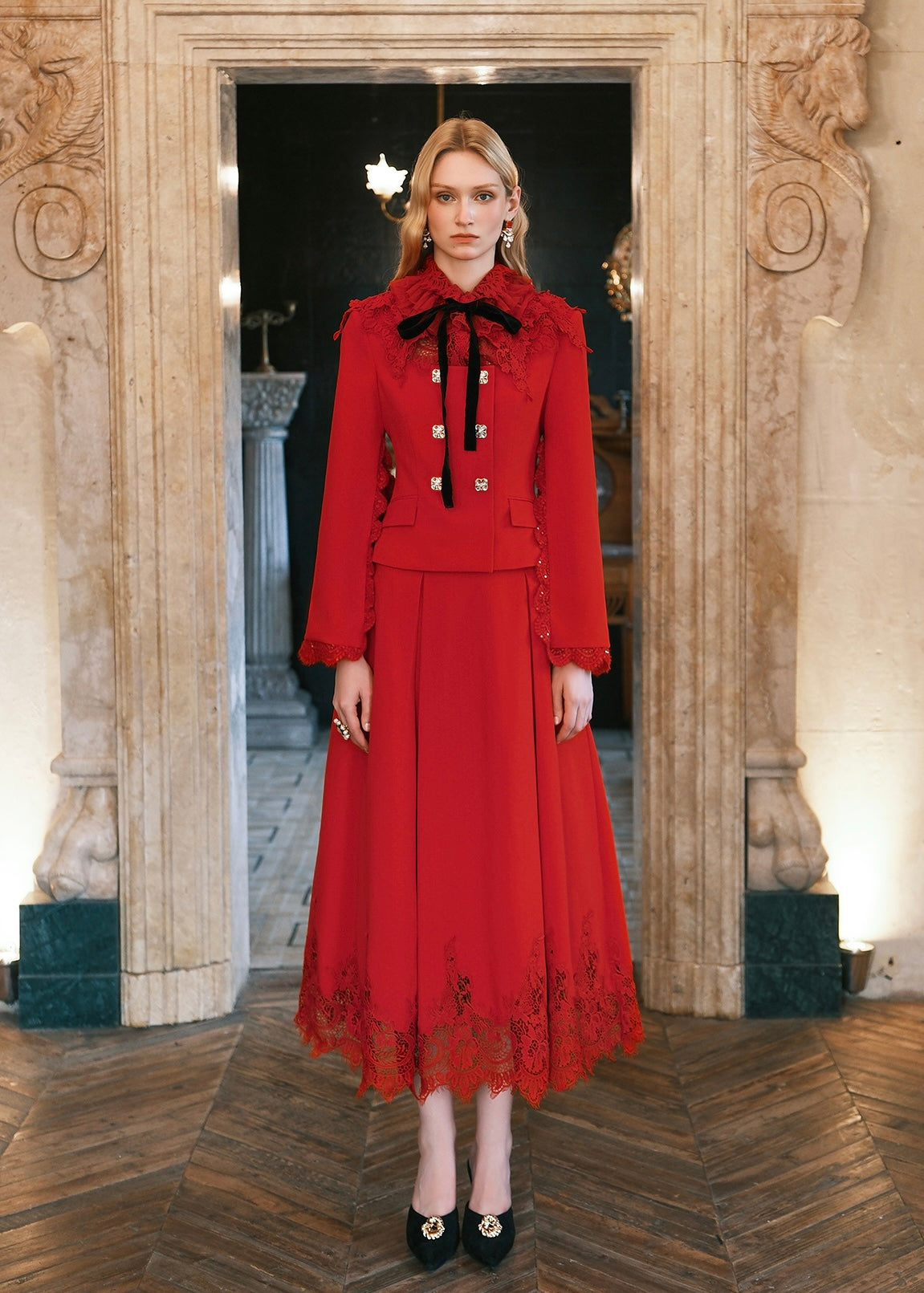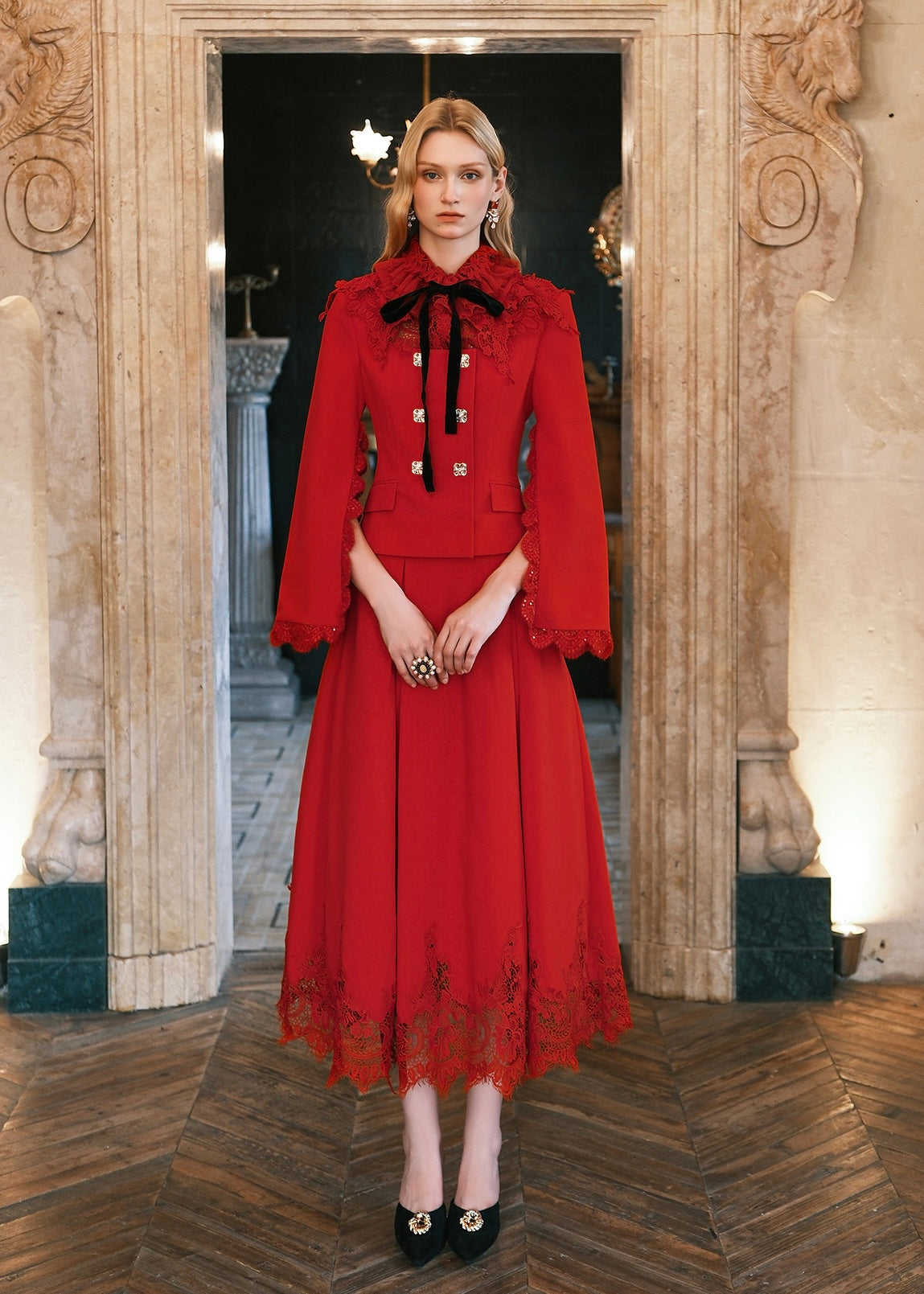 Slip on the detachable ruffled capelet to heighten the drama: layers of sculpted lace fan into a high collar, finished with a velvet bow that ties softly at the throat. One bow, and the mood transforms from polished to positively theatrical -how’s that for desk-to-soirée magic?