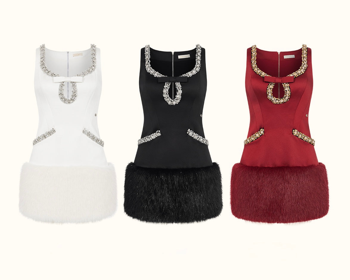 The hem? Fluffed with dramatic faux fur in matching tones — giving you that mini moment you’ve been craving, with all the charm of couture glam. Think vintage Parisian glamour with a dash of modern femme.