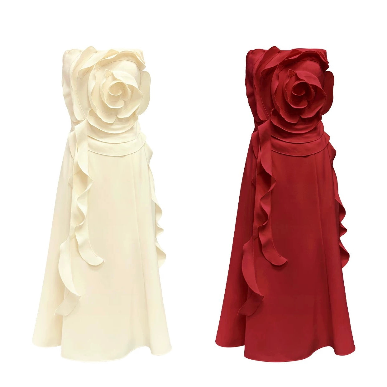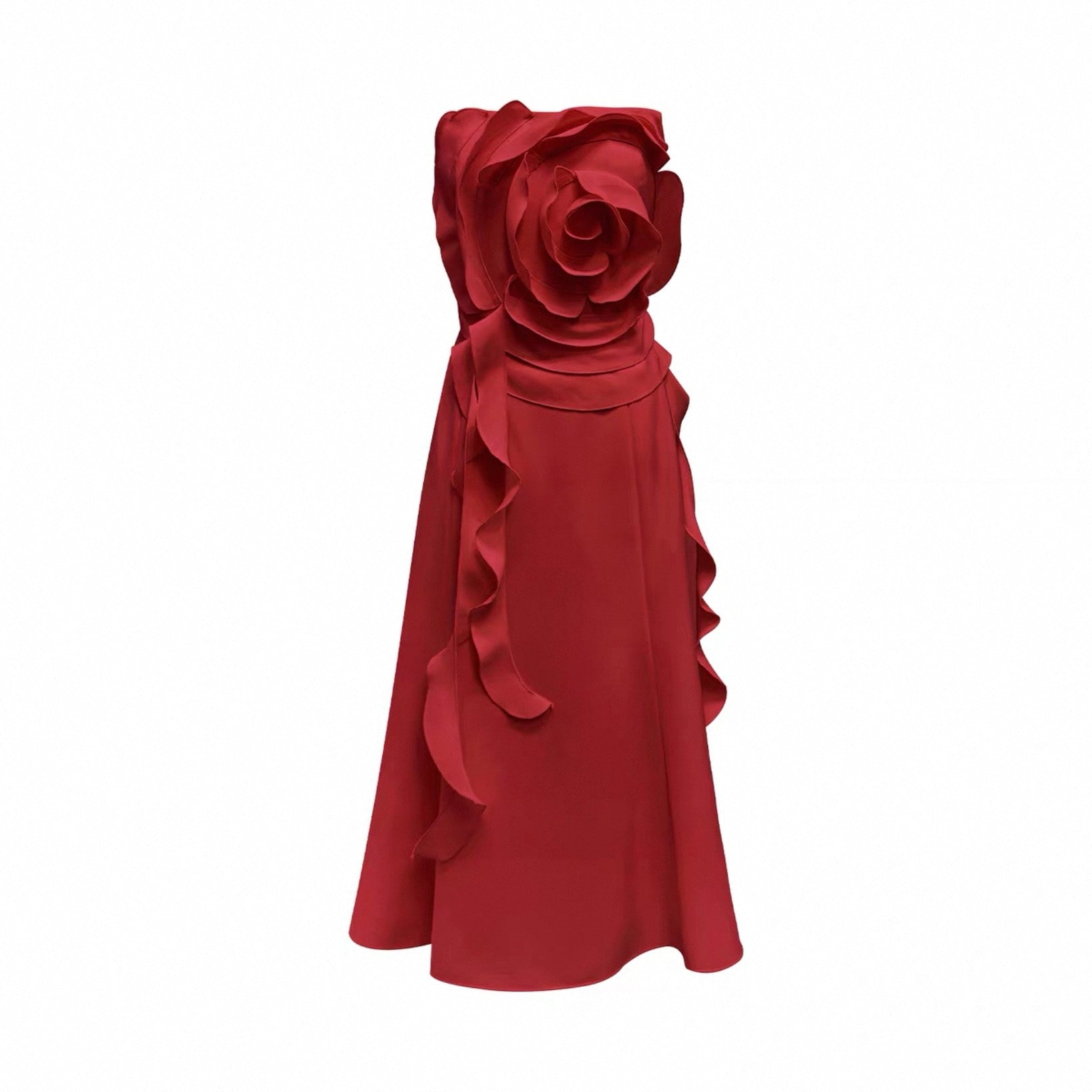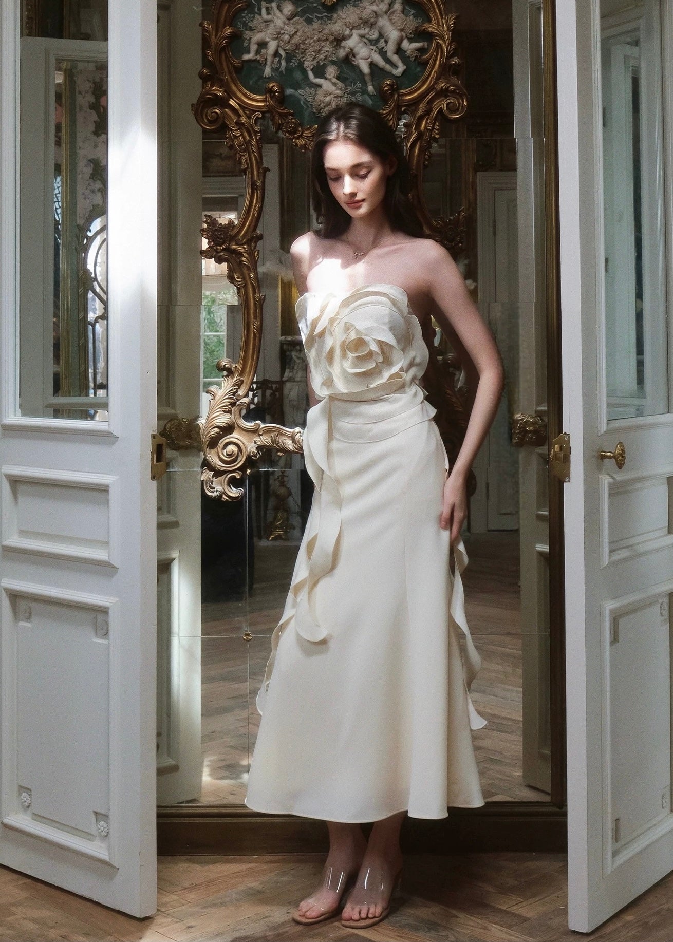 With its sculptural rose bodice and cascading petal ruffles, ‘Helmi’ is a celebration of romantic design and modern femininity. The strapless silhouette flatters with a softly cinched waist and a fluid A-line skirt that sways effortlessly as you move. Crafted in a soft champagne hue or deep wine red, ‘Helmi’ is designed to look like you’re wearing a flower in full bloom - bold, beautiful, and unforgettable.