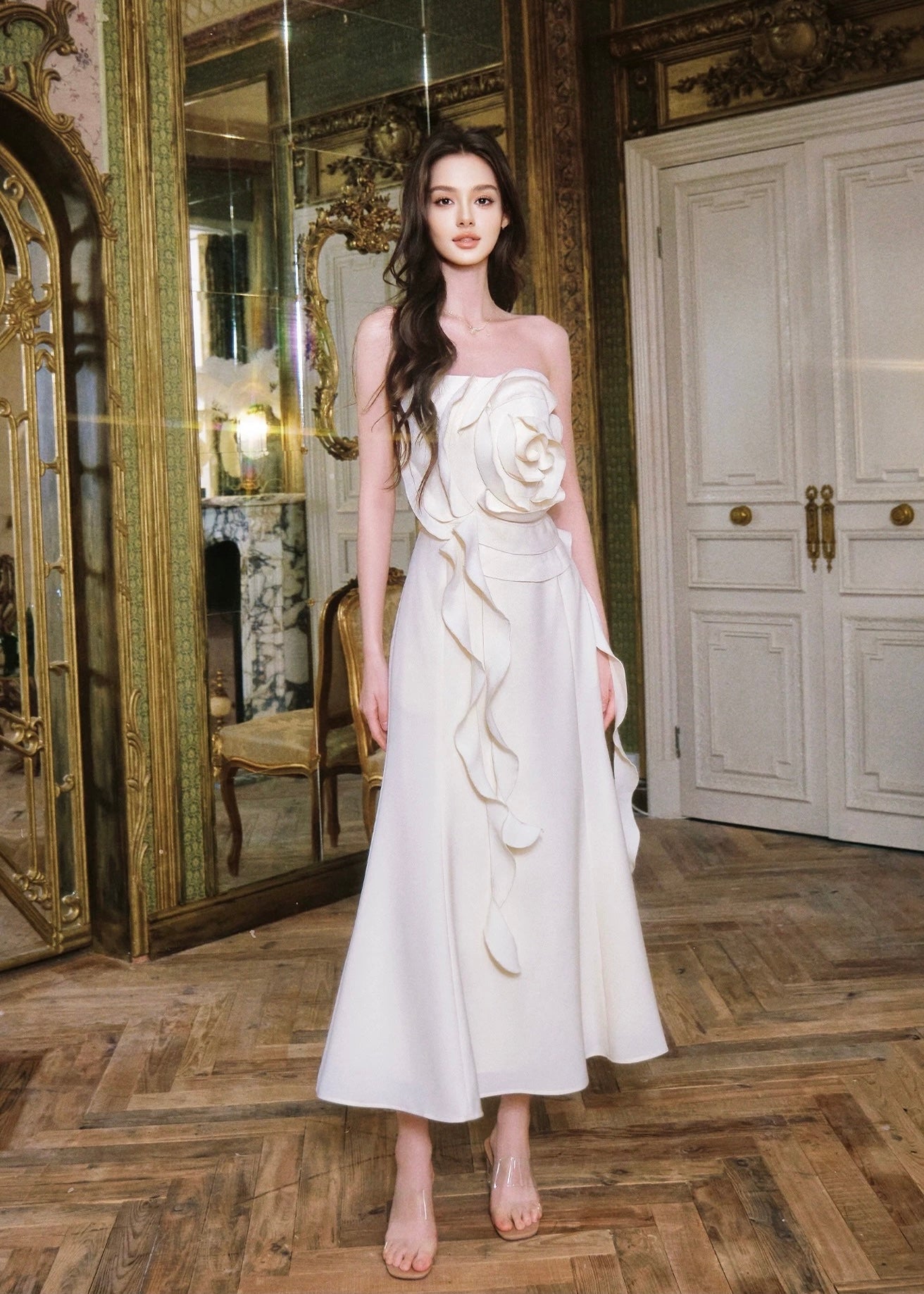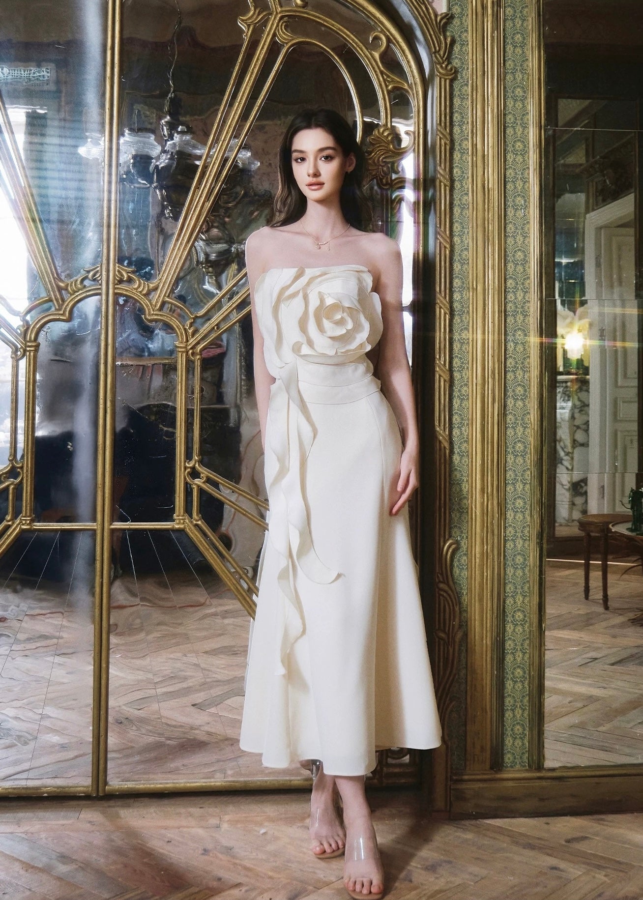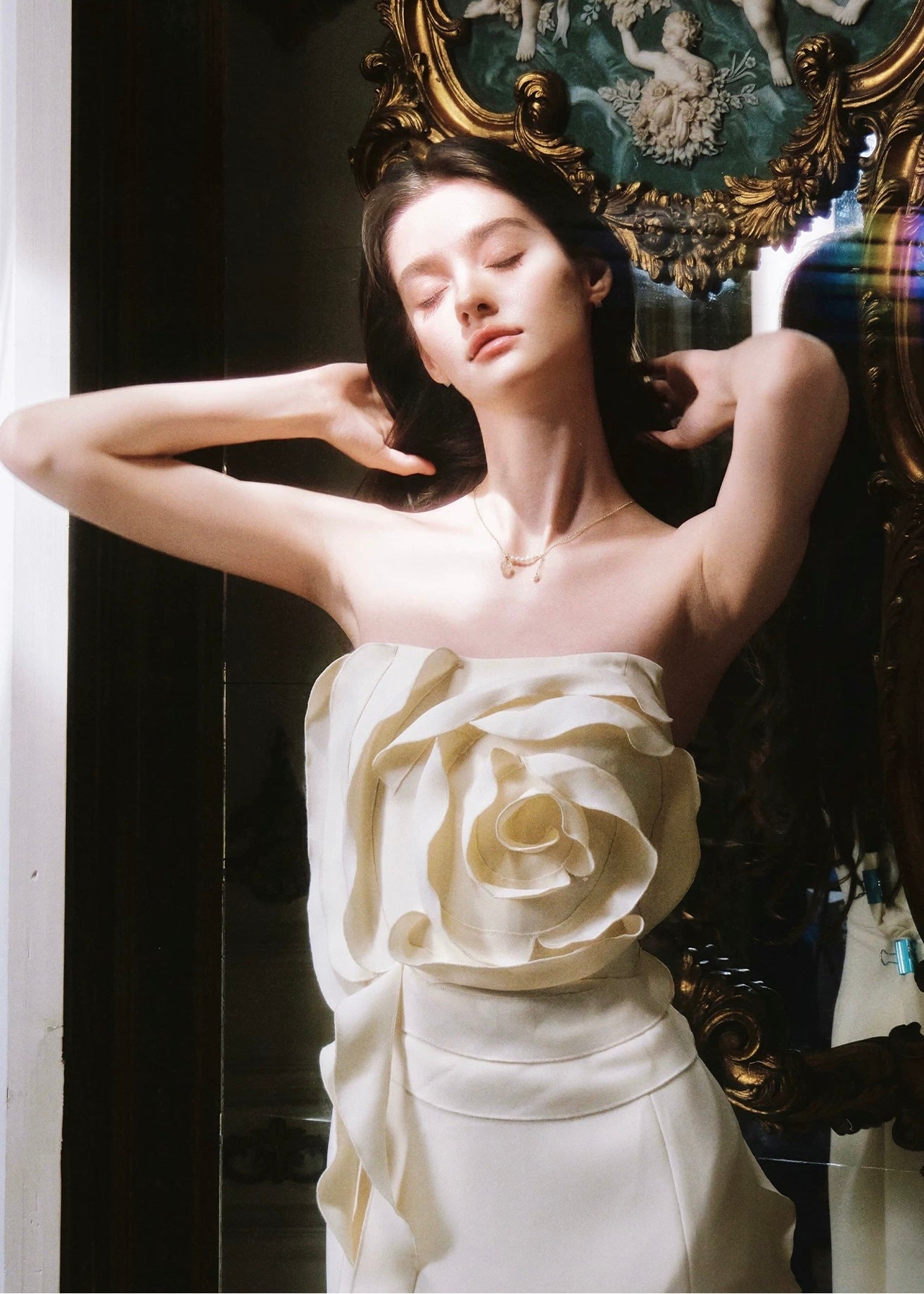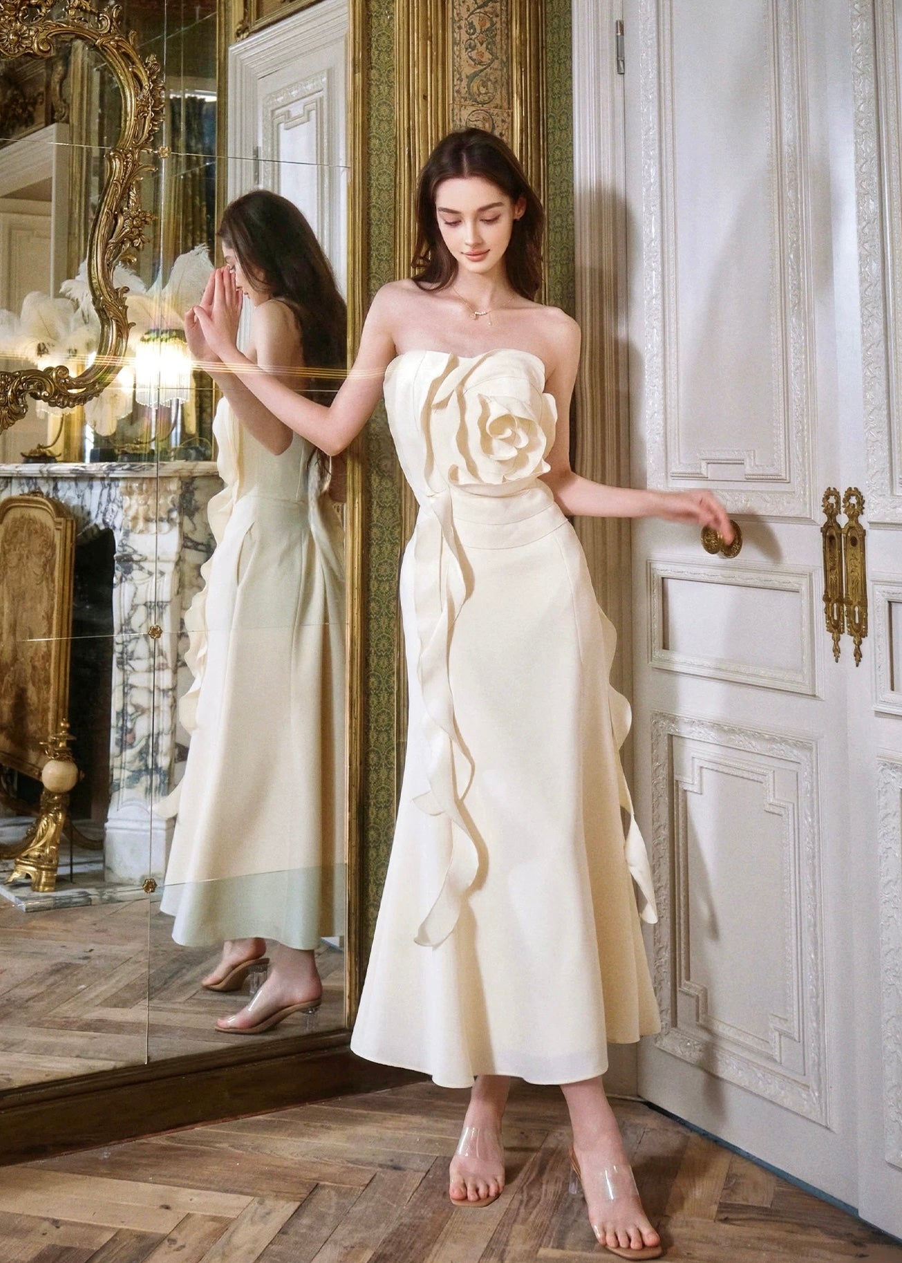 With its sculptural rose bodice and cascading petal ruffles, ‘Helmi’ is a celebration of romantic design and modern femininity. The strapless silhouette flatters with a softly cinched waist and a fluid A-line skirt that sways effortlessly as you move. Crafted in a soft champagne hue or deep wine red, ‘Helmi’ is designed to look like you’re wearing a flower in full bloom - bold, beautiful, and unforgettable.