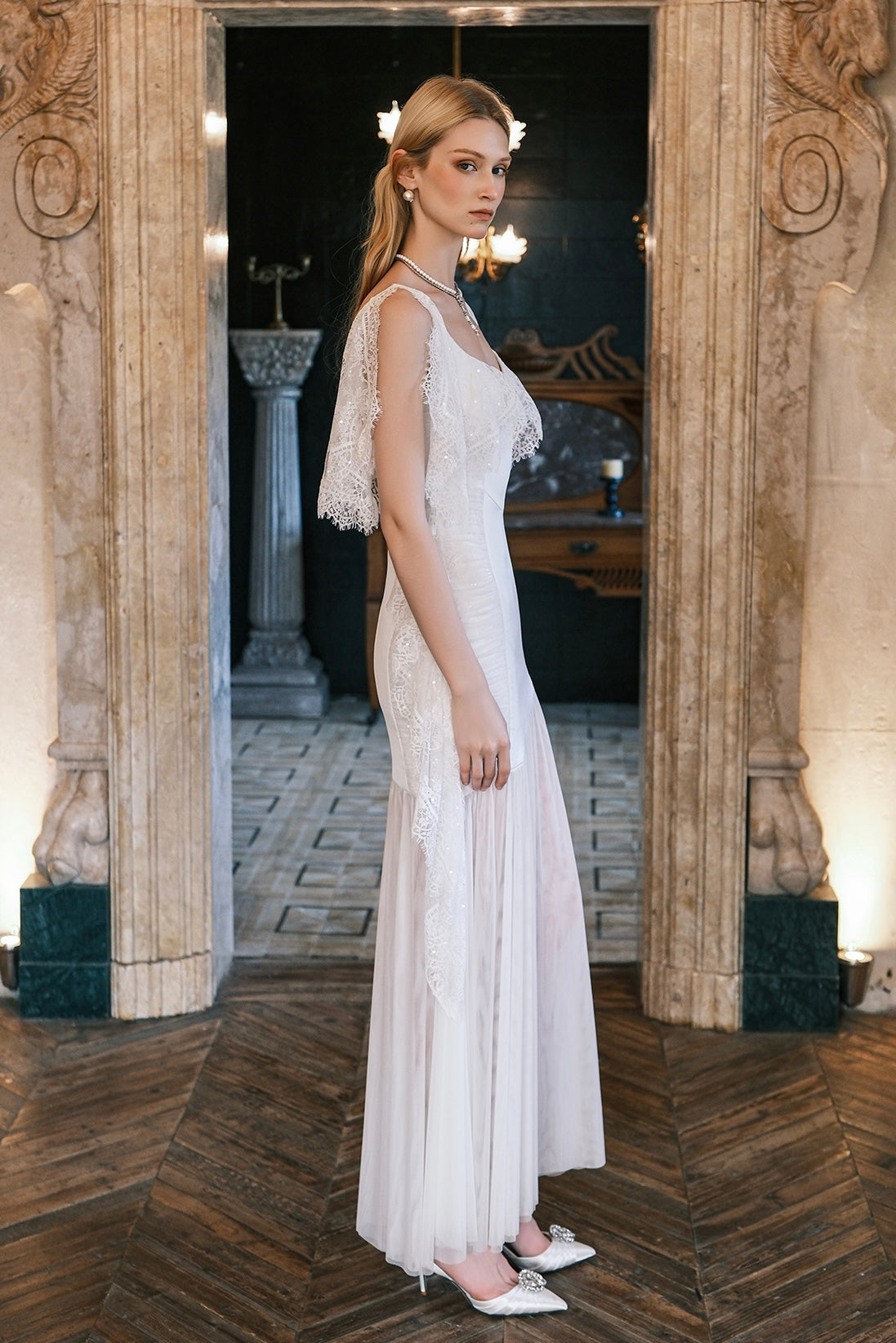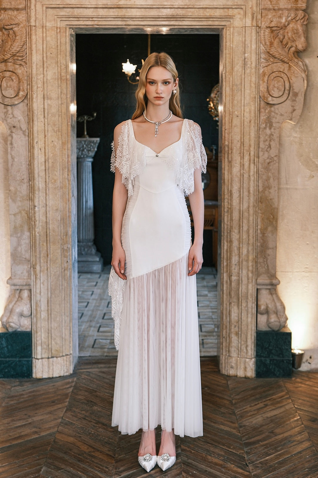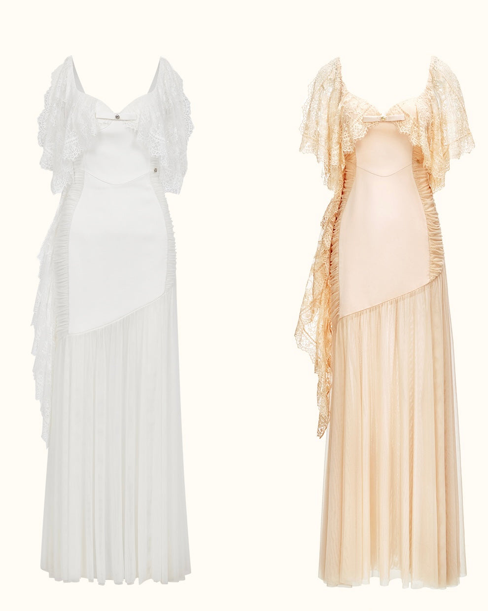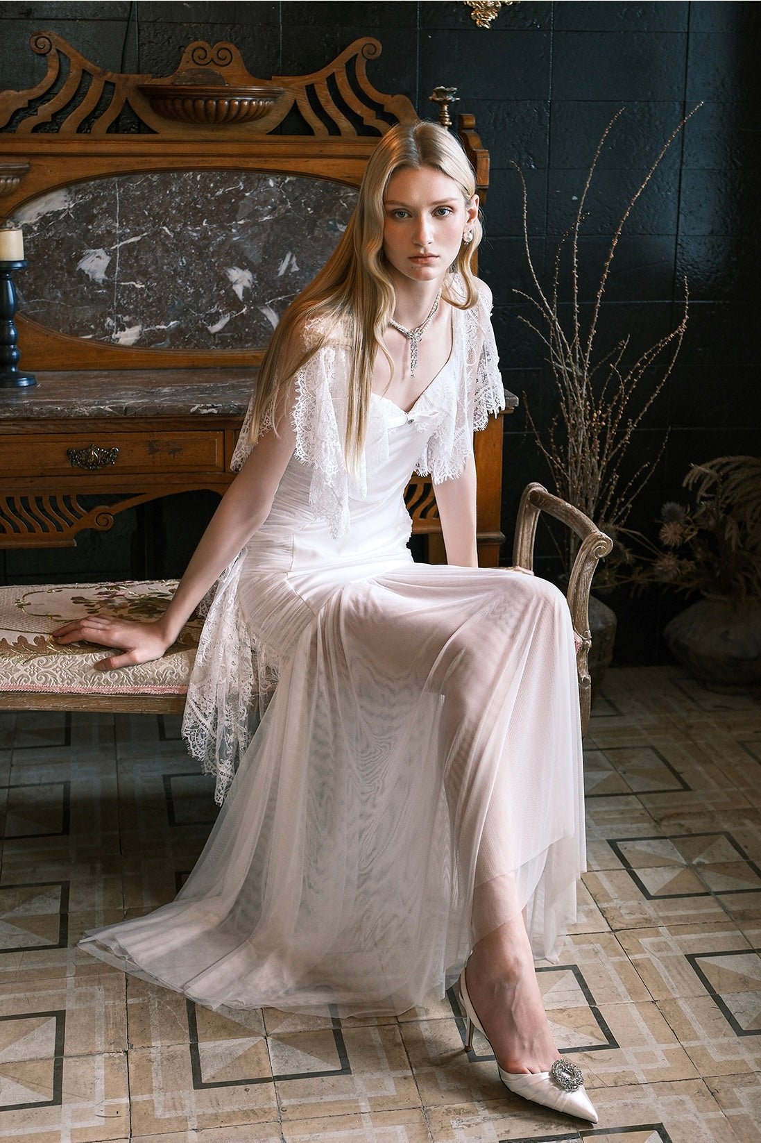 Down the sides, an asymmetric cascade of ruffled tulle echoes the gathered netting that fans into our signature fishtail hem, creating a fluid line that lengthens the legs and keeps every step romantic. A discreet, silky centre-back zip makes slipping in and out effortless, because elegance should never be a struggle.