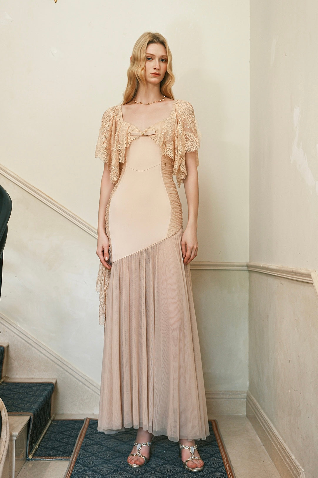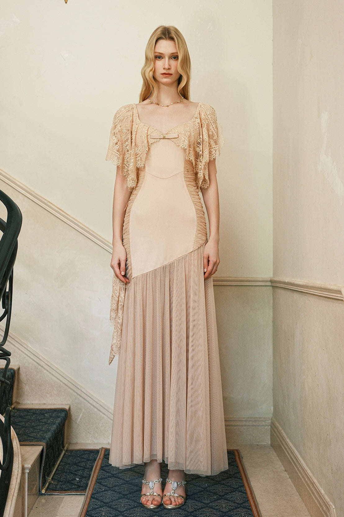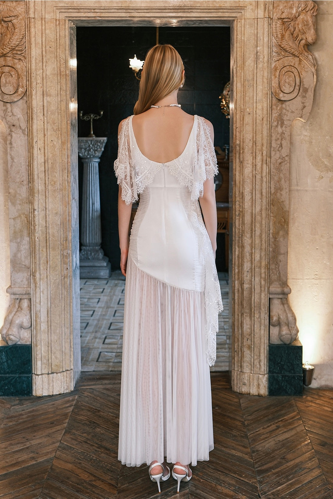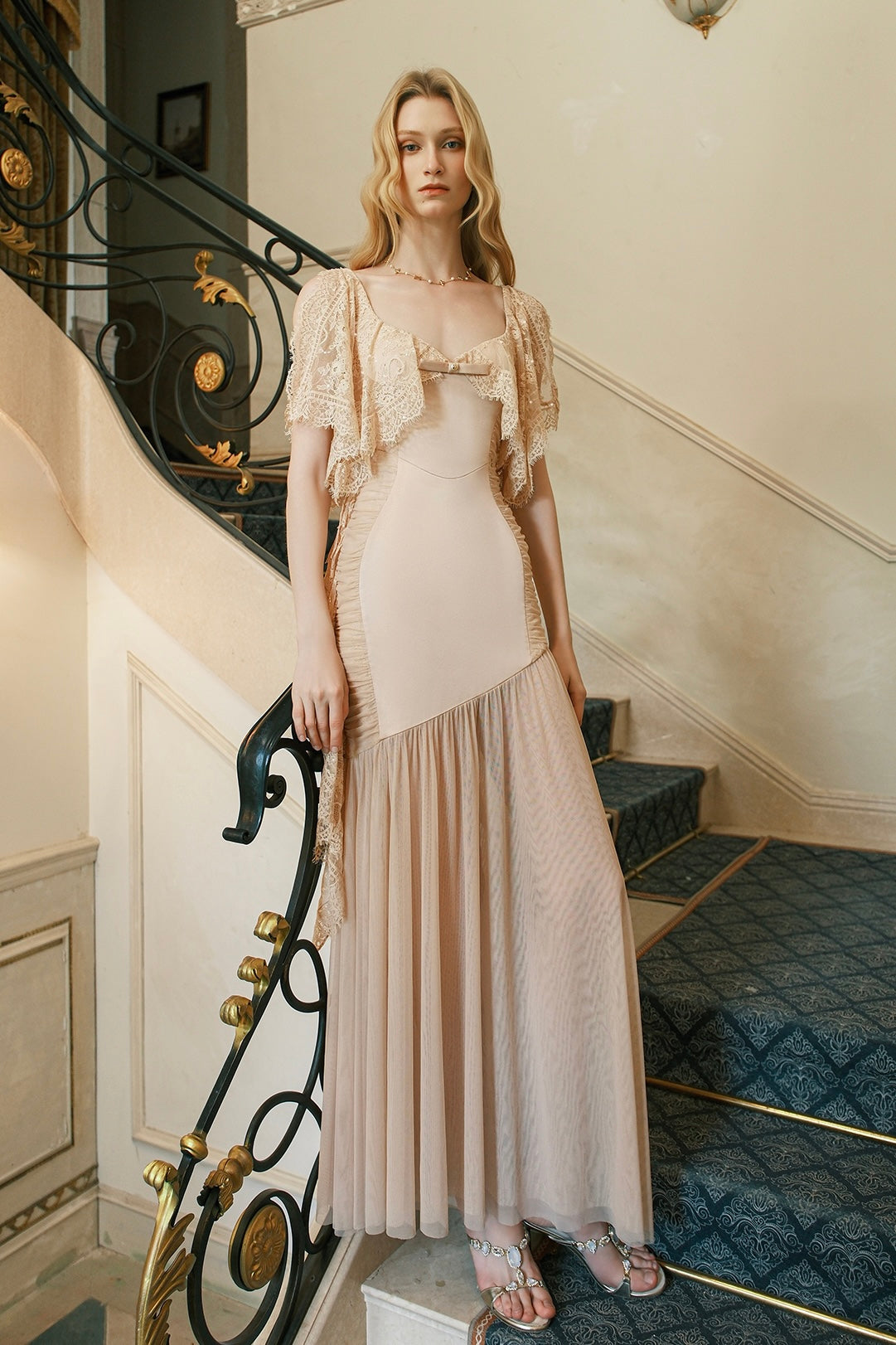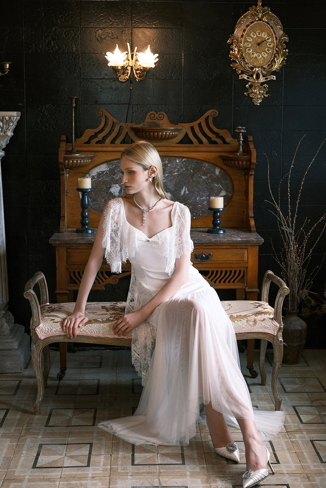 Down the sides, an asymmetric cascade of ruffled tulle echoes the gathered netting that fans into our signature fishtail hem, creating a fluid line that lengthens the legs and keeps every step romantic. A discreet, silky centre-back zip makes slipping in and out effortless, because elegance should never be a struggle.