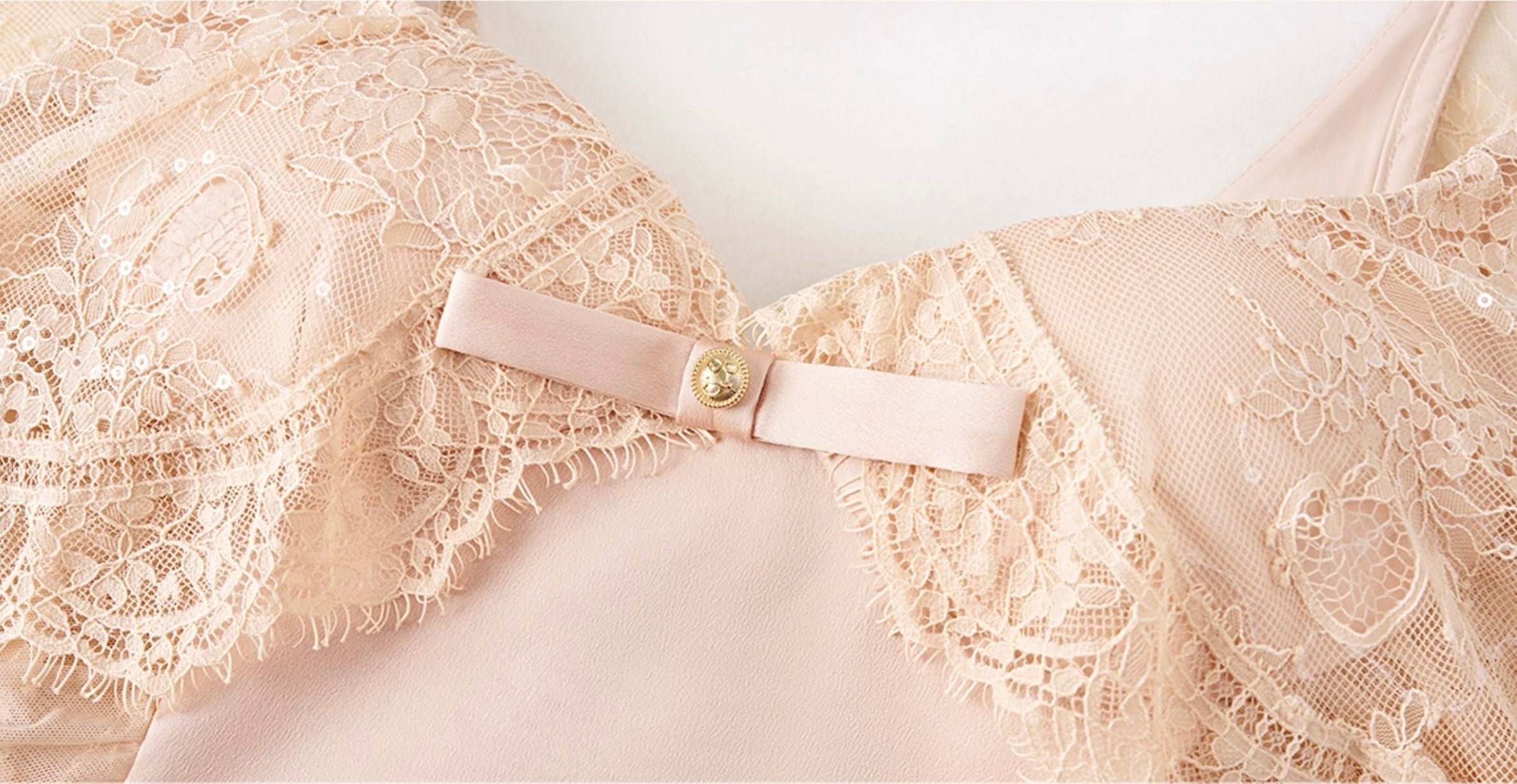 Our corseted sweetheart skims the figure in high-density lustrous satin that feels silk-meets-acetate smooth, lightly cool against the skin and never sheer. Built-in cups mean you can skip the bra, while clever inverted-triangle lace at the shoulders smooths and flatters in one chic move.