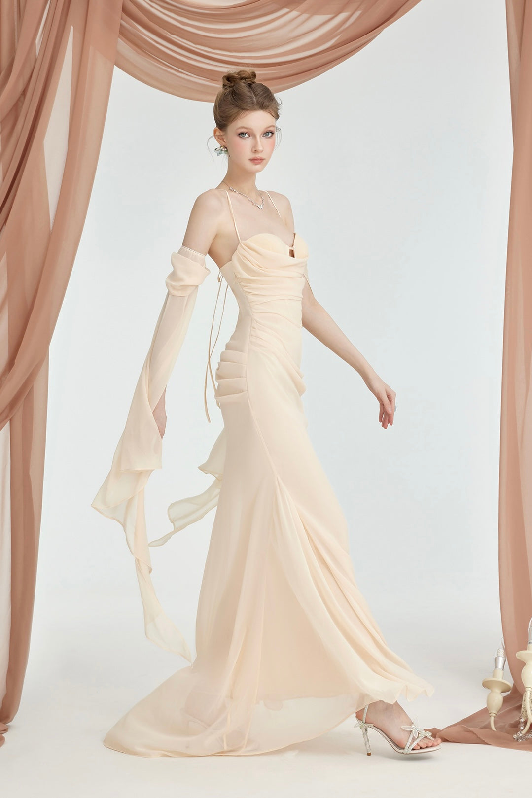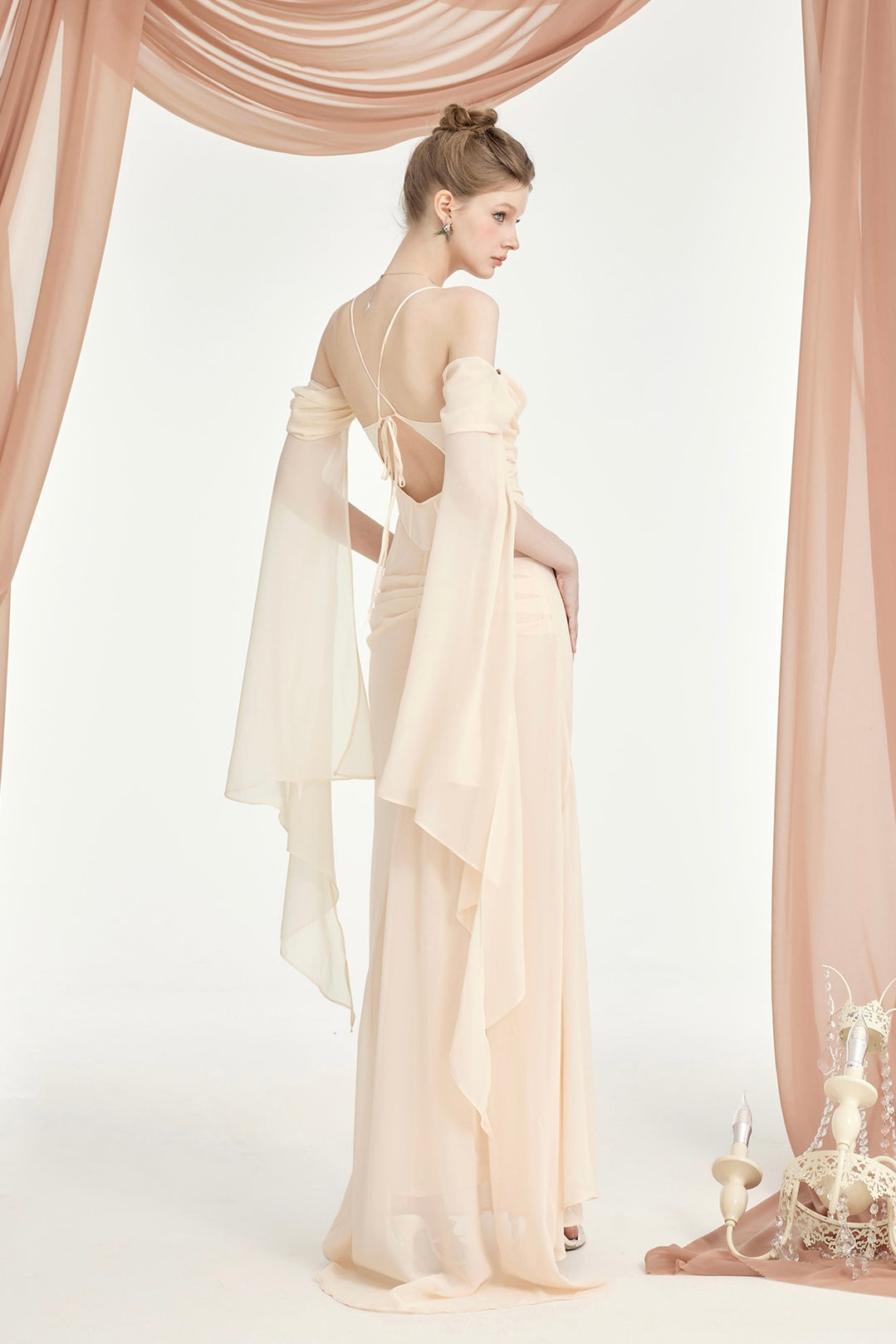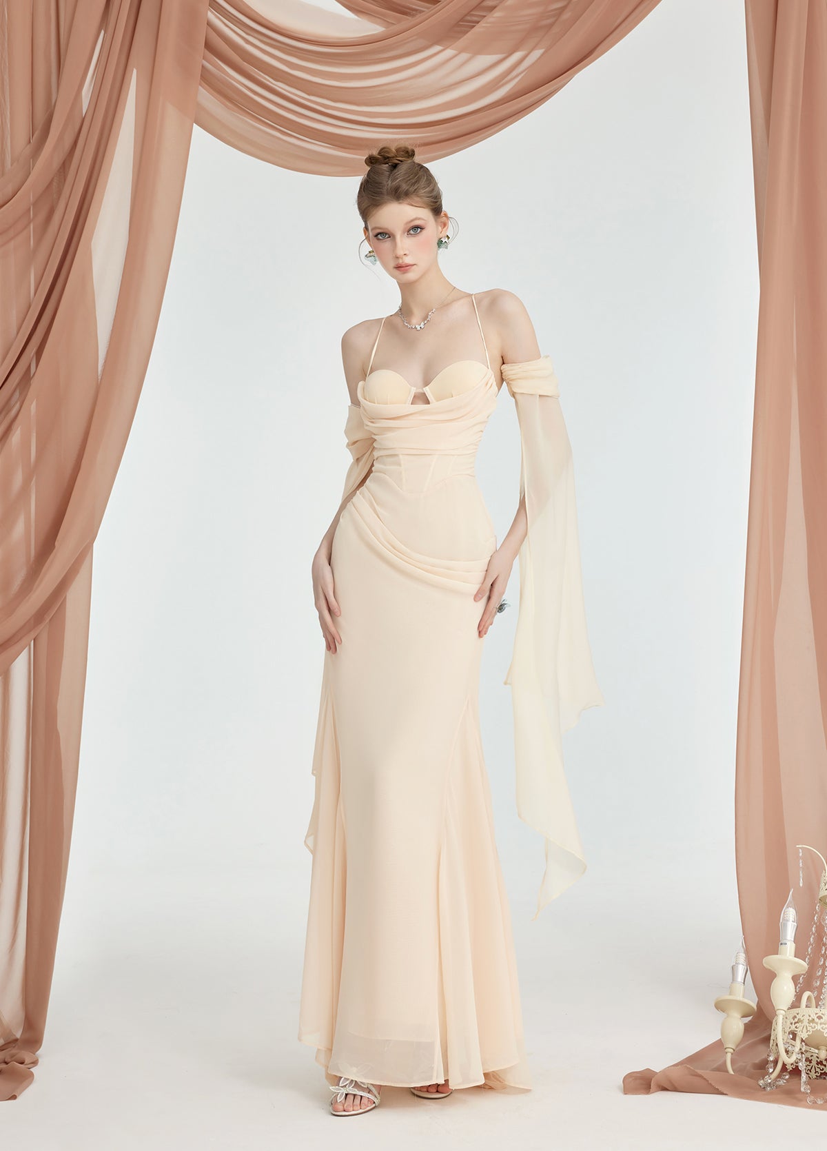 The built-in cups give light support without needing a bra, and the off-shoulder sleeve drapes can be styled on or off, depending on your mood (or the occasion). We’re obsessed with the dreamy, trailing fishtail hem, it swishes and floats with every step, made from triple-layered chiffon that’s lightweight, breathable, and ethereally soft.