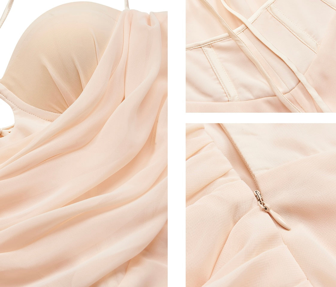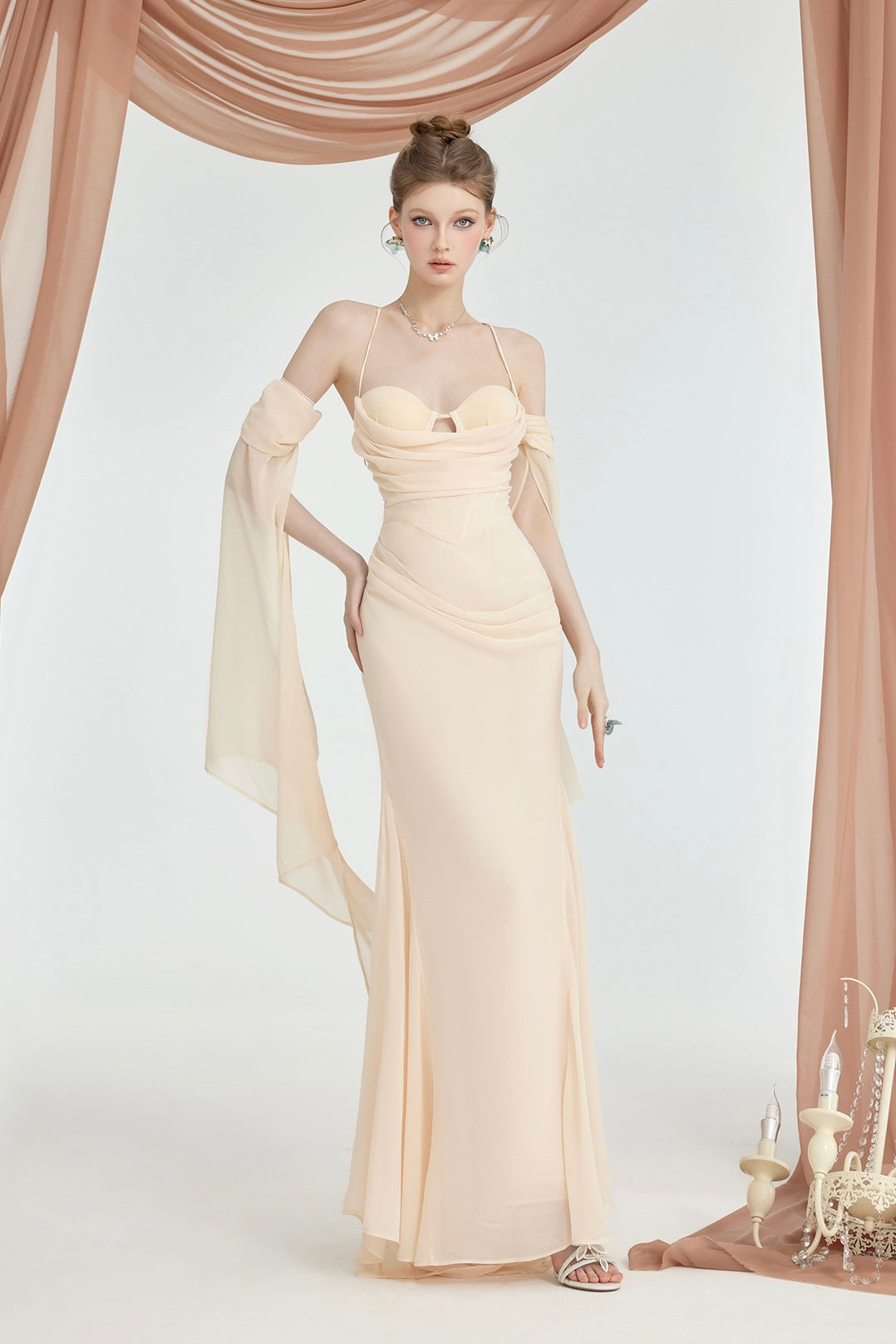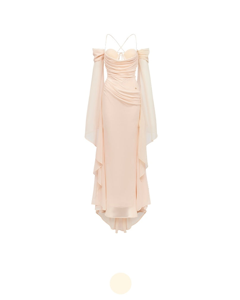 The built-in cups give light support without needing a bra, and the off-shoulder sleeve drapes can be styled on or off, depending on your mood (or the occasion). We’re obsessed with the dreamy, trailing fishtail hem, it swishes and floats with every step, made from triple-layered chiffon that’s lightweight, breathable, and ethereally soft.