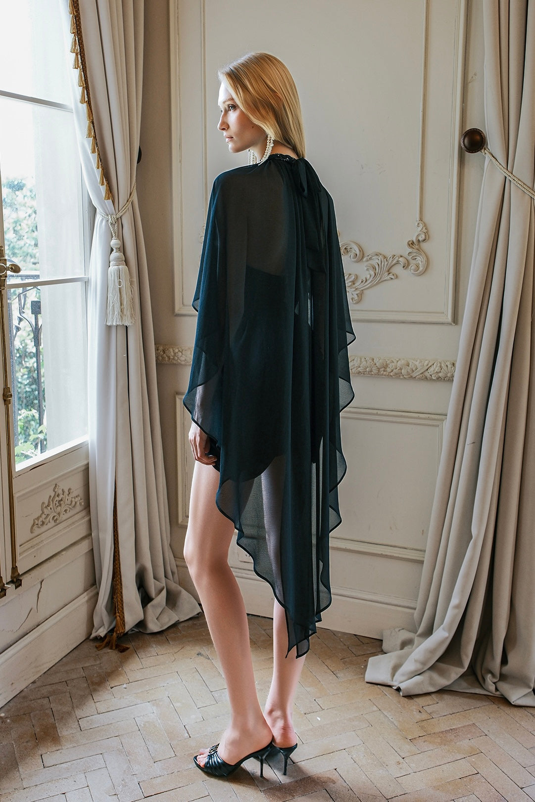 Choose your mood: ‘Vedette’ comes in Phantom Black for after-dark intrigue, Soft Mist Pink for champagne brunches, and Almond Tan when neutral elegance calls. Style the draped ties as a wraparound scarf, a flowing sash, or let them trail. Either way, the compliments follow.