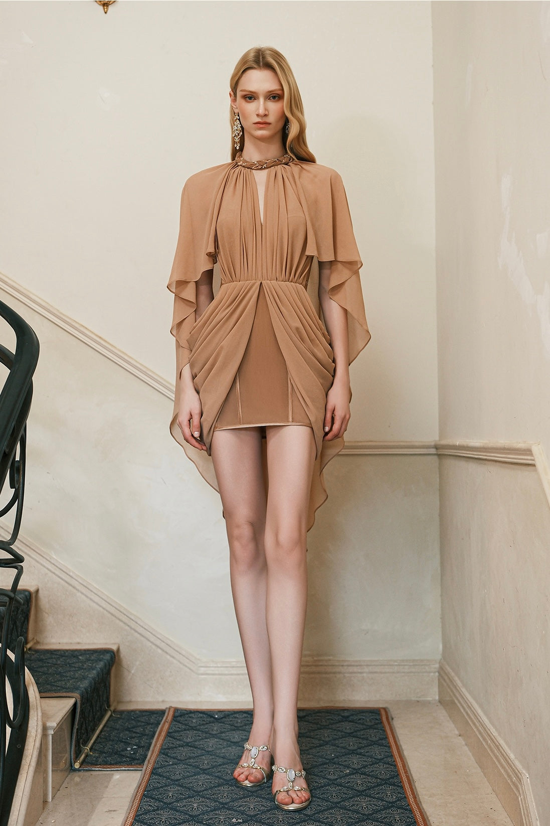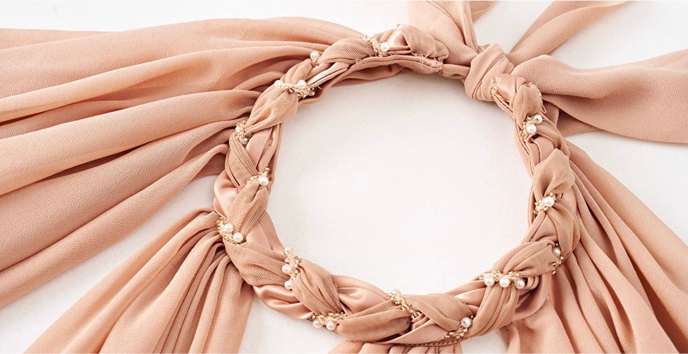 Soft chiffon cascades from the braided-pearl halter neck, falling into a cape-like overlay that can be tied, draped, or left to billow behind you for pure movie-moment magic. A built-in bra (complete with anti-slip tape) keeps things confidently in place, while subtle fishbone panelling through the skirt sculpts the waist before spilling into those sculptural, petal-pleat panels we love for an effortless hourglass illusion.