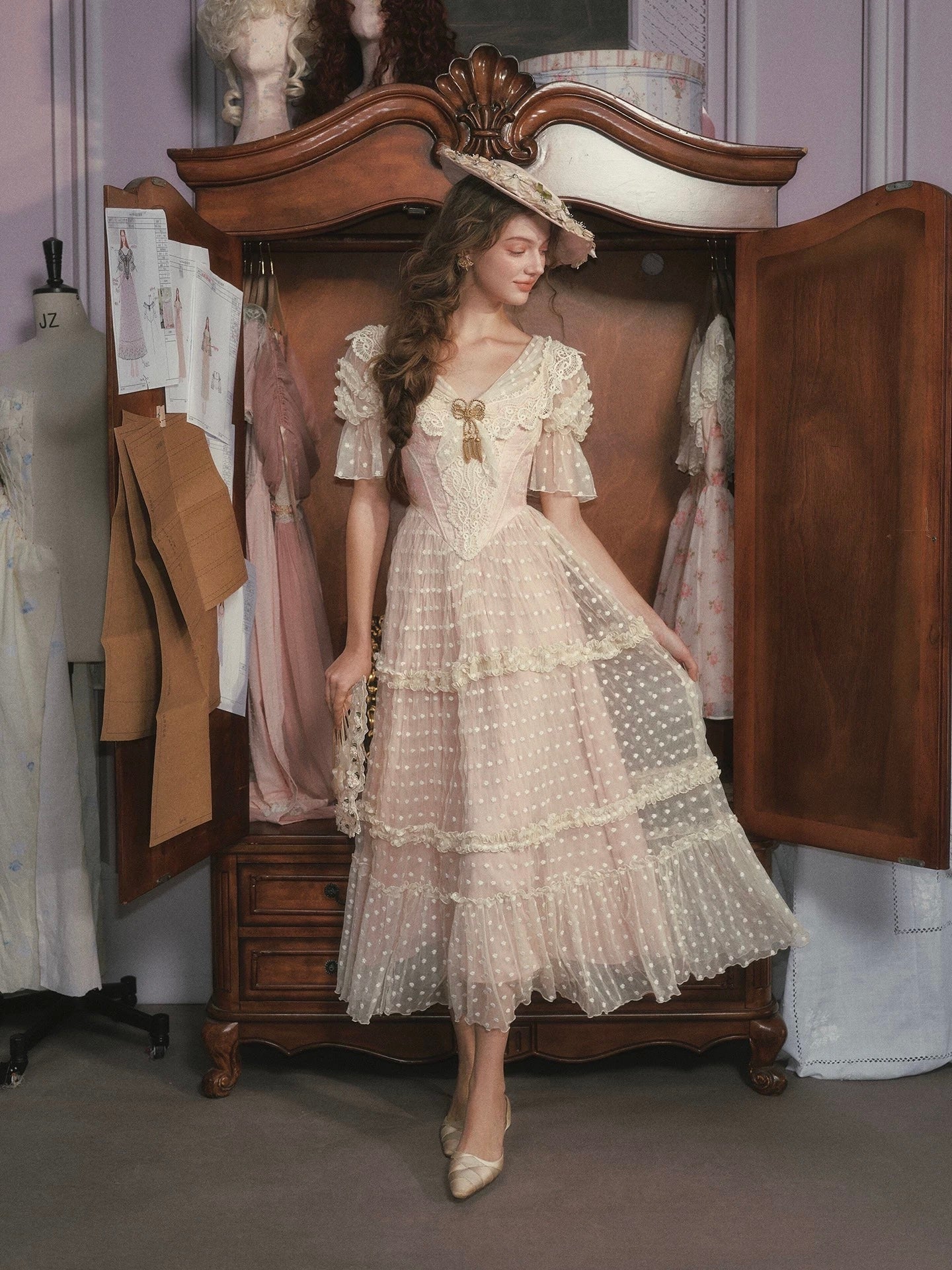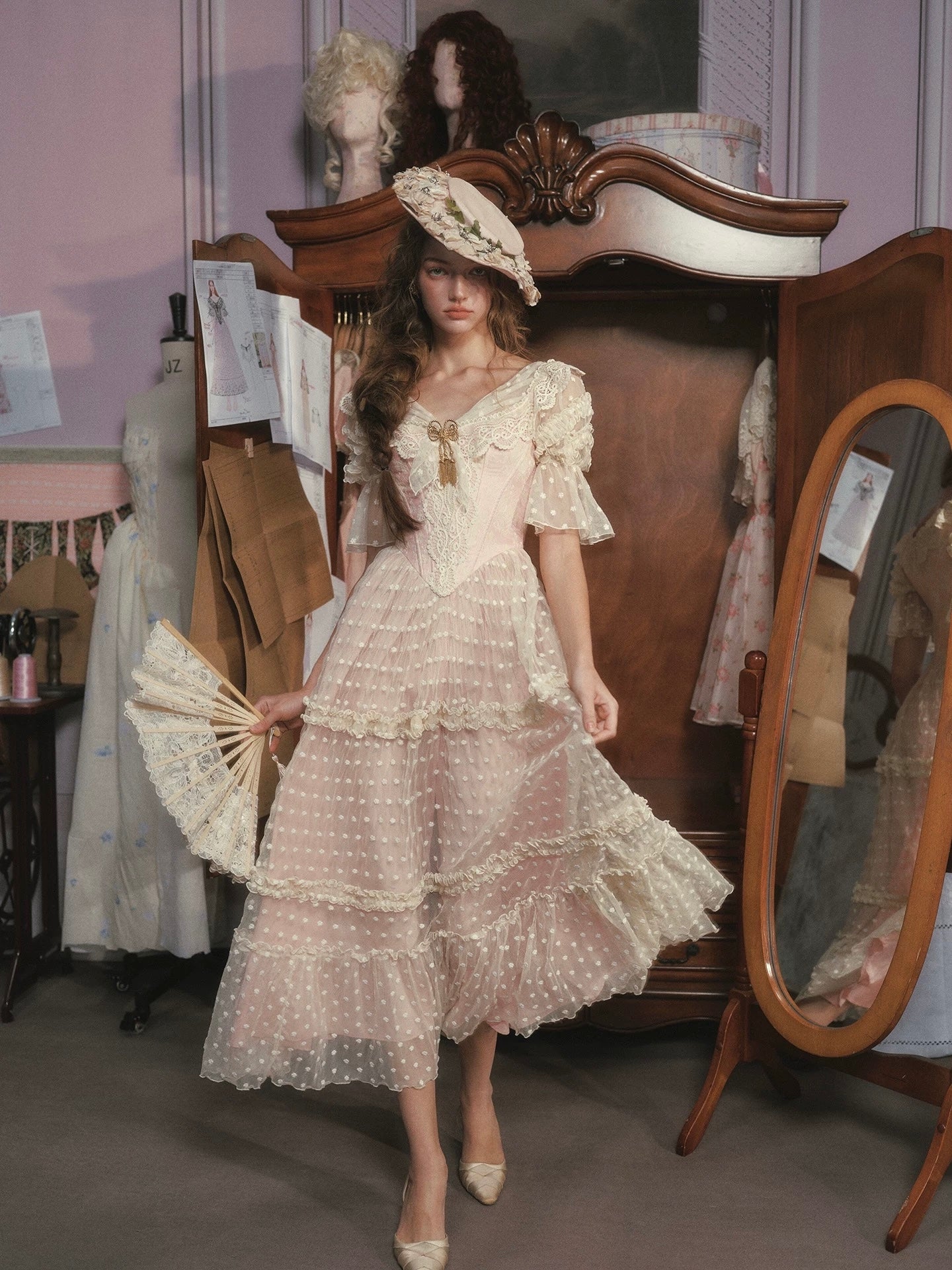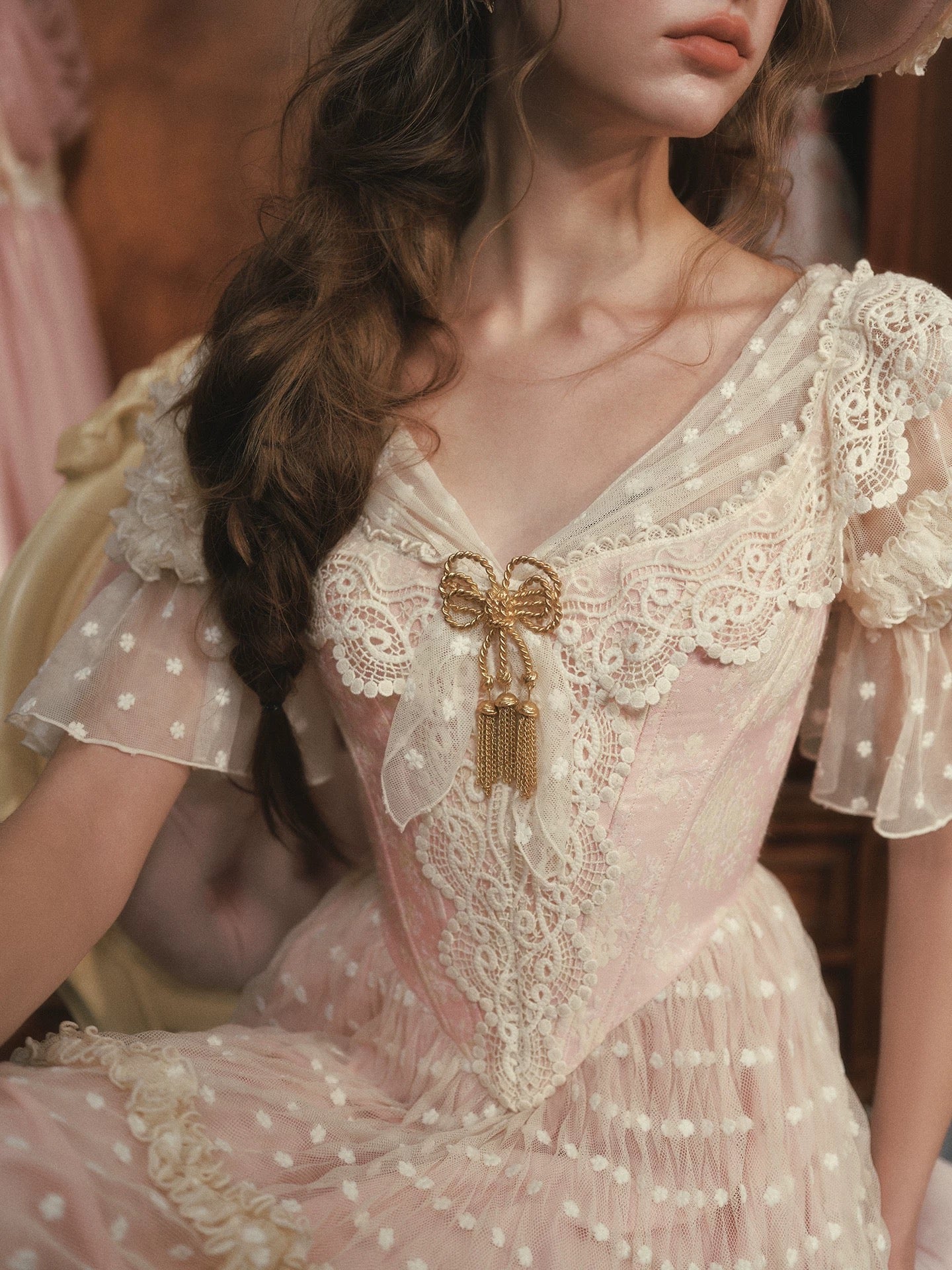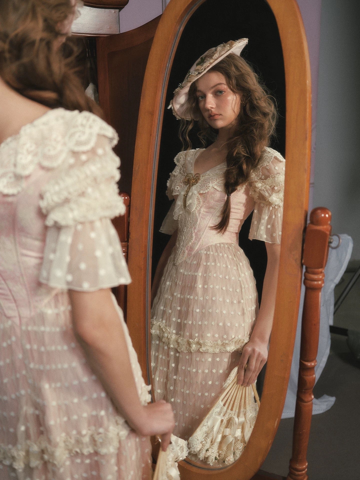 Vintage blush, modern savoir-faire. Cut from airy, crinkled dotted tulle layered over a silky blush base, ‘Blush Rhapsody’ balances delicacy with structure in the most effortless way. Classic puff sleeves frame the shoulders with sheer lightness, while discreet metal fishbone boning gently sculpts the waist without ever feeling restrictive.