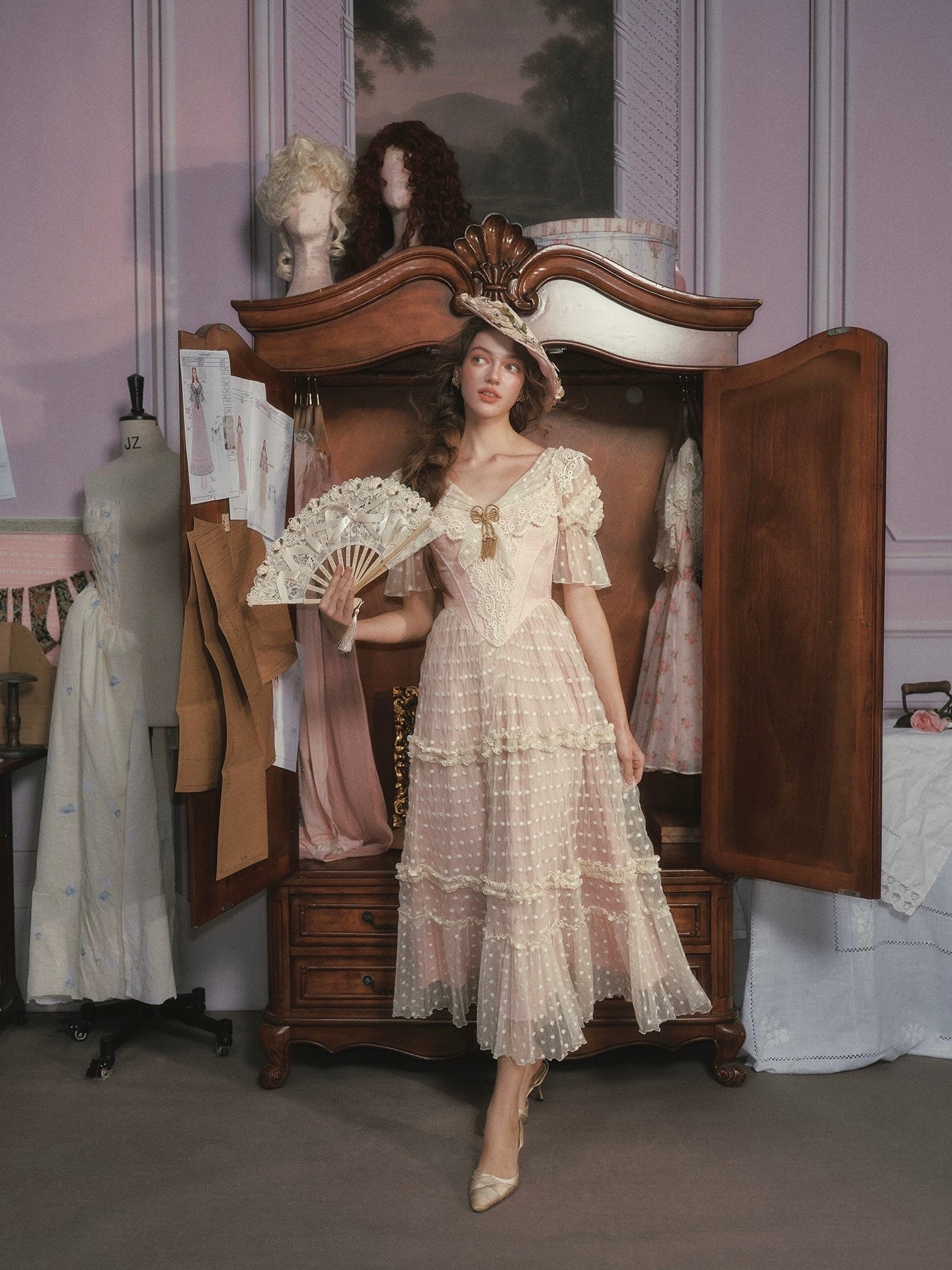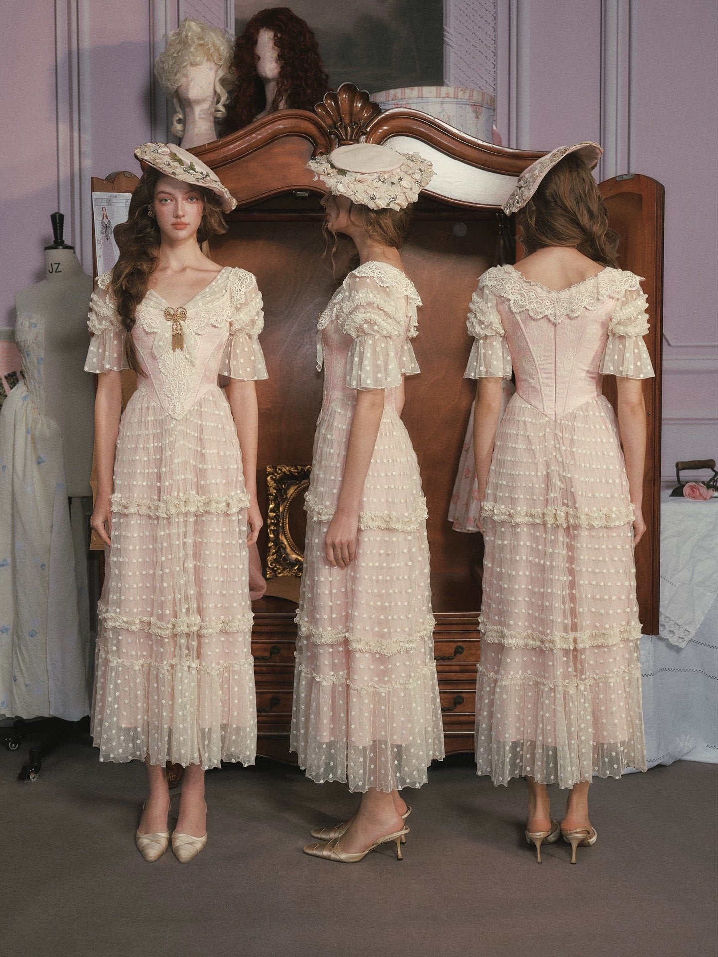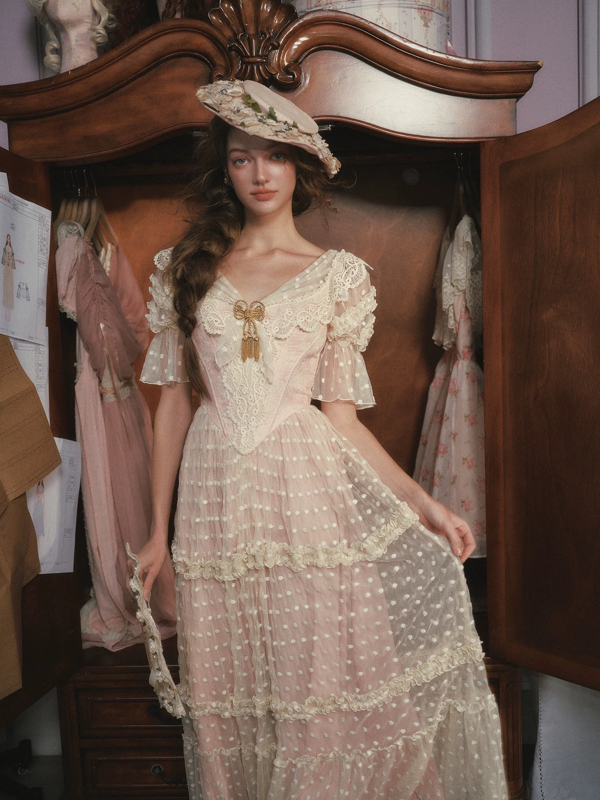 Vintage blush, modern savoir-faire. Cut from airy, crinkled dotted tulle layered over a silky blush base, ‘Blush Rhapsody’ balances delicacy with structure in the most effortless way. Classic puff sleeves frame the shoulders with sheer lightness, while discreet metal fishbone boning gently sculpts the waist without ever feeling restrictive.