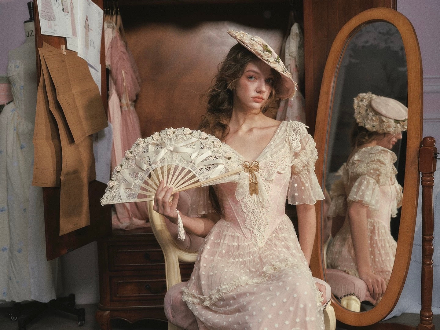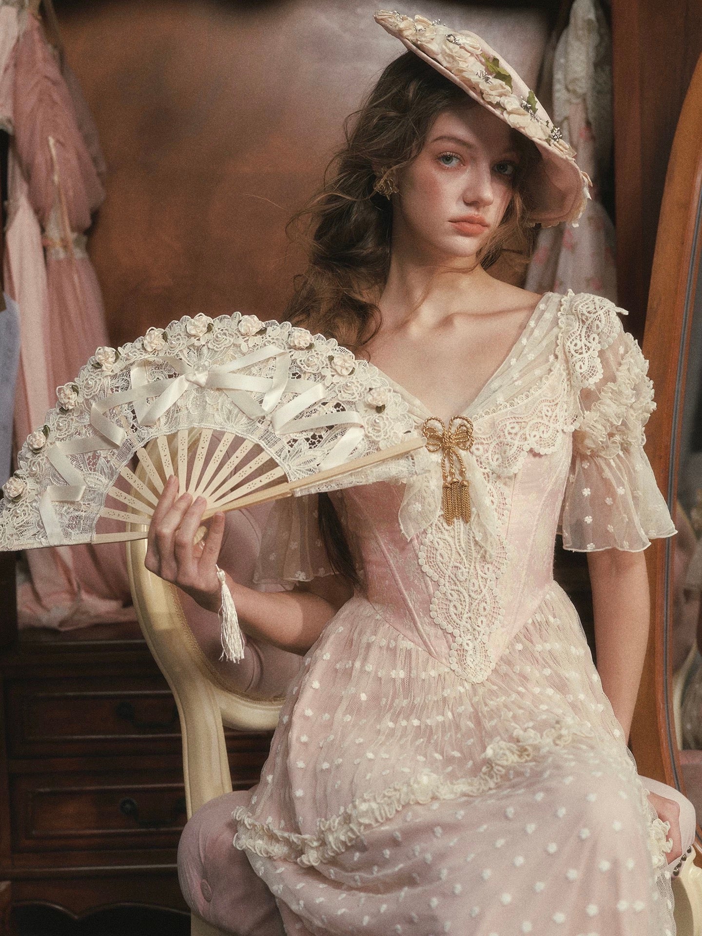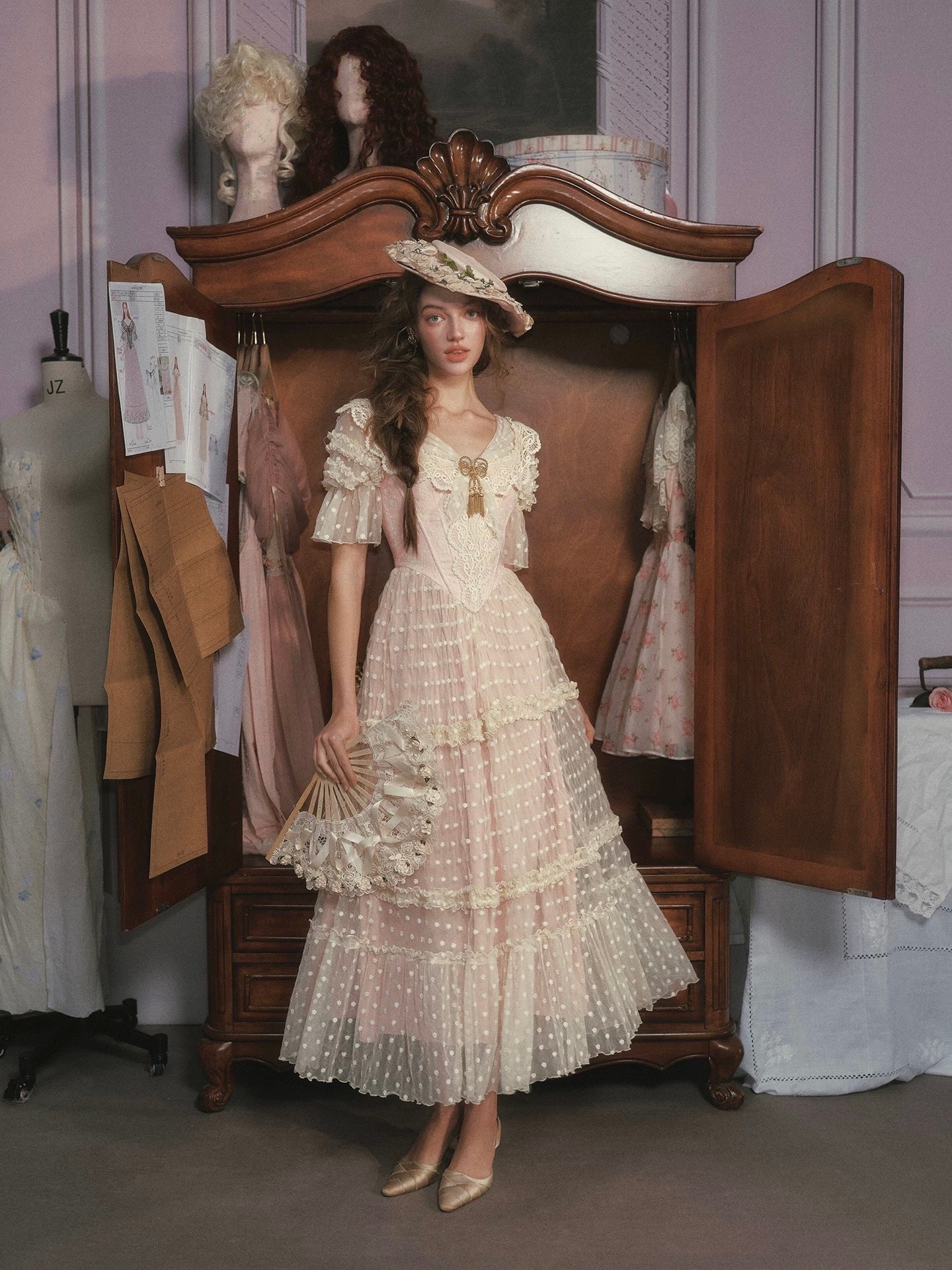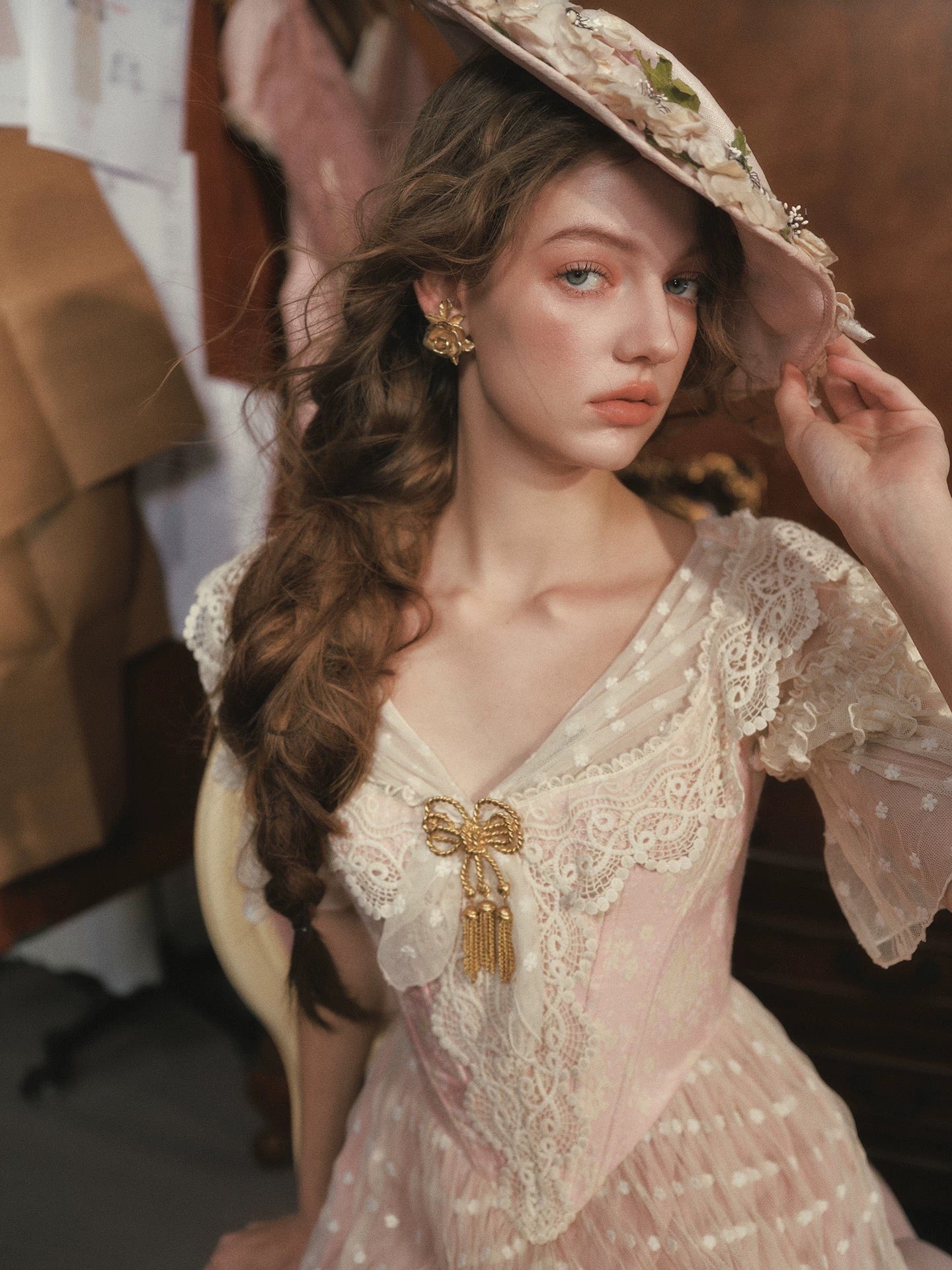 Vintage blush, modern savoir-faire. Cut from airy, crinkled dotted tulle layered over a silky blush base, ‘Blush Rhapsody’ balances delicacy with structure in the most effortless way. Classic puff sleeves frame the shoulders with sheer lightness, while discreet metal fishbone boning gently sculpts the waist without ever feeling restrictive.