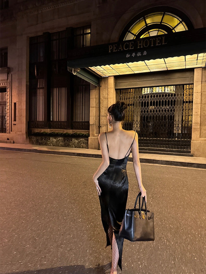 The silhouette is clean yet thoughtful. A sculpted bodice flatters the chest with understated poise, while delicate black zircon buttons on the straps add a subtle edge. At the waist, hidden tailoring pulls gently inward, creating definition without restriction.