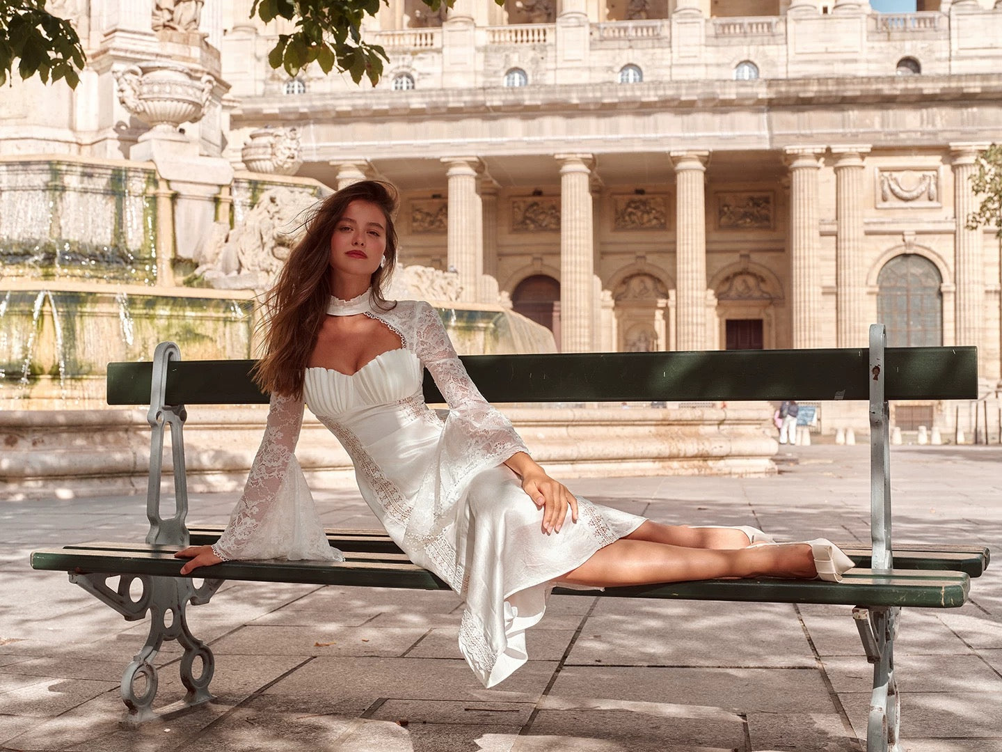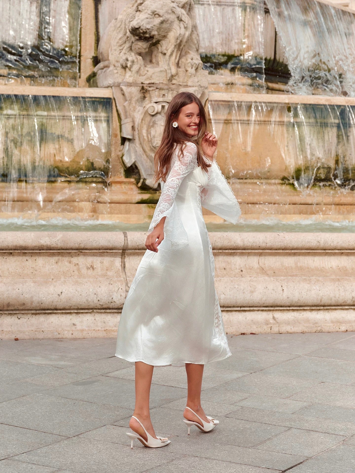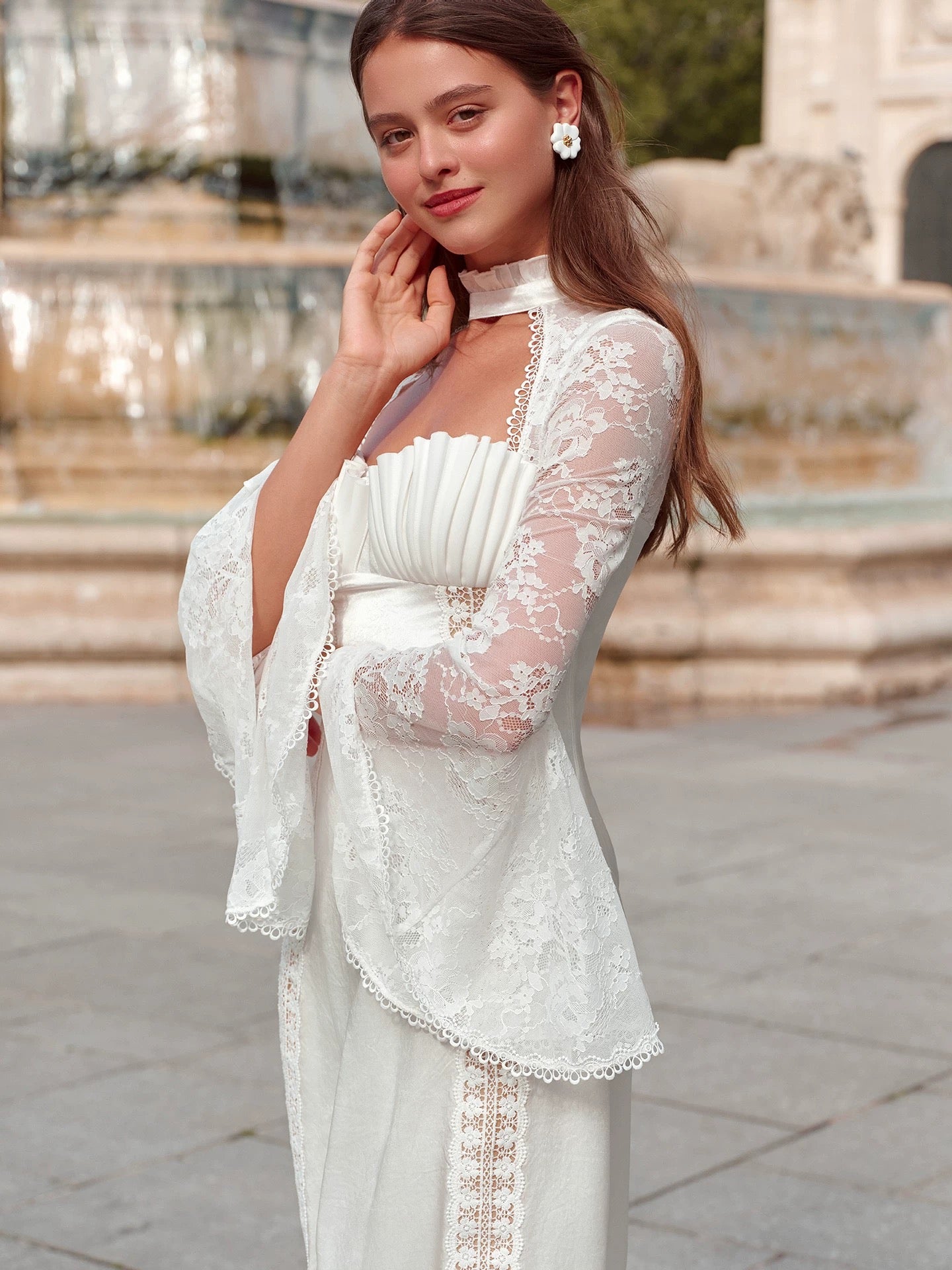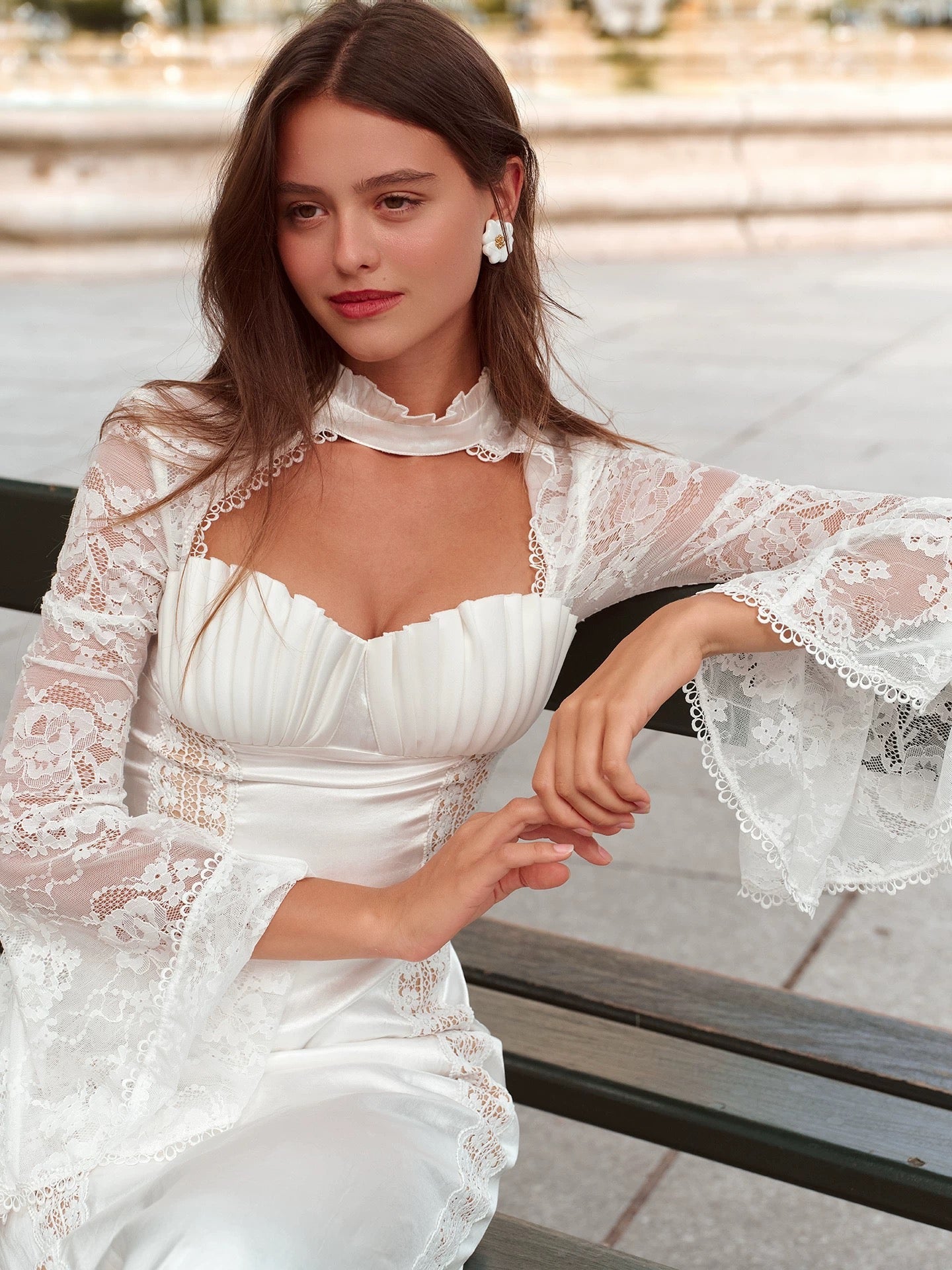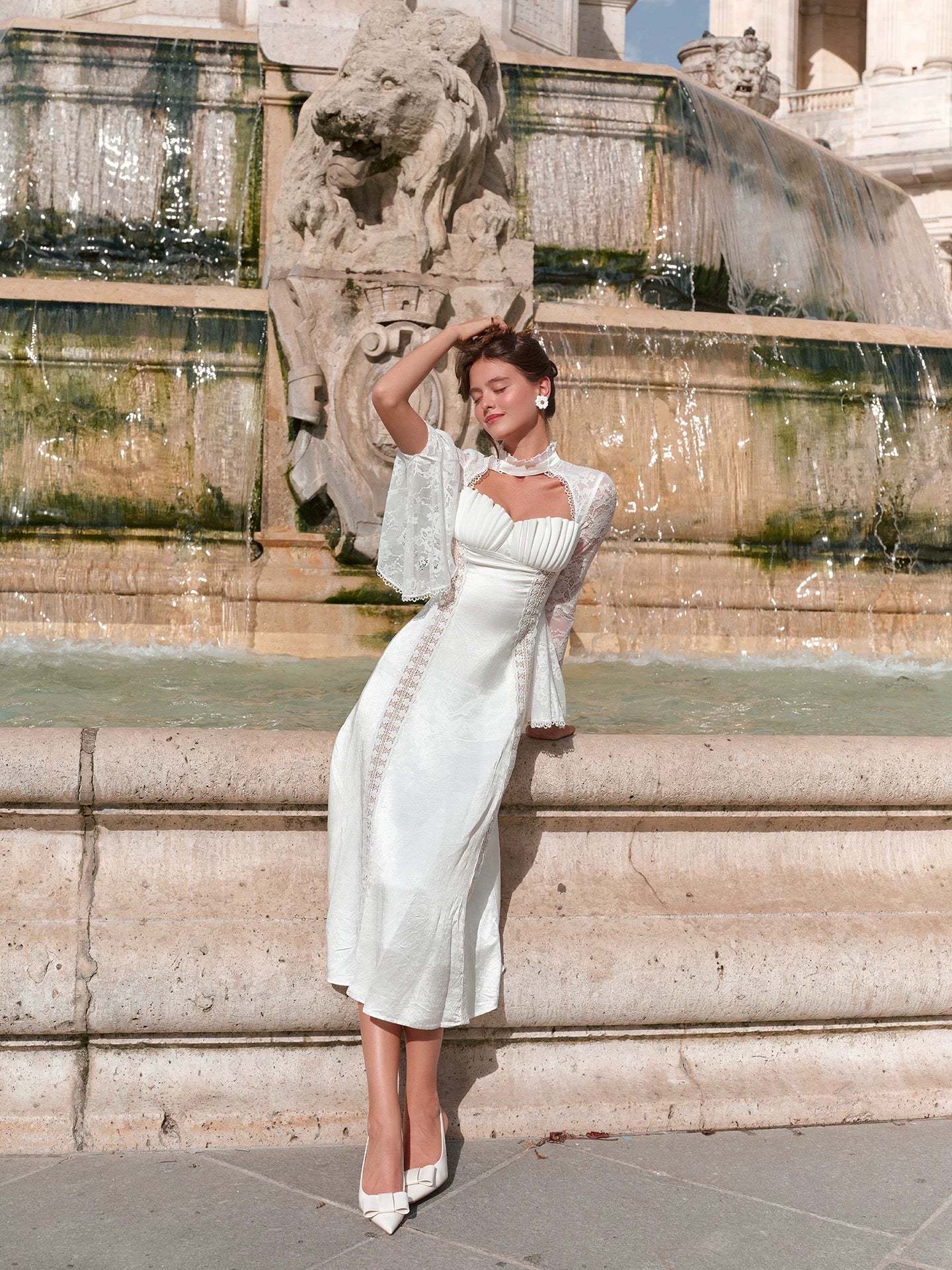 Then comes the skirt: lace patchwork panels ripple with texture, adding depth, movement, and just the right hint of romance as you walk. Classic flared sleeves refine your arms with an elegant flutter, because who doesn’t love a little theatrical swish?