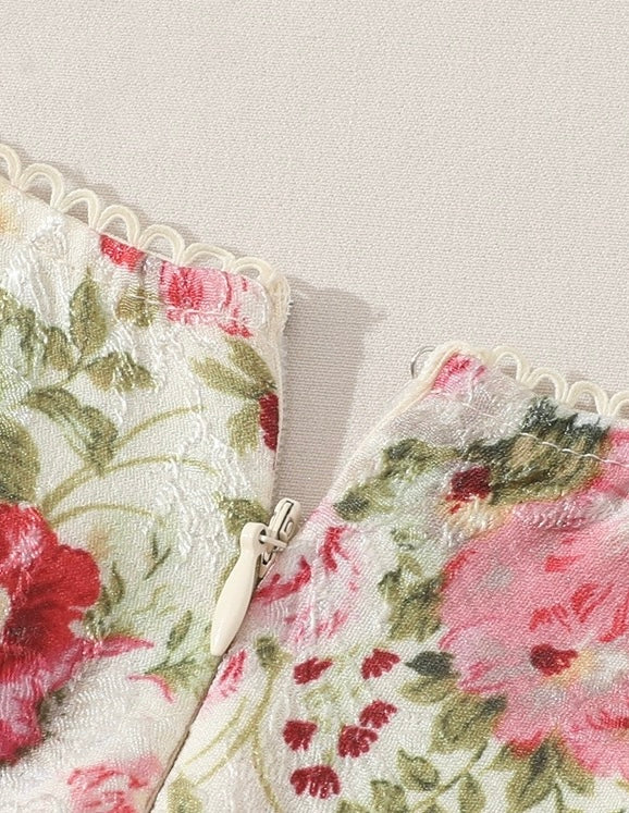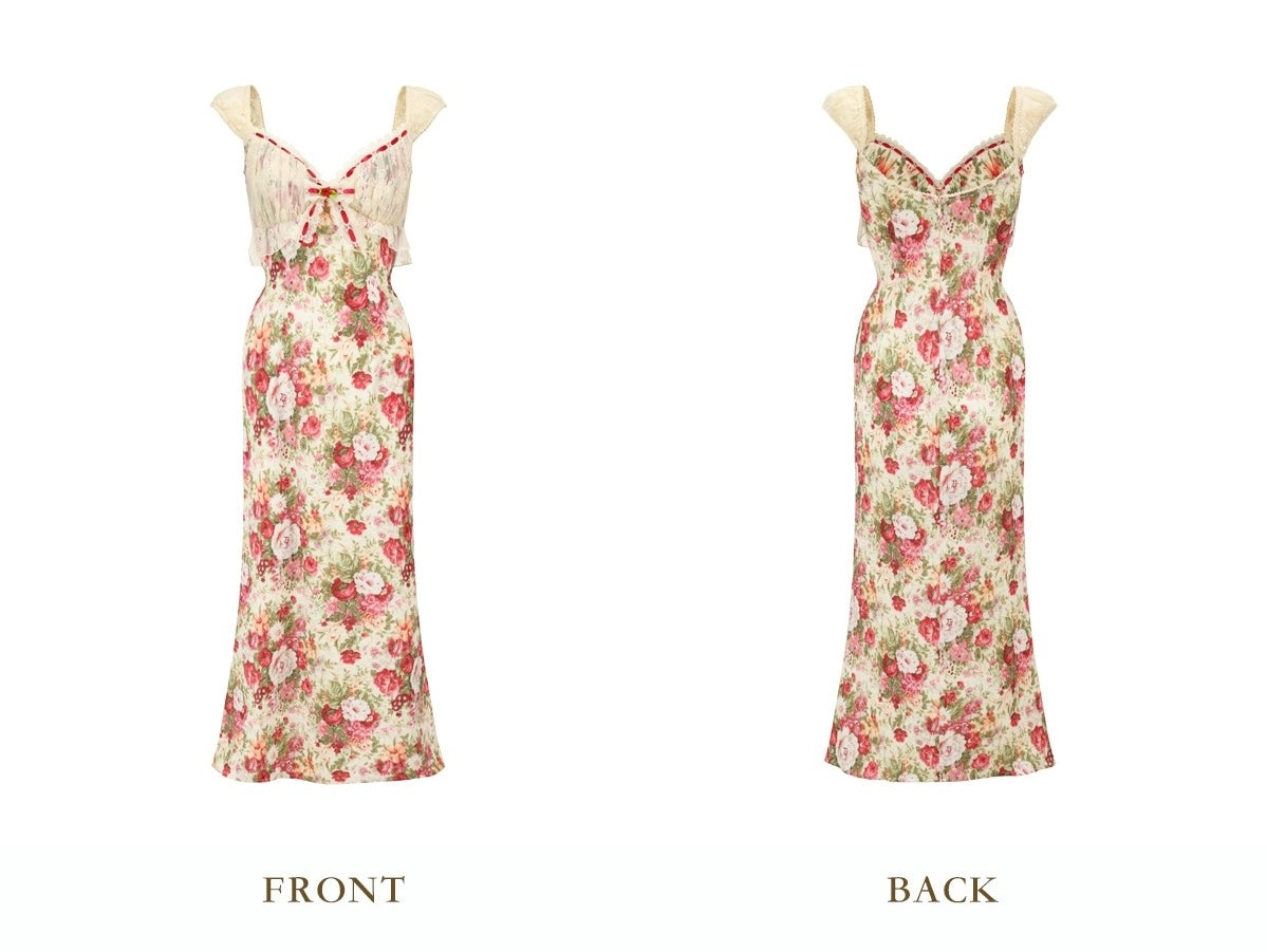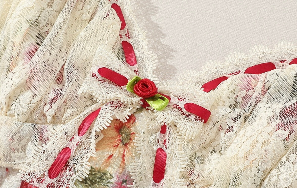 The lace-trimmed neckline is finished with woven ribbon detailing and a handcrafted lace flower at the centre, instantly drawing the eye with its delicate, antique-inspired finish. Layered lace bust cups add soft structure and dimension, while the gentle frill under the bust creates that sweet, romantic silhouette we can’t get enough of.