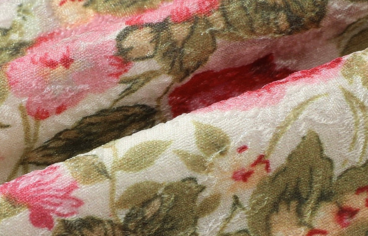 Crafted from a beautifully textured jacquard base fabric, ‘Milynda’ features a subtle raised pattern that mimics a sculpted, almost relief-like finish, giving the floral print extra depth and richness while remaining incredibly soft and comfortable against the skin. The print itself is finely detailed and painterly, designed to feel both romantic and refined.