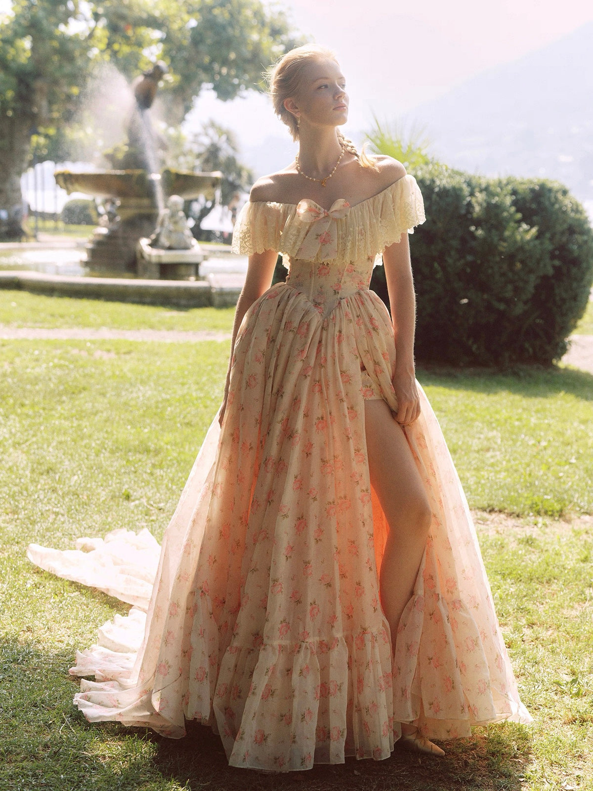 Rose vines bloom delicately along the bodice, evoking early morning light and the quiet unfolding of self-belief.