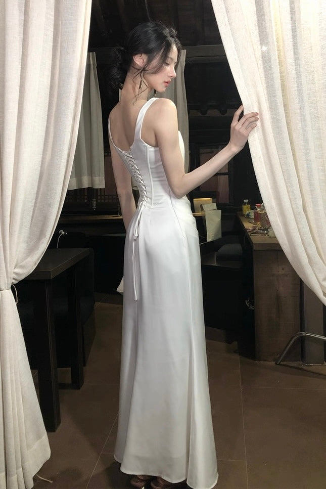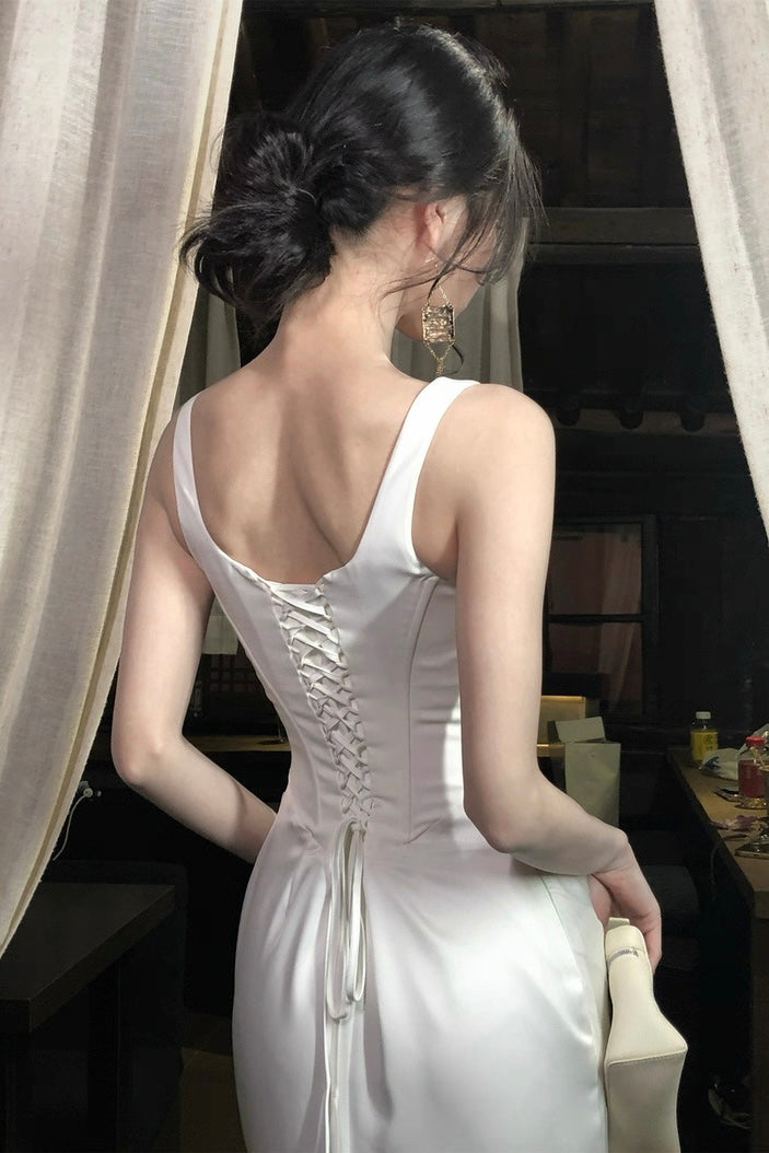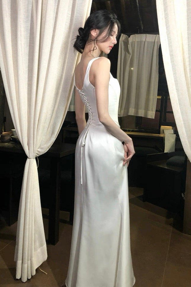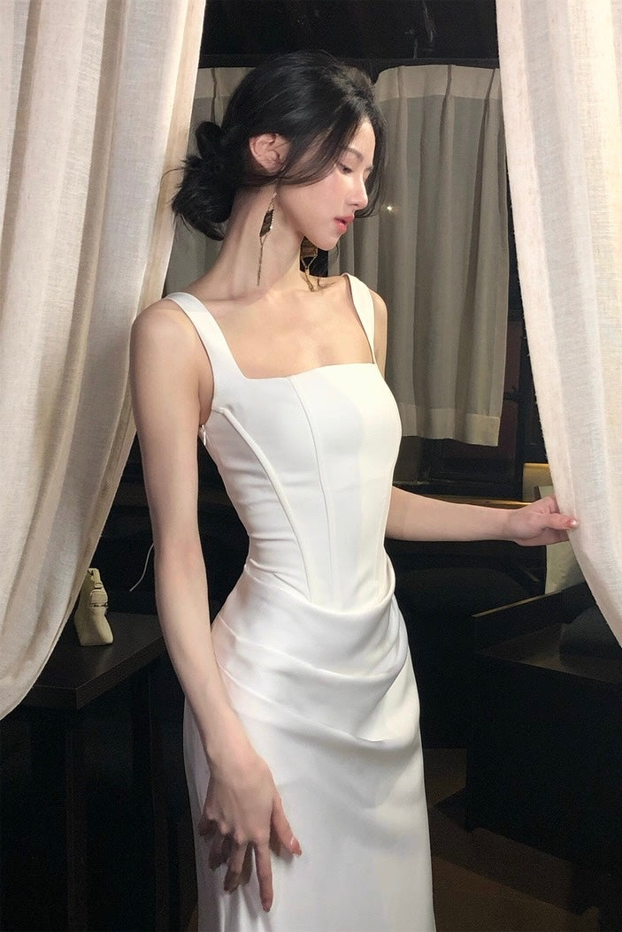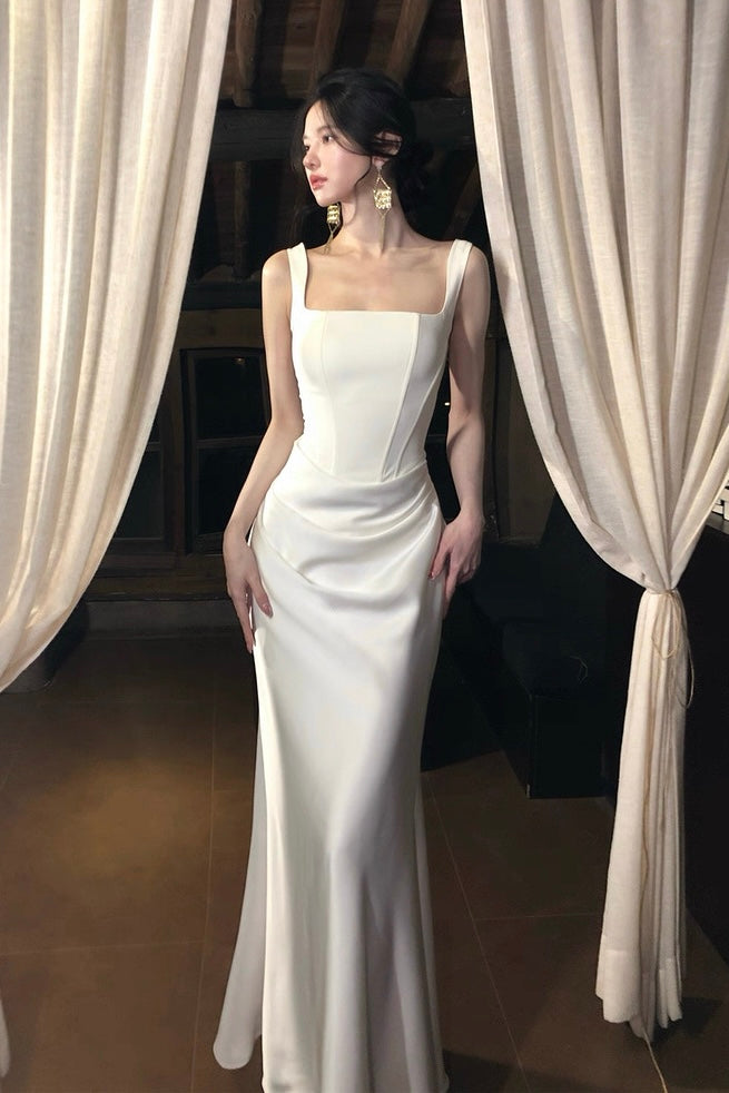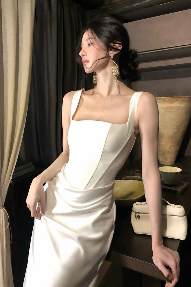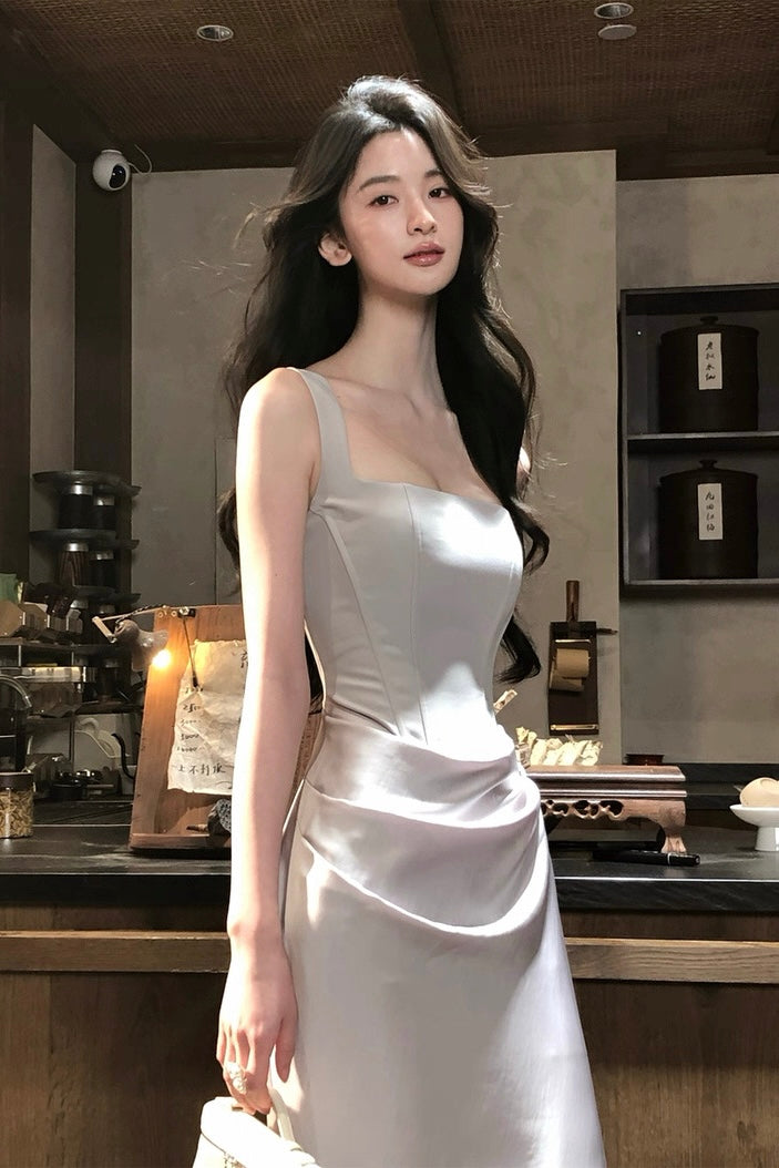 We selected a slightly stretch TR fabric for the bodice so you stay comfortable without feeling restricted, while the matching satin skirt carries a luminous, high-shine finish that catches the light with every step. Smooth, fluid, and quietly opulent. The boning channels are finished with invisible stitching so everything lies flat against the body, structured yet never uncomfortable.