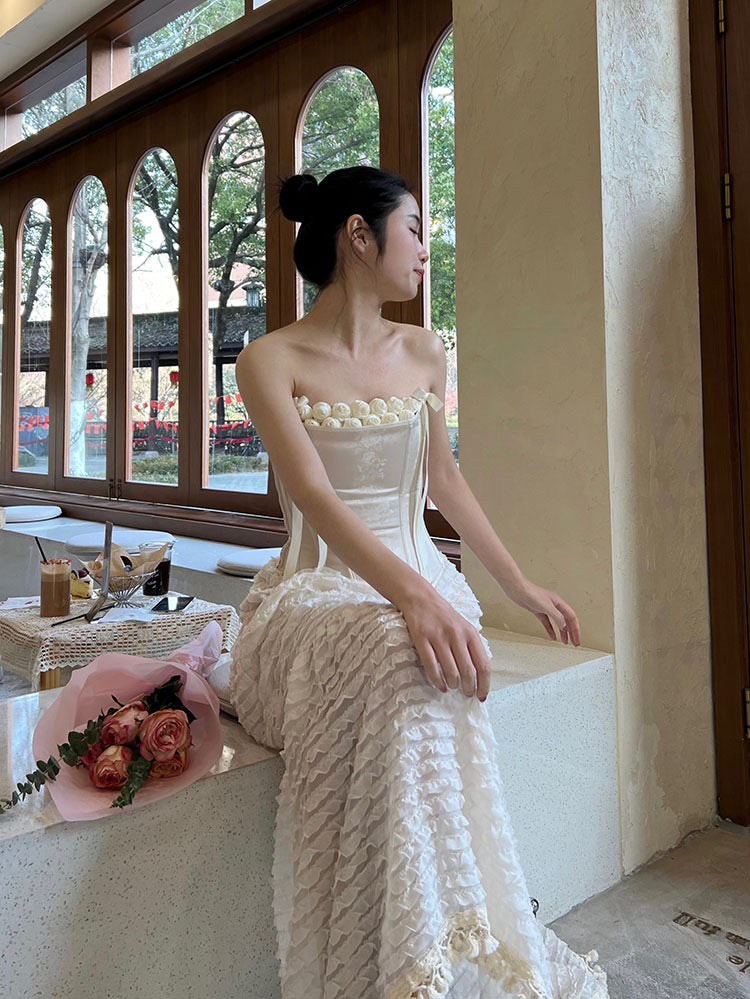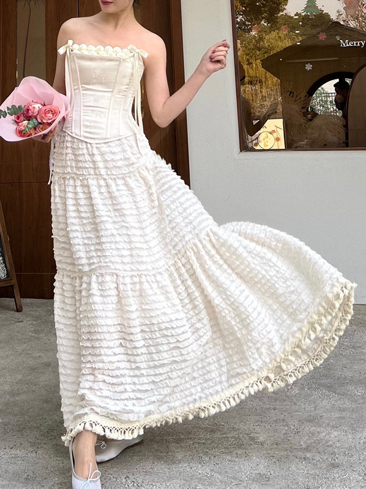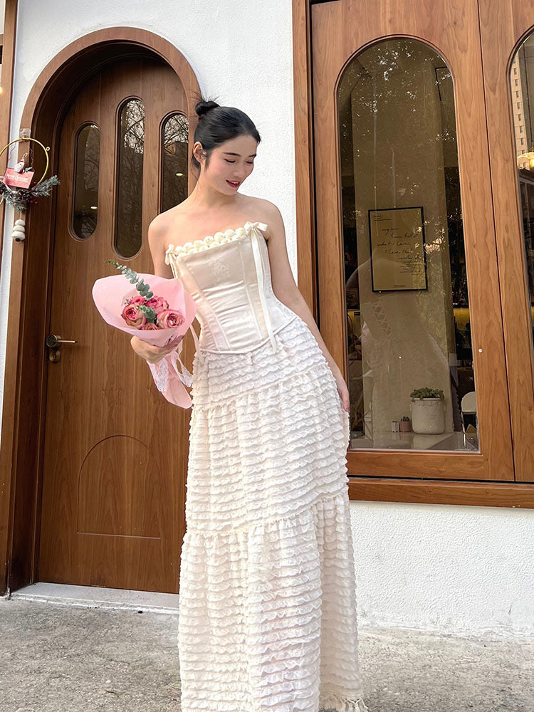 Our structured corset silhouette is cut from a luminous silk blend jacquard with a subtle floral motif woven through the fabric, catching the light in the prettiest way. Designed with sculpting seams and a figure-defining fit, ‘Héloïse’ gently cinches the waist while holding its shape beautifully. The straight neckline is adorned with hand-rolled satin rosettes that bloom across the bust, finished with delicate ribbon bows at each shoulder for that effortlessly feminine touch.