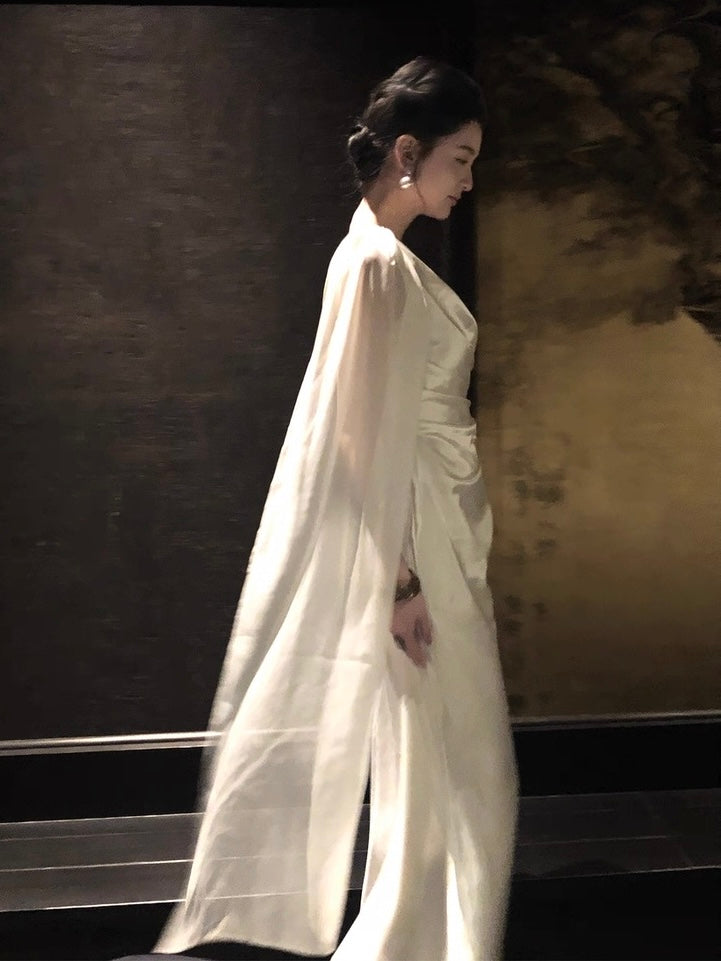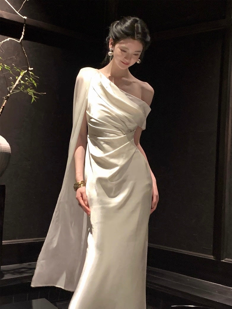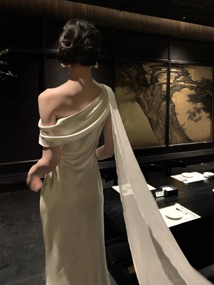 Designed with a single-shoulder neckline and our statement cascading ribbon detail, ‘Libi’ frames the collarbone and elongates the neck so beautifully, giving you that effortless “right-angle shoulder” illusion while the long draped tie floats behind you with every step. Tie it into a bow for a sweet finish or let it fall freely for that soft, hazy goddess energy. You lift your hand and suddenly… it’s pure poésie.