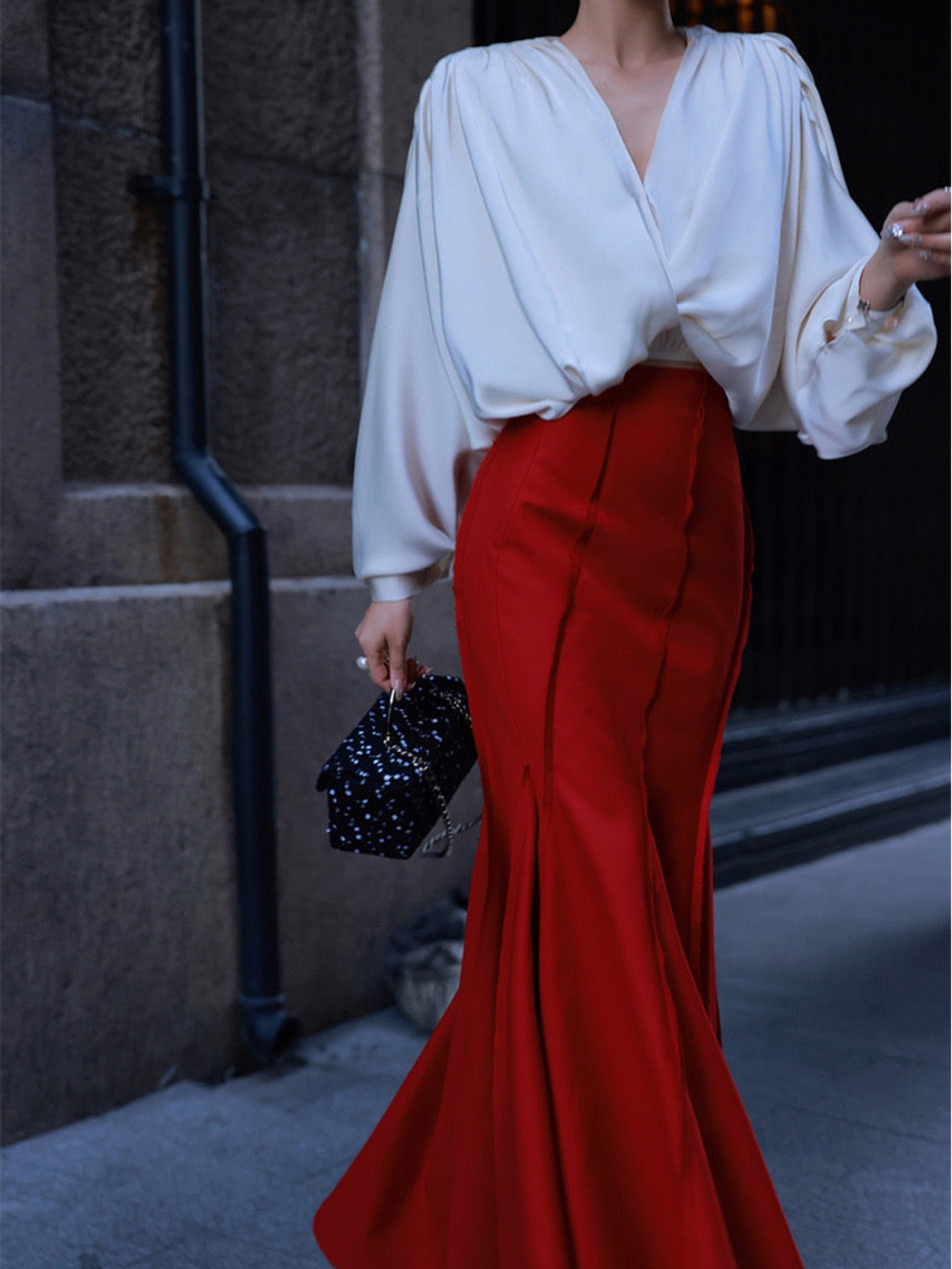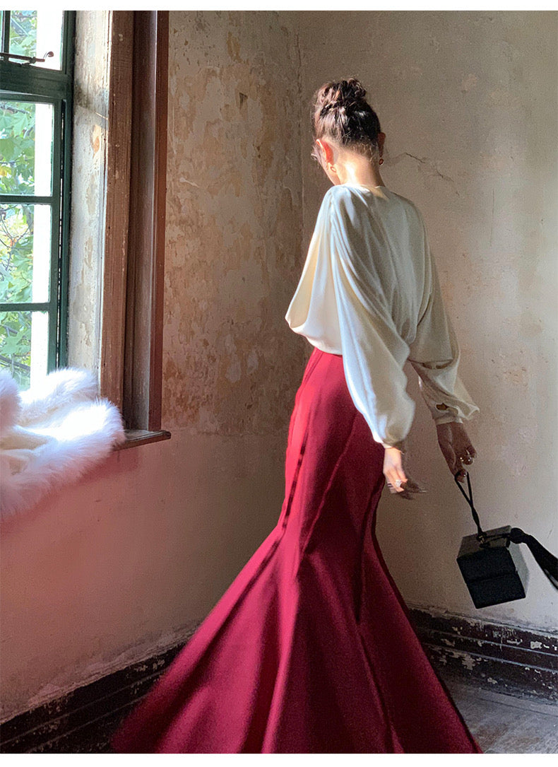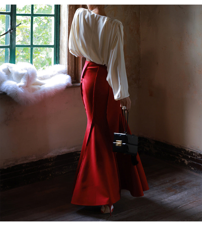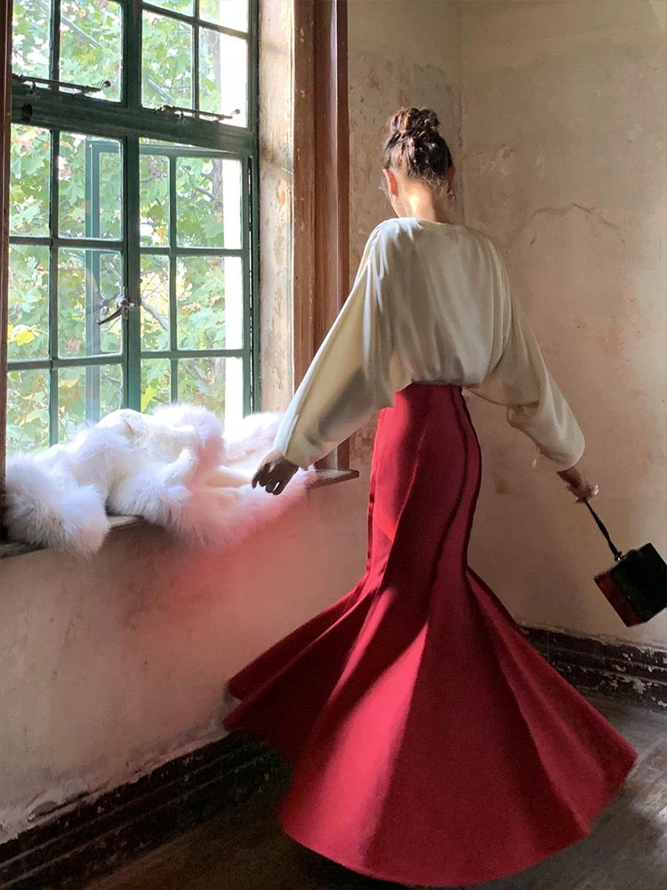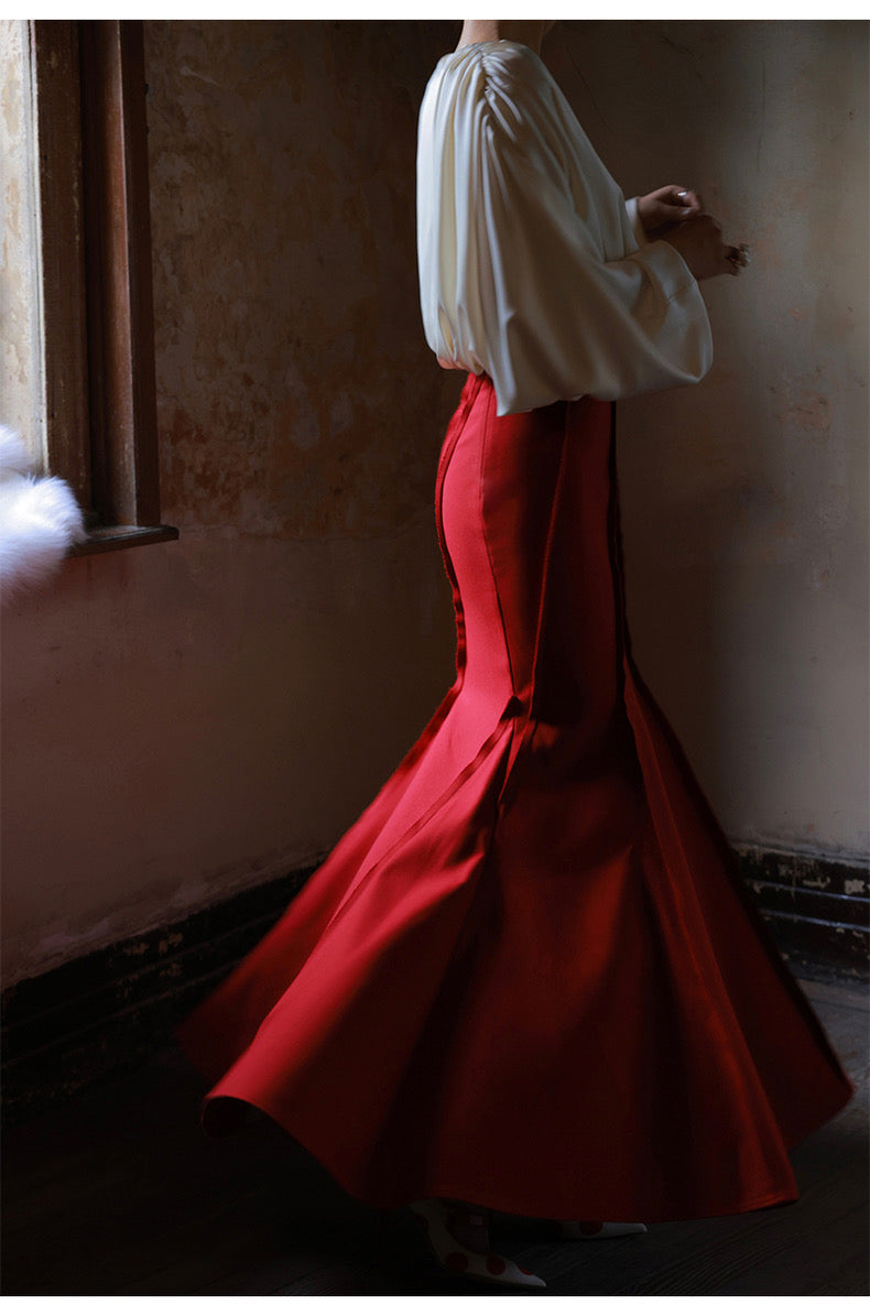 The proportion of the skirt length highlights the beauty of the waist and hip lines, extending the elegance below the waist, visually elongating the proportions of the legs. The rich and romantic cinnabar red creates a dignified and elegant temperament. The cool and elegant green tile gray creates a high-end and generous look.