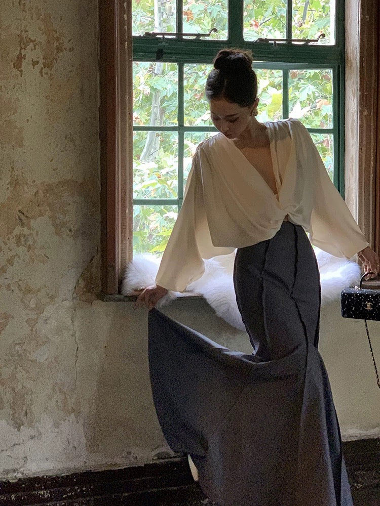 The suit material with good texture is selected, the surface shows the texture of yarn, the texture is high-end, and the drape is good. The whole piece is sticky and plain with exquisite tailoring to ensure the wideness of the skirt. The color is a traditional color with artistic conception.