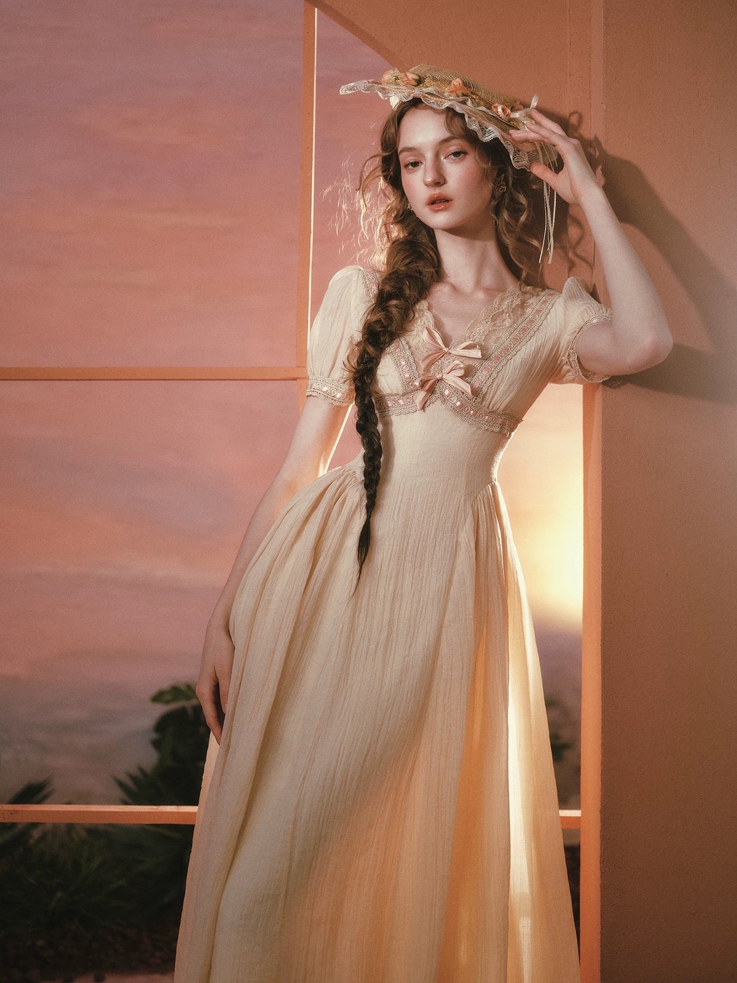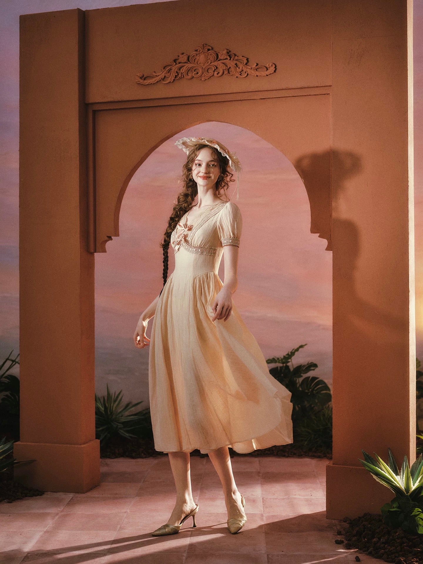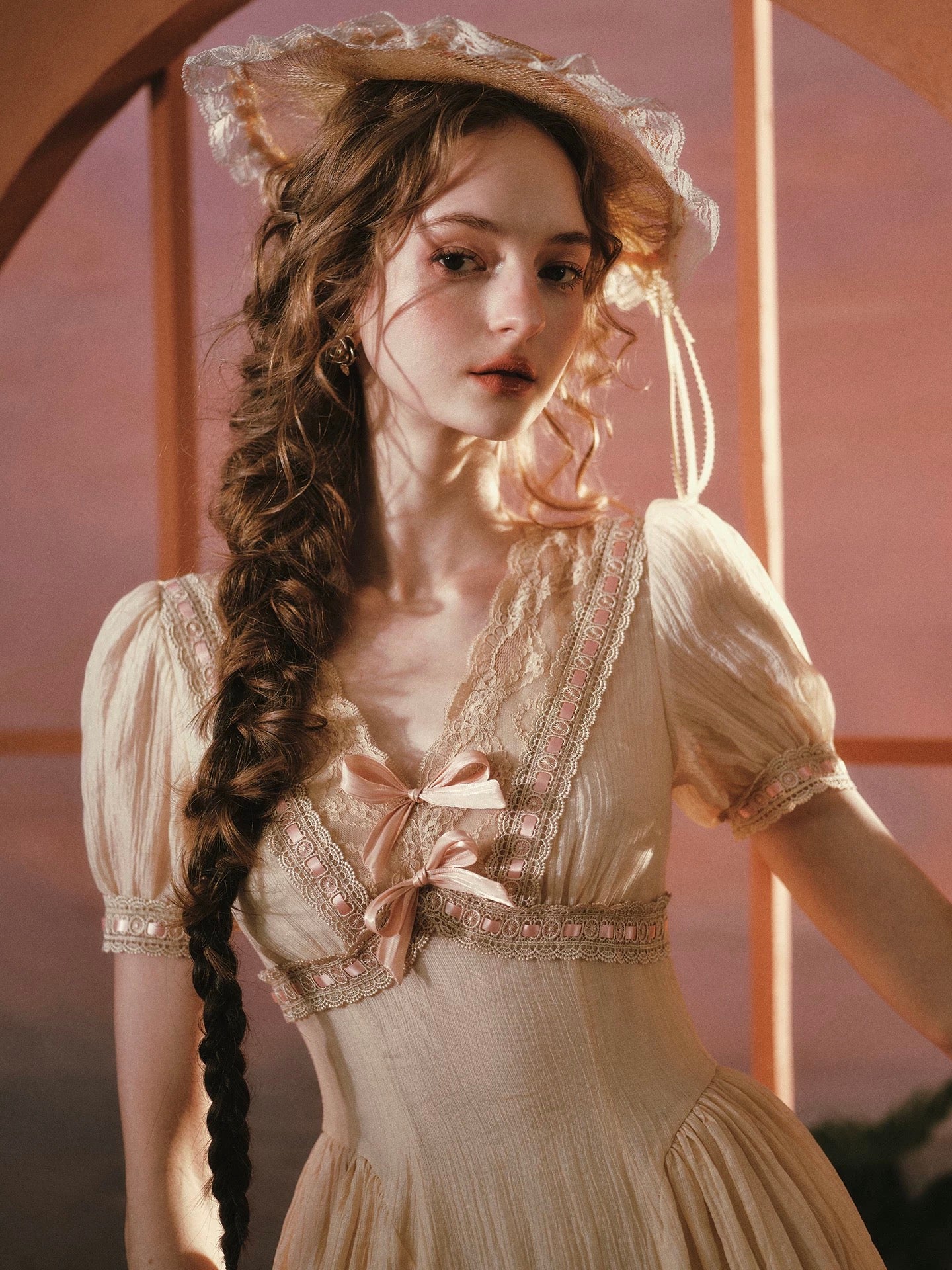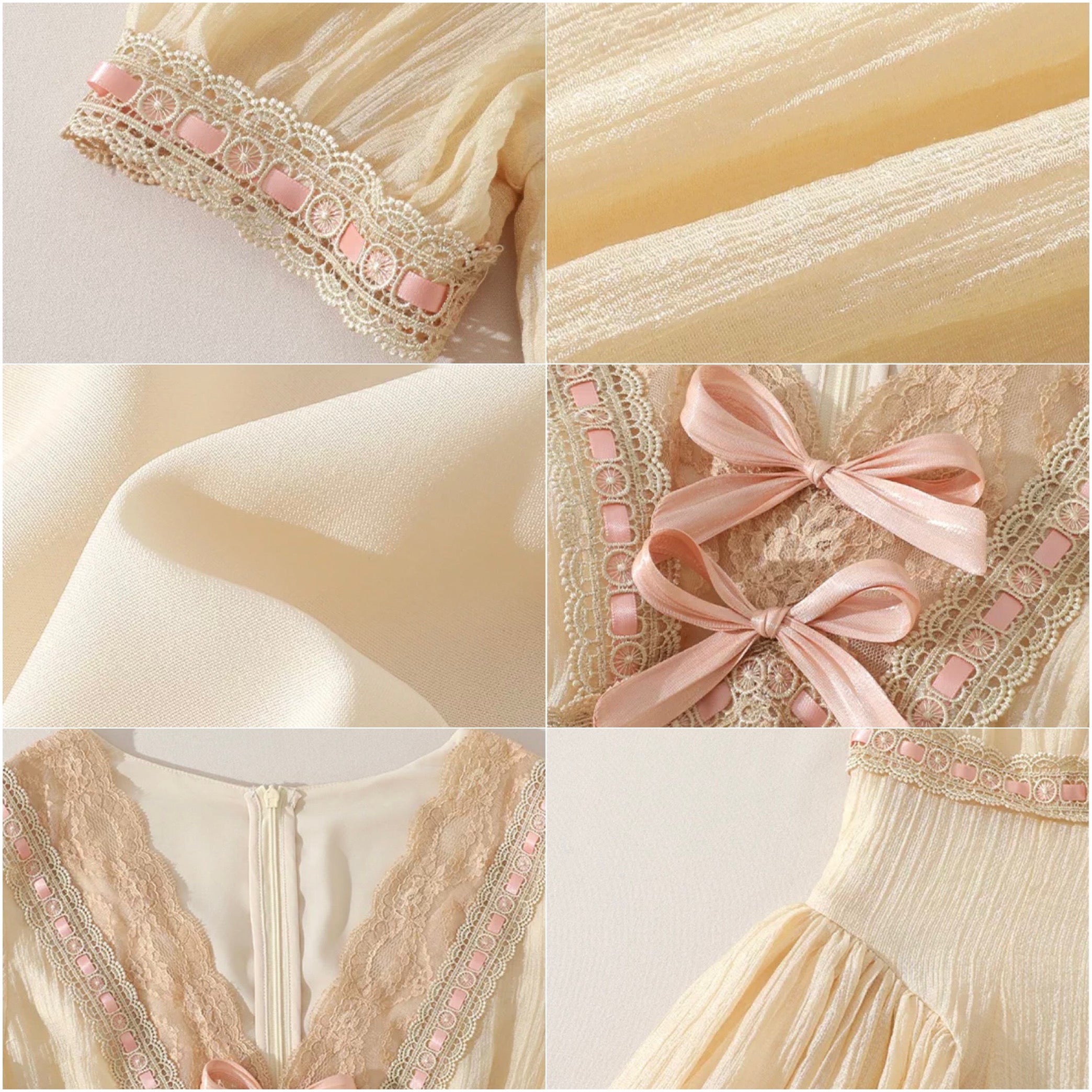 Our lace-edged puff sleeves are finished with woven ribbon detailing for an extra touch of charm, and the twin bows at the bust? Just enough sweetness without ever feeling overdone. It’s feminine, polished, and quietly captivating.