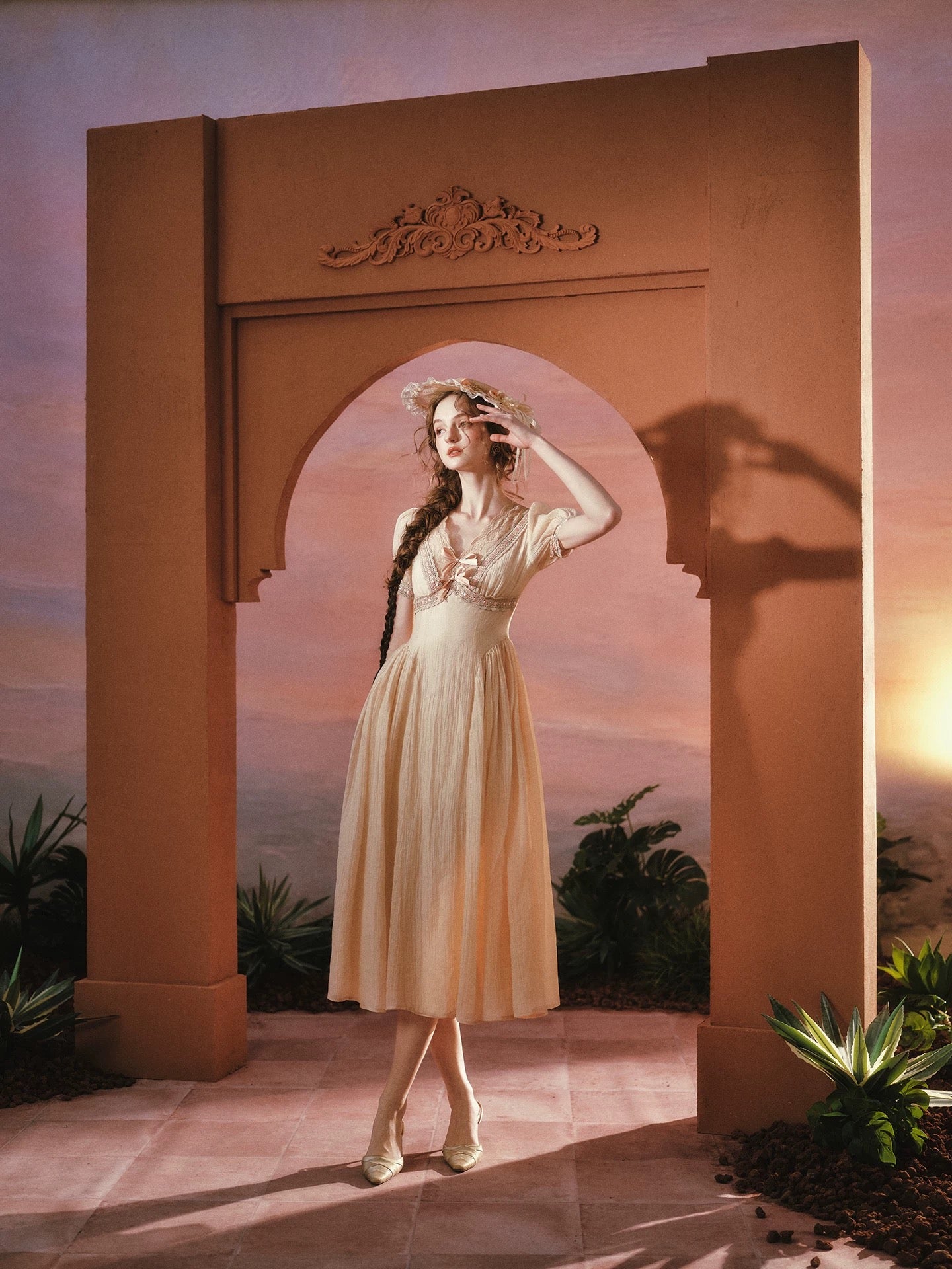 We designed ‘Petaline’ in a breathable viscose blend that drapes beautifully and moves with you, while the lightweight lining keeps everything smooth and comfortable against the skin. You’ll notice the delicate V neckline first, framed with layered lace trims that softly define the collarbone and add that romantic, vintage feel we love.