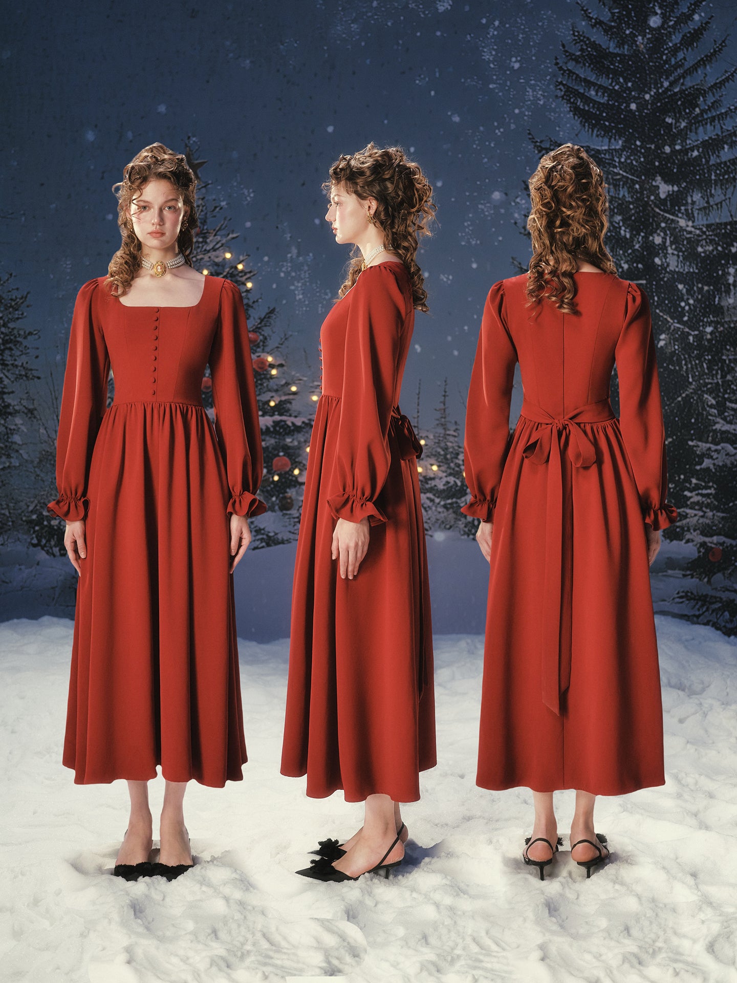 The gently gathered high waist is shaped with hidden darts for a neat nip without restriction, then spills into a full midi skirt that floats as you walk and skims rather than clings – so flattering, right? Bishop sleeves puff softly at the shoulder, taper into romantic ruffle cuffs, and finish with tiny tonal buttons for an extra hint of drama.