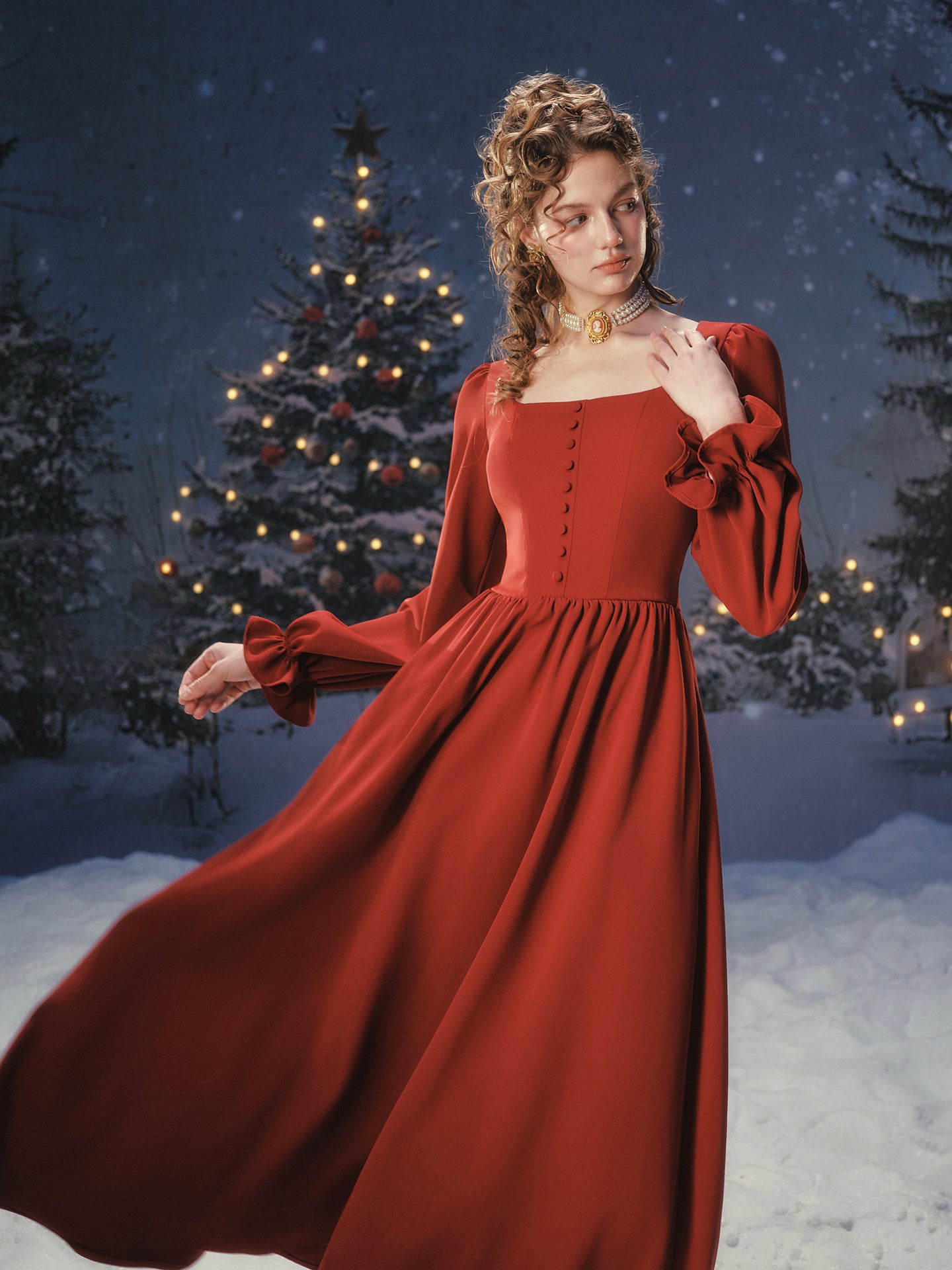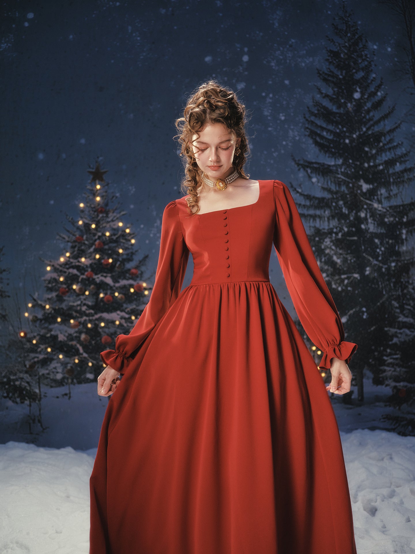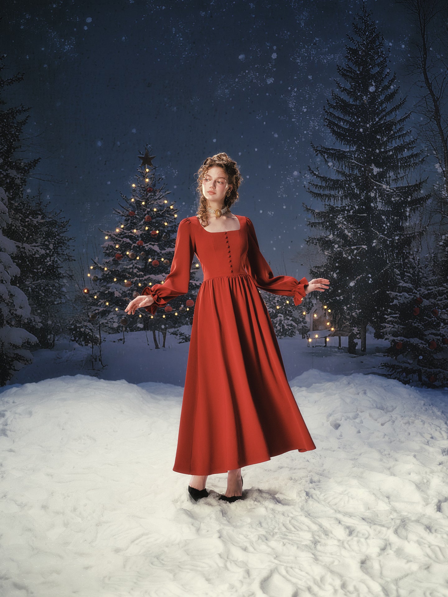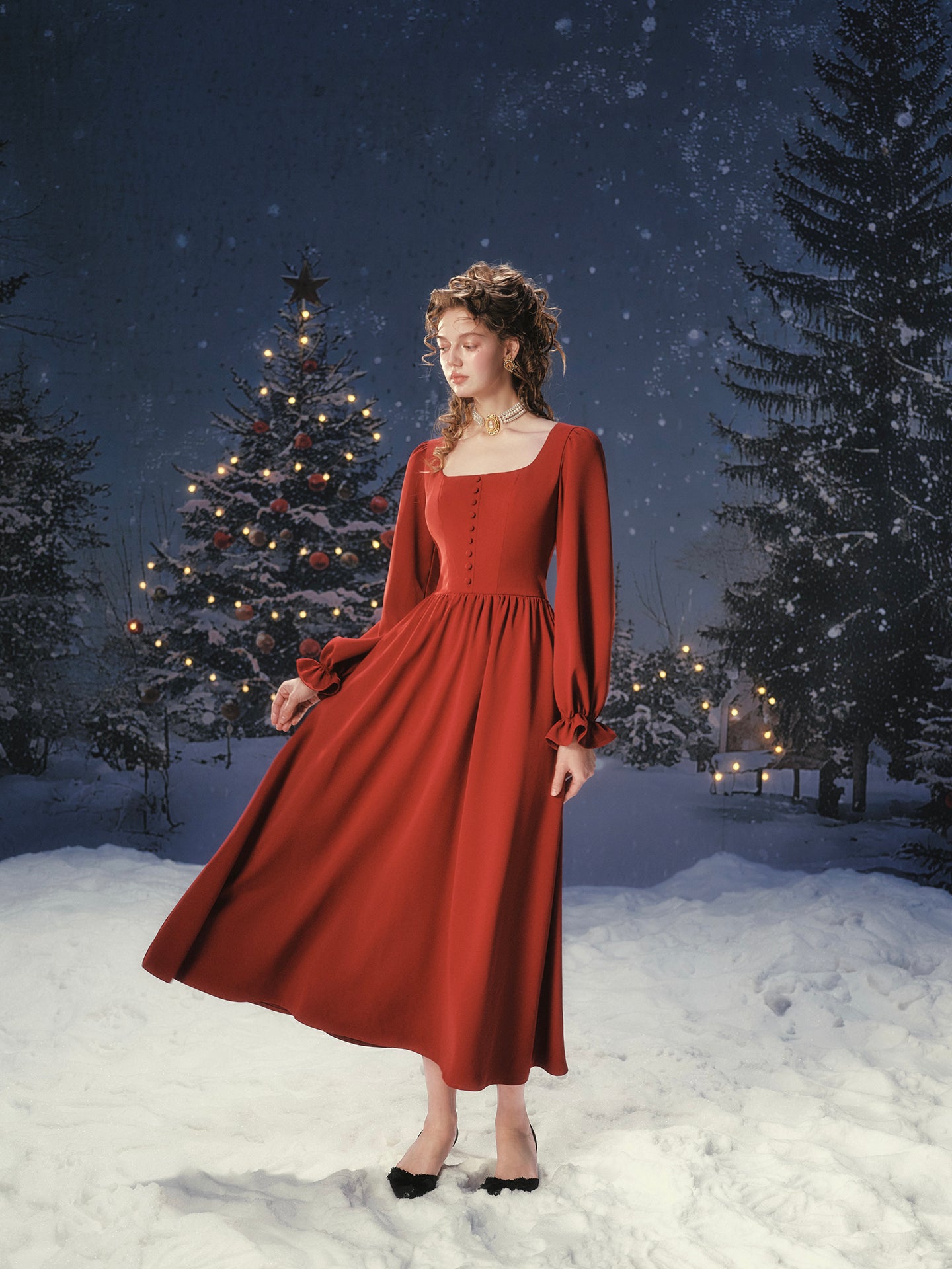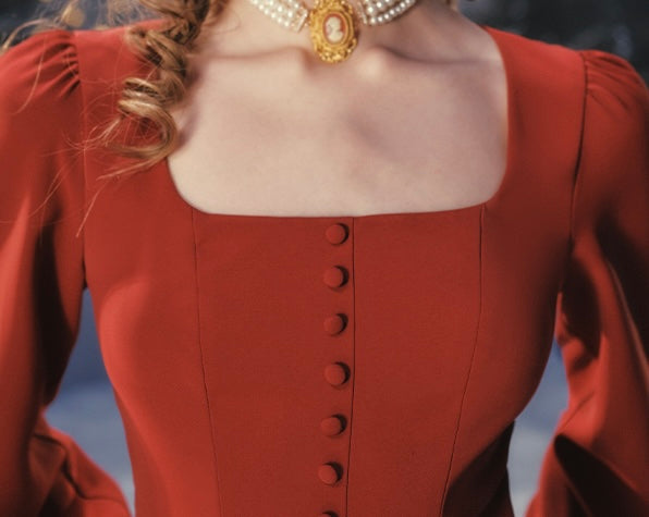 We chose a fluid, 100 % woven poly with a satin-matte finish – the drape is buttery, the colour lush, and thanks to a matching lining you never need worry about show-through. A square neckline frames the collarbones in the prettiest way, while a row of self-covered buttons trails down the bodice like little drops of mulled wine.