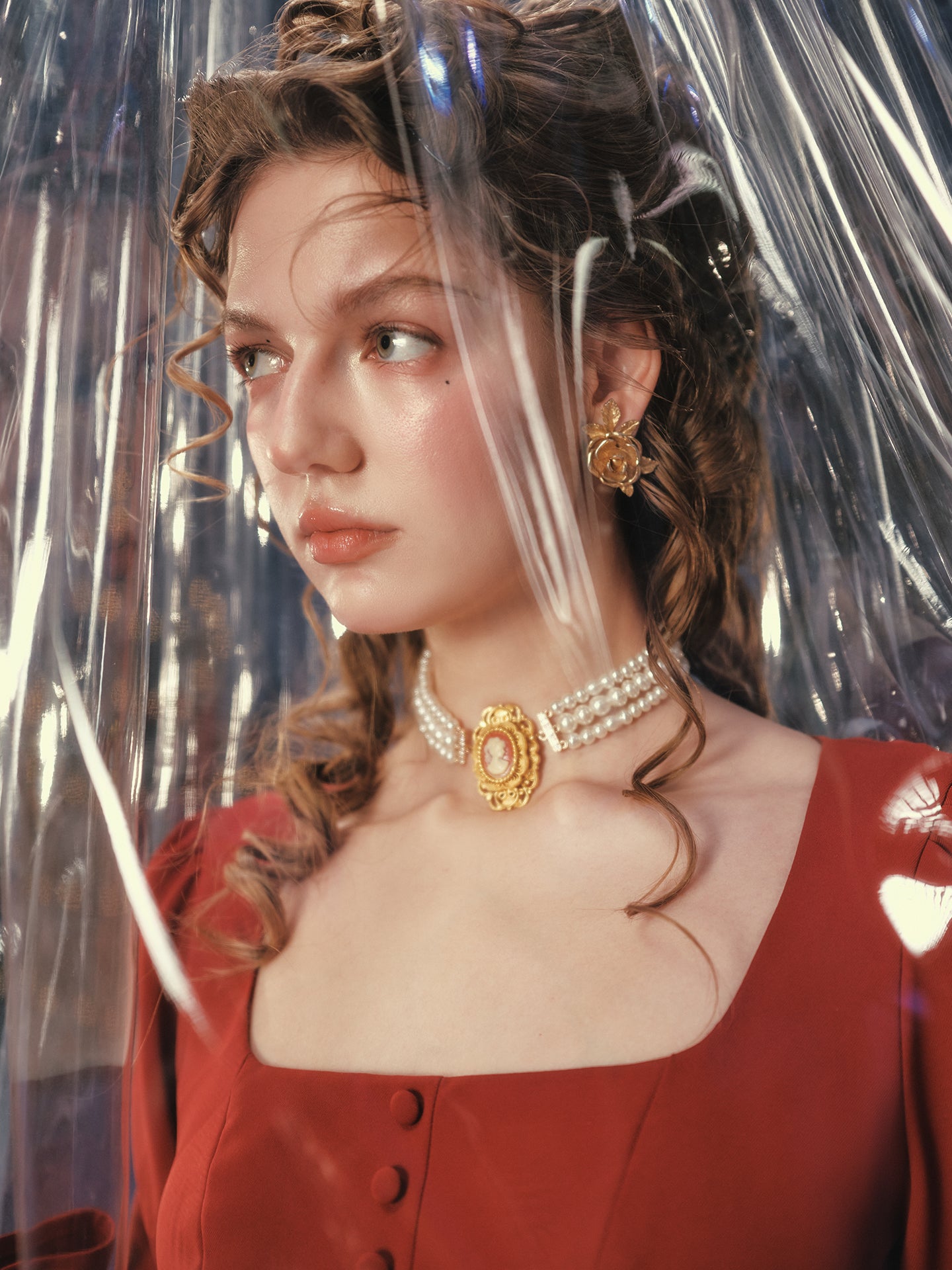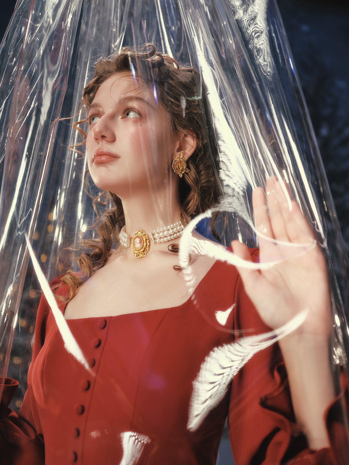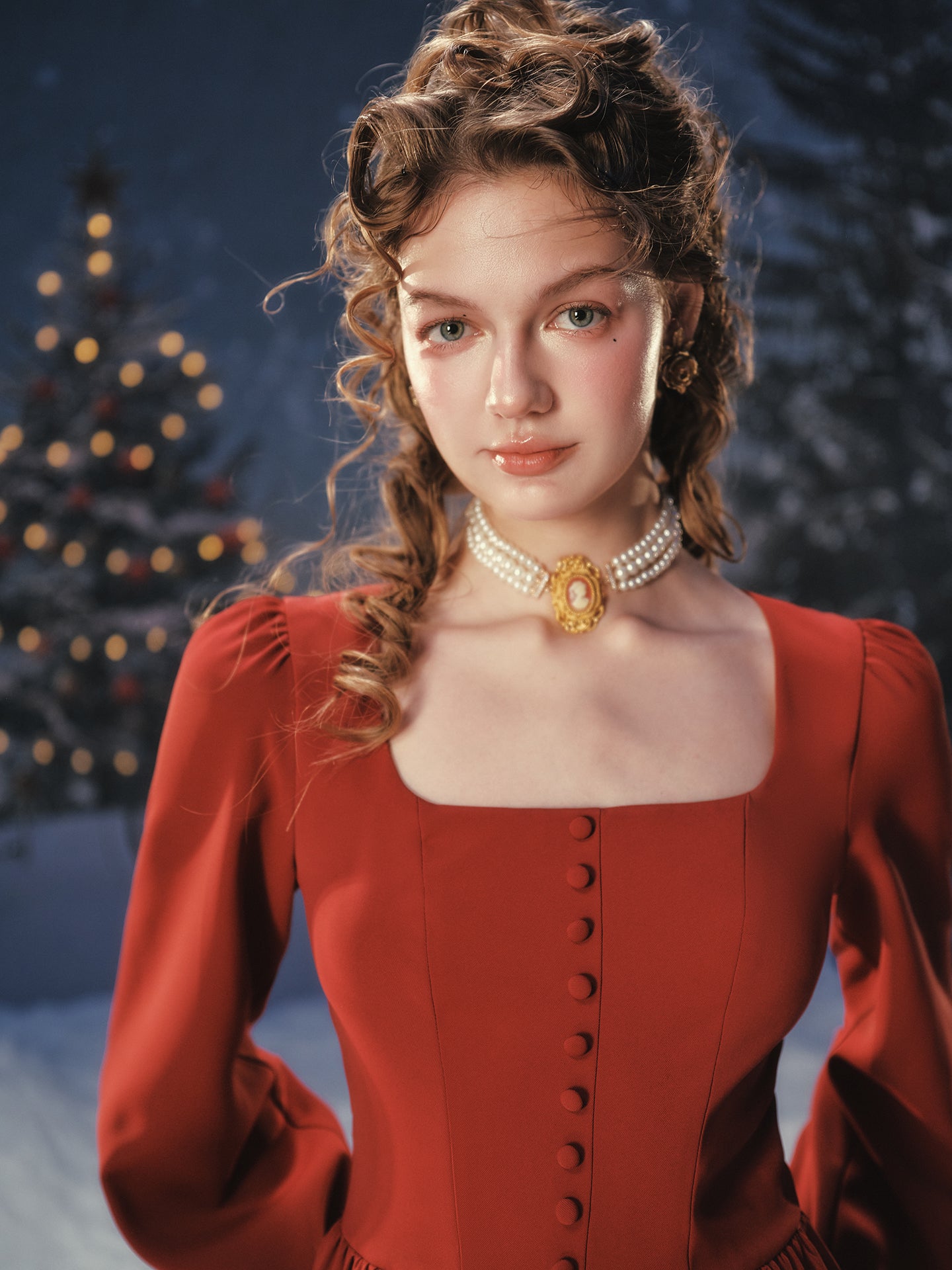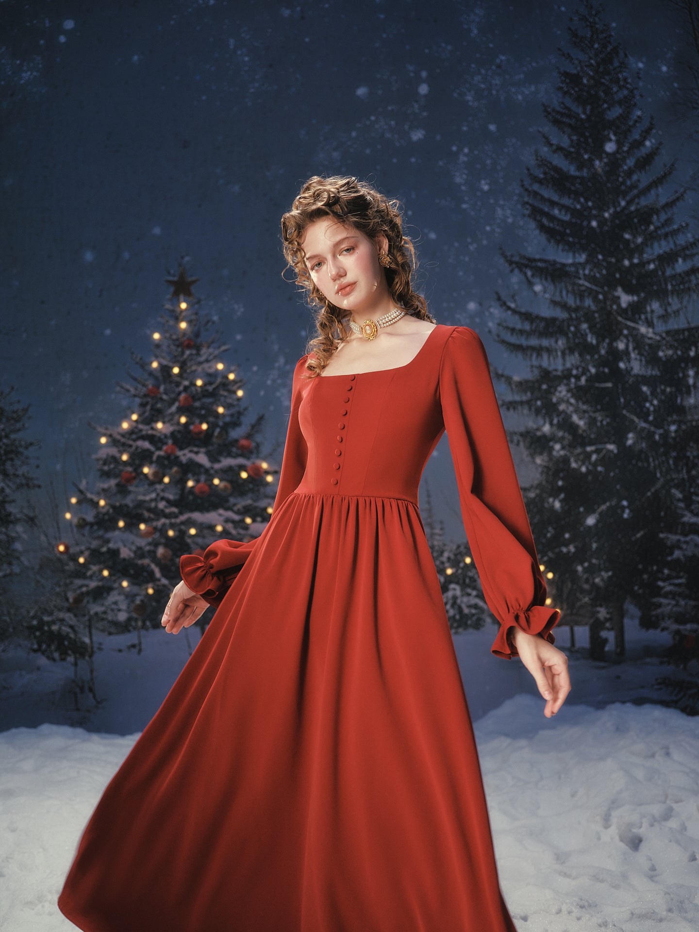 We chose a fluid, 100 % woven poly with a satin-matte finish – the drape is buttery, the colour lush, and thanks to a matching lining you never need worry about show-through. A square neckline frames the collarbones in the prettiest way, while a row of self-covered buttons trails down the bodice like little drops of mulled wine.